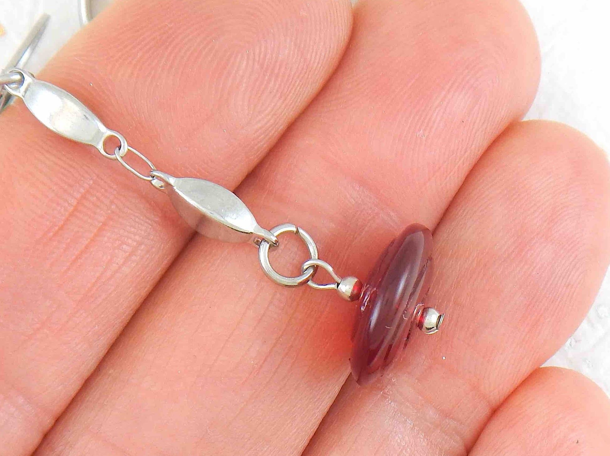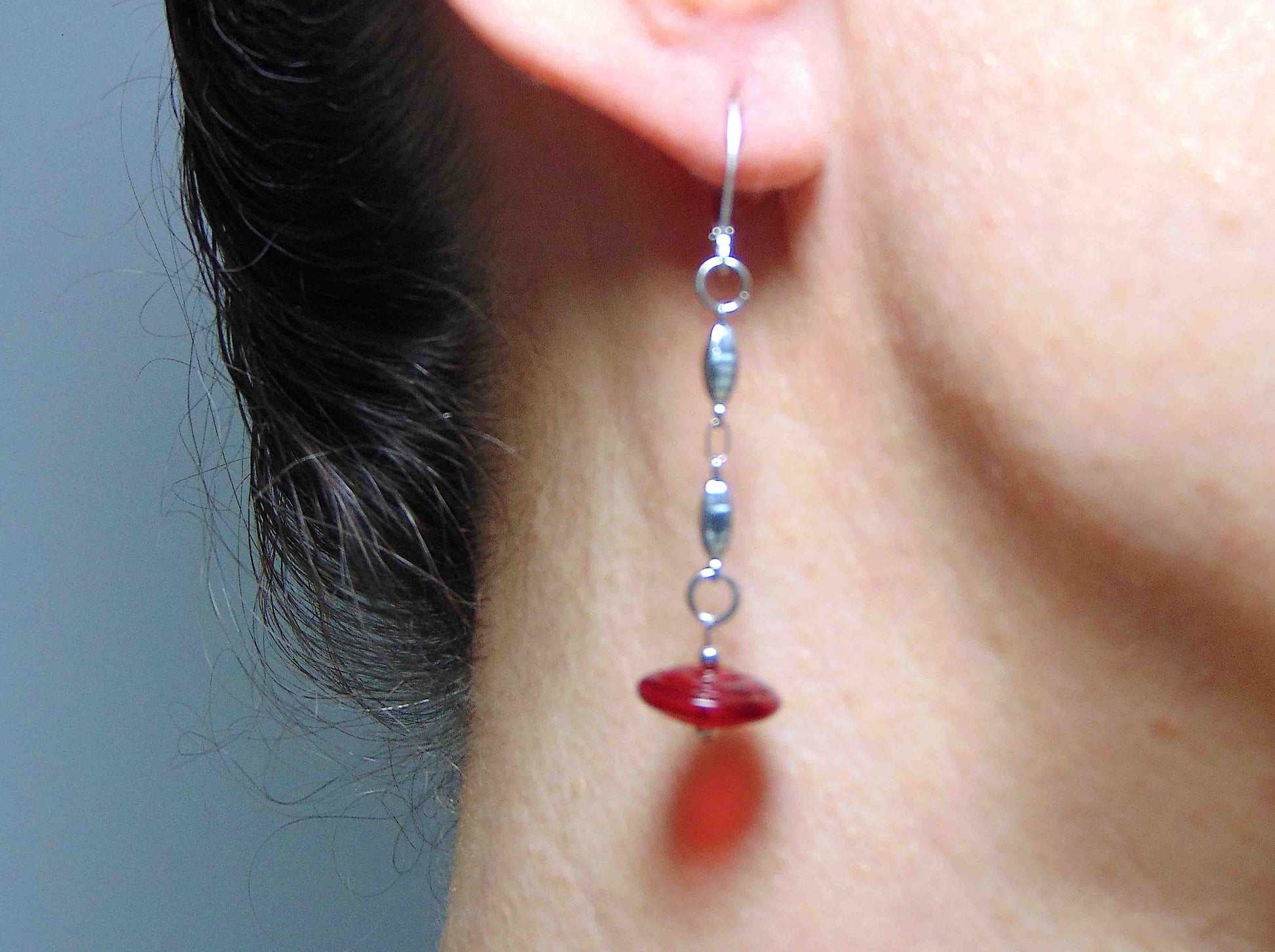 Long earrings with deep red translucent glass disks on stainless steel box-shaped chain and lever back hooks