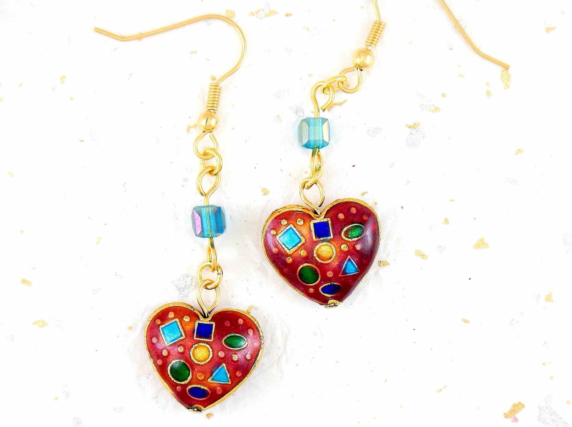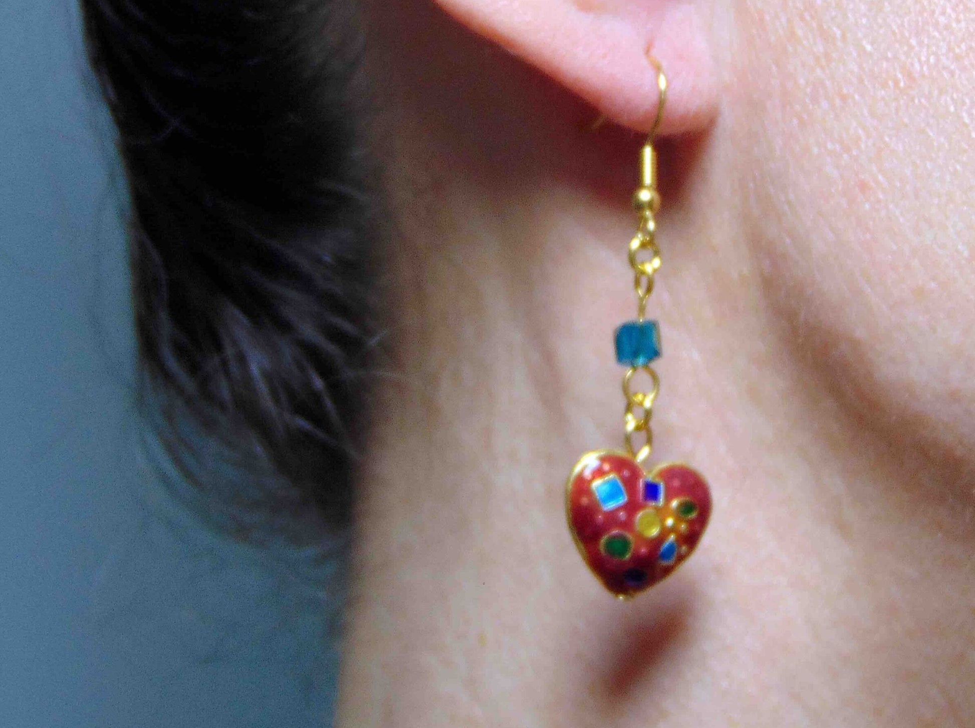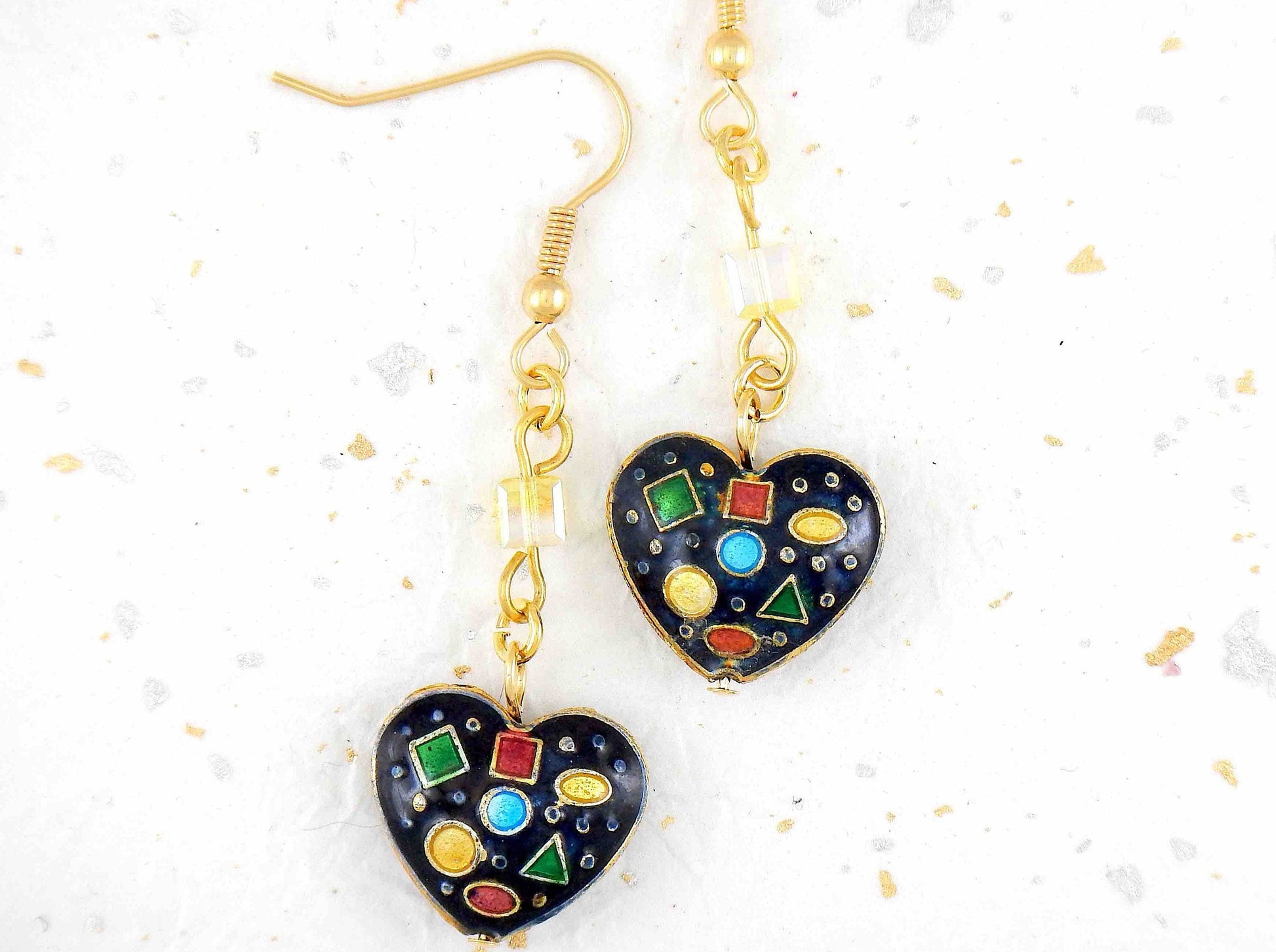 Long earrings with enamelled hearts in 3 colours (red, turquoise, black), geometric patterns, assorted Swarovski crystal cubes, gold-toned stainless steel hooks
