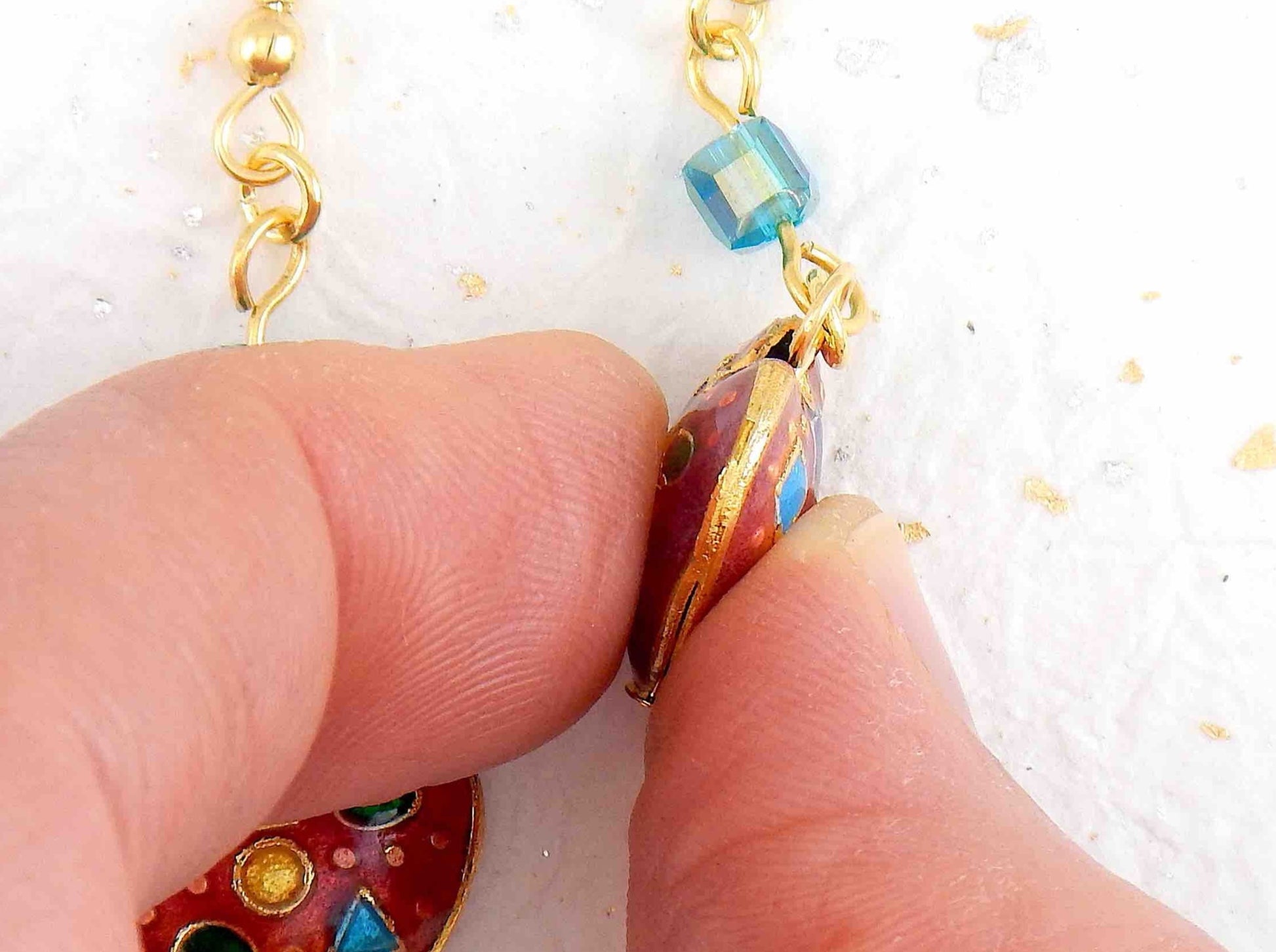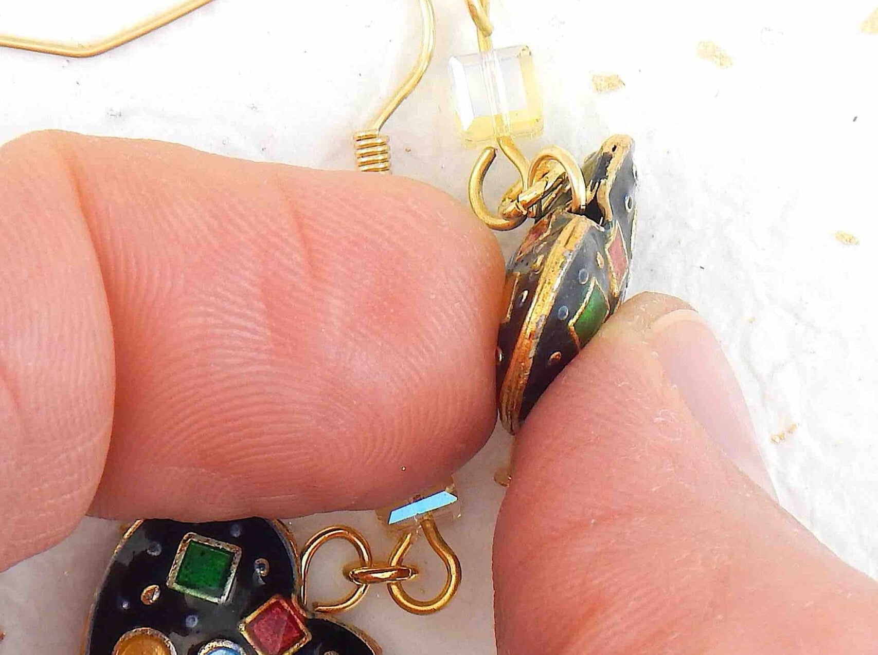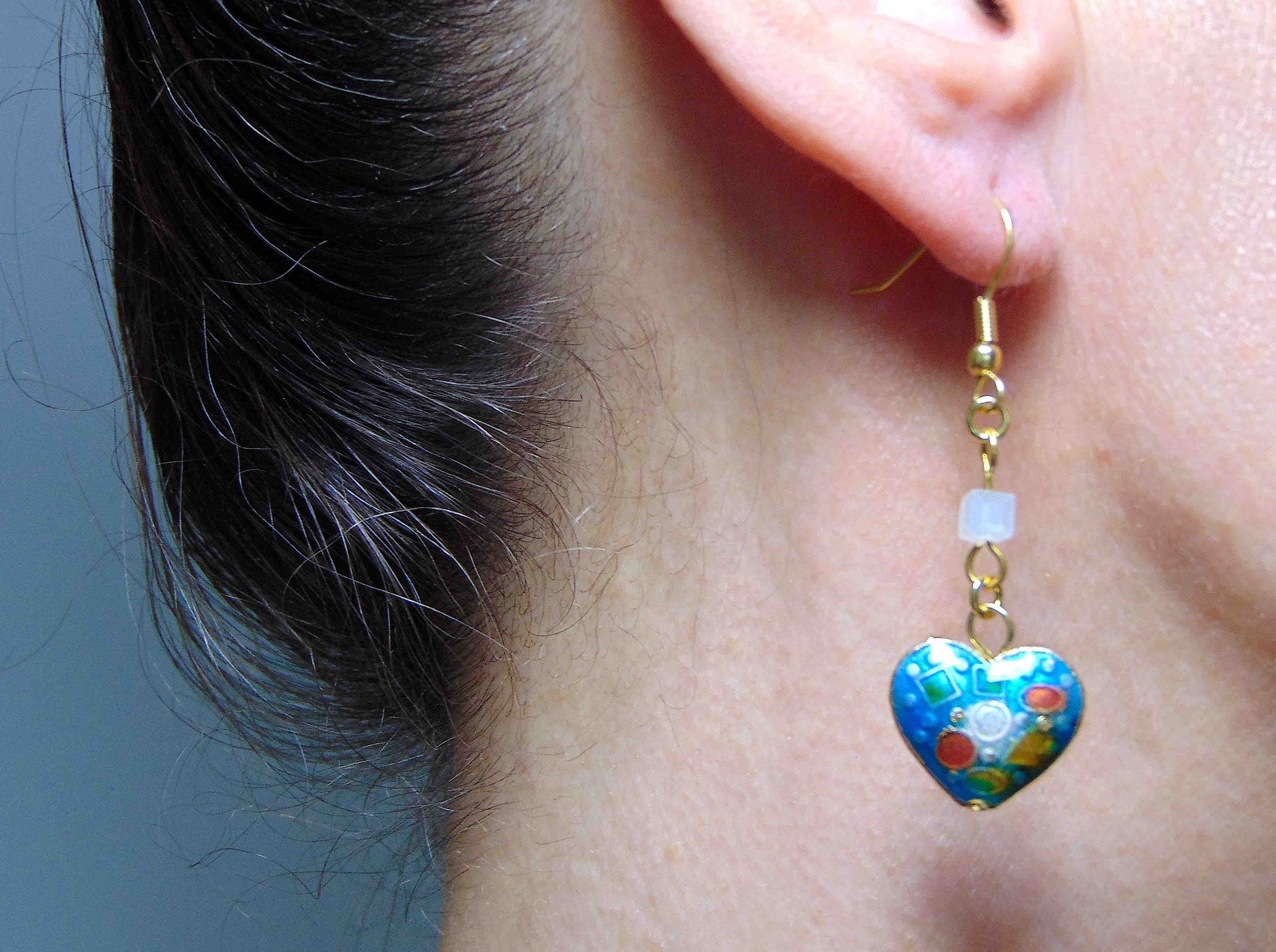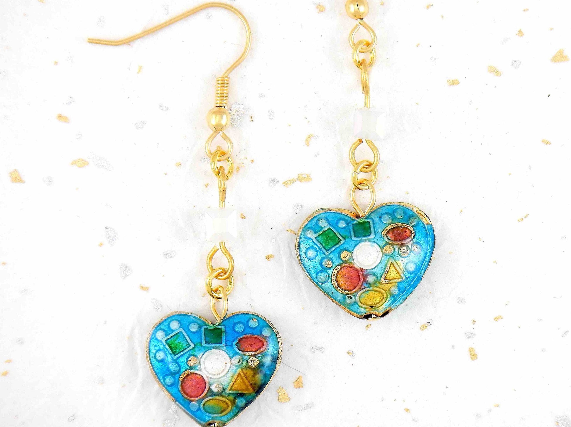 Long earrings with enamelled hearts in 3 colours (red, turquoise, black), geometric patterns, assorted Swarovski crystal cubes, gold-toned stainless steel hooks
