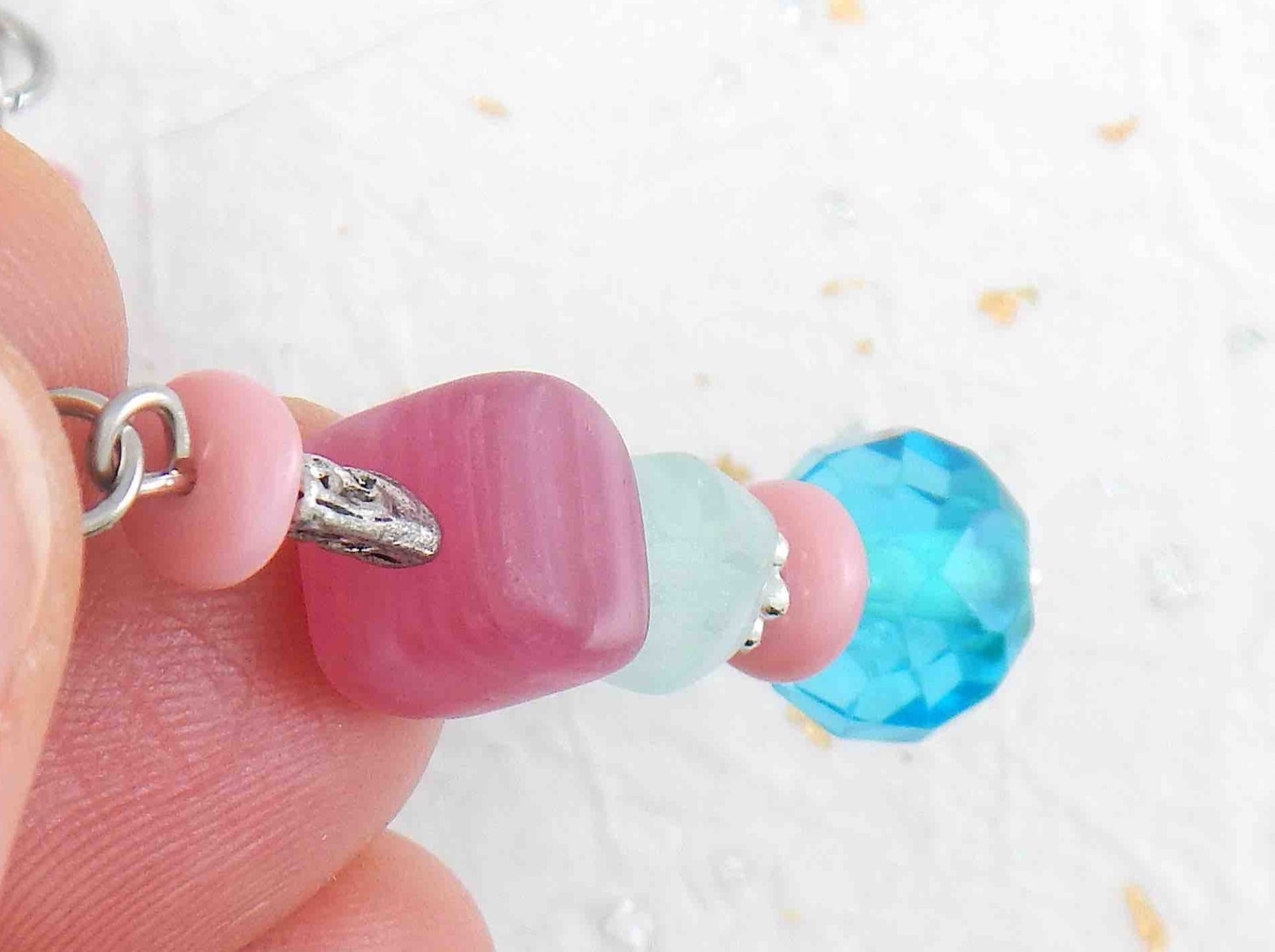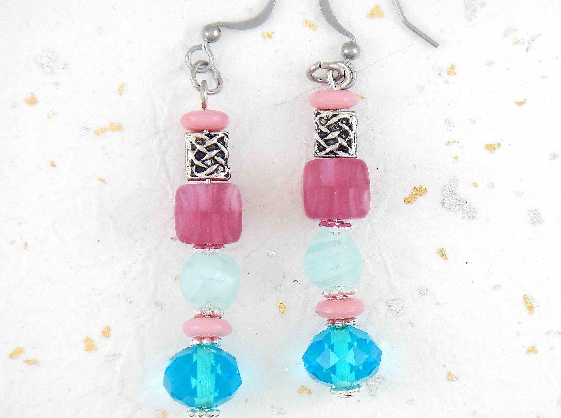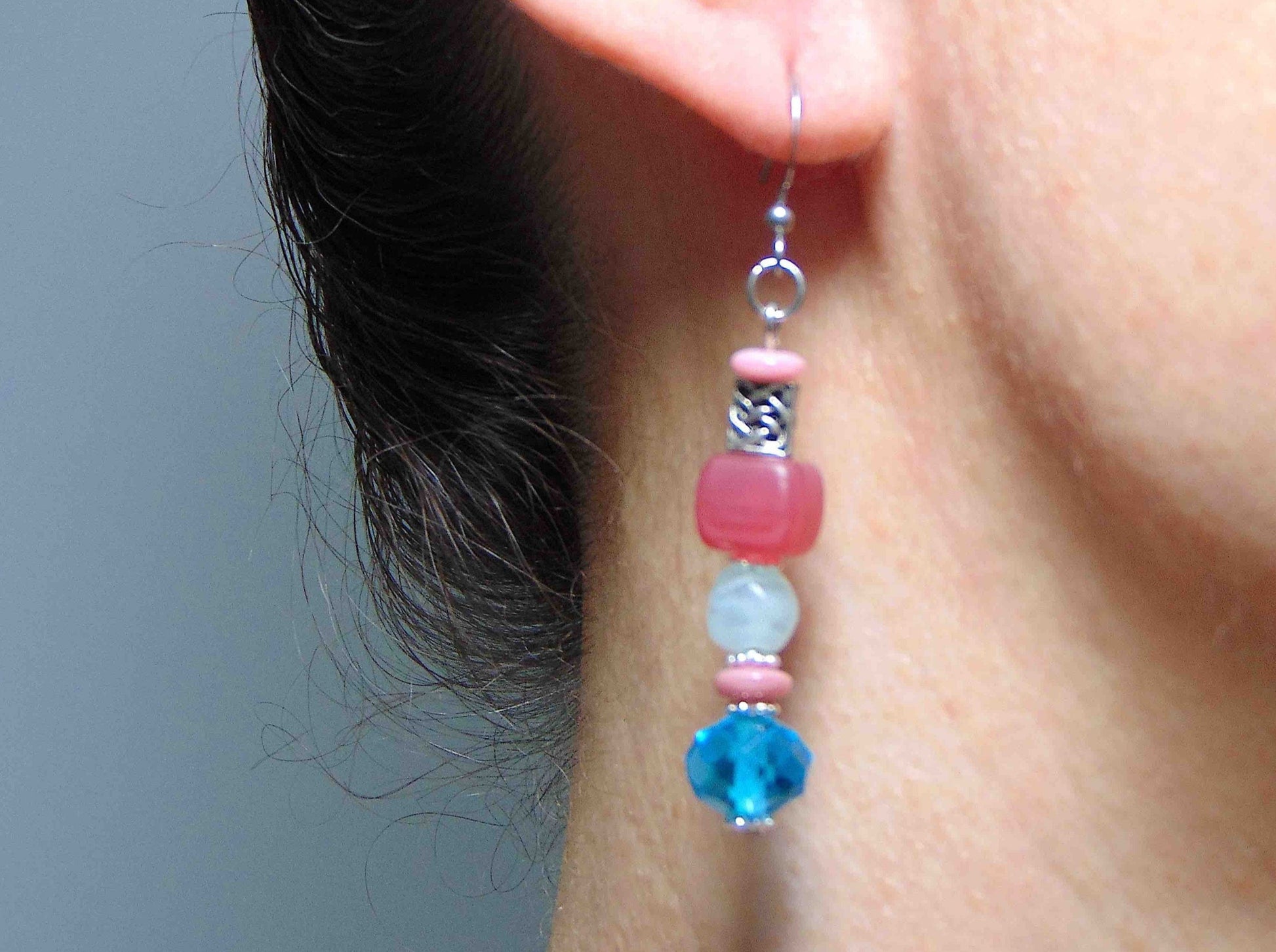 Long earrings with frosted pink cubes, frosted blue and faceted turquoise balls, stainless steel hooks