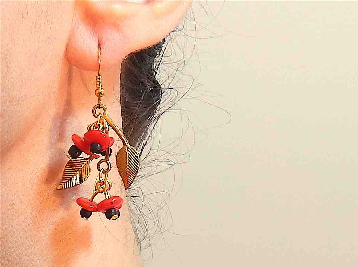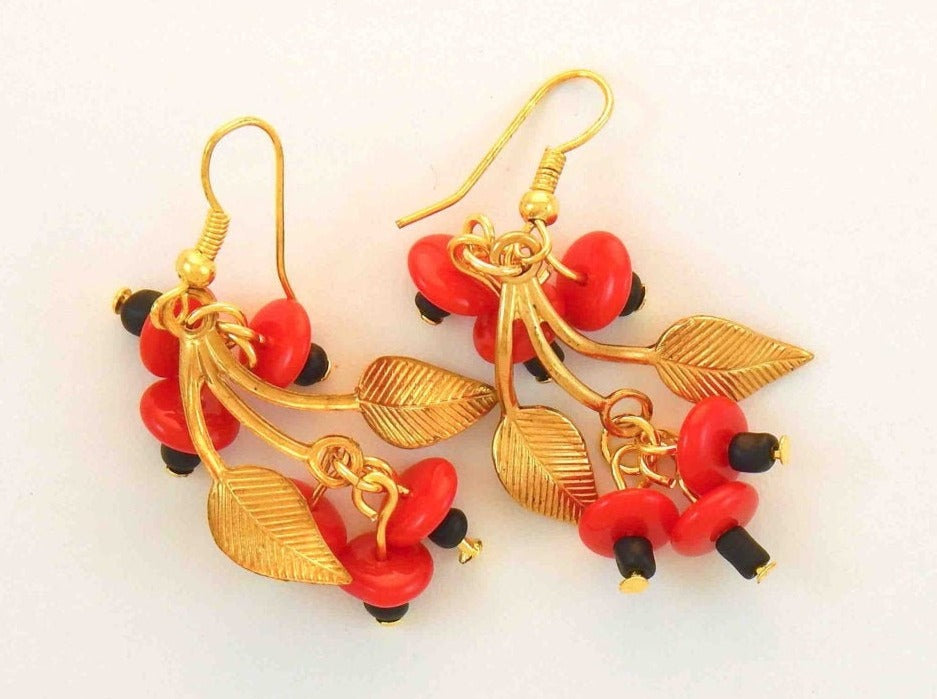 Long earrings with golden leaves and red glass fruits, metal hooks