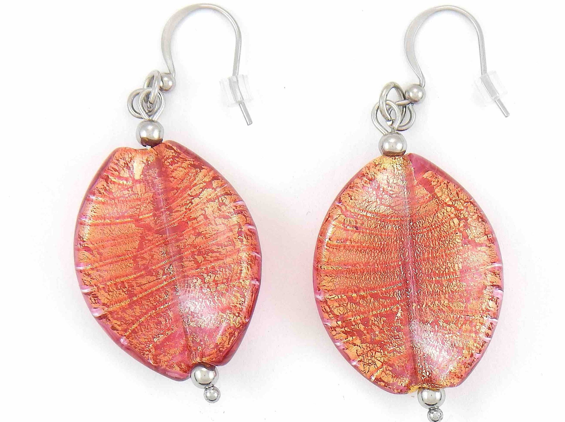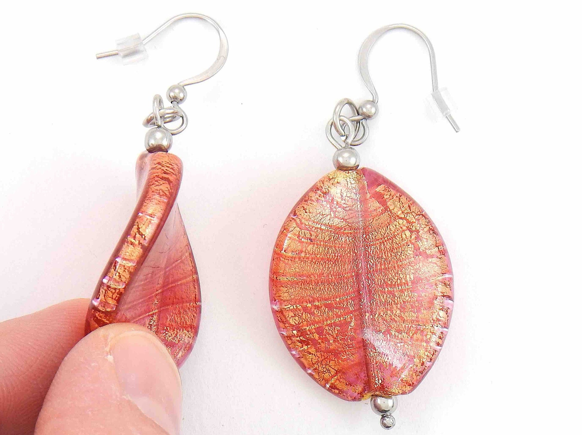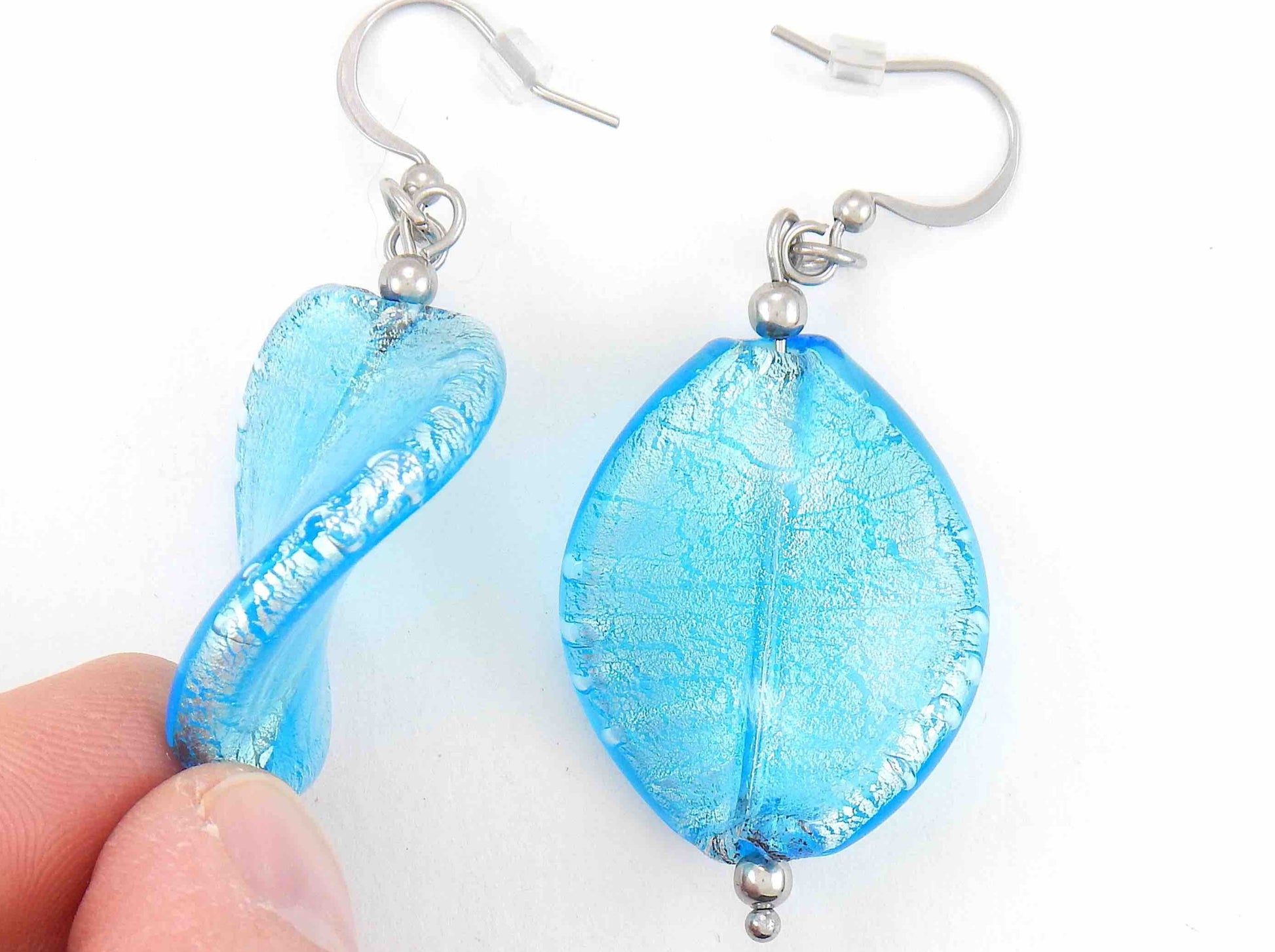 Long earrings with large Murano glass twists in 2 colours (turquoise, coral), silver or gold foil, stainless steel hooks