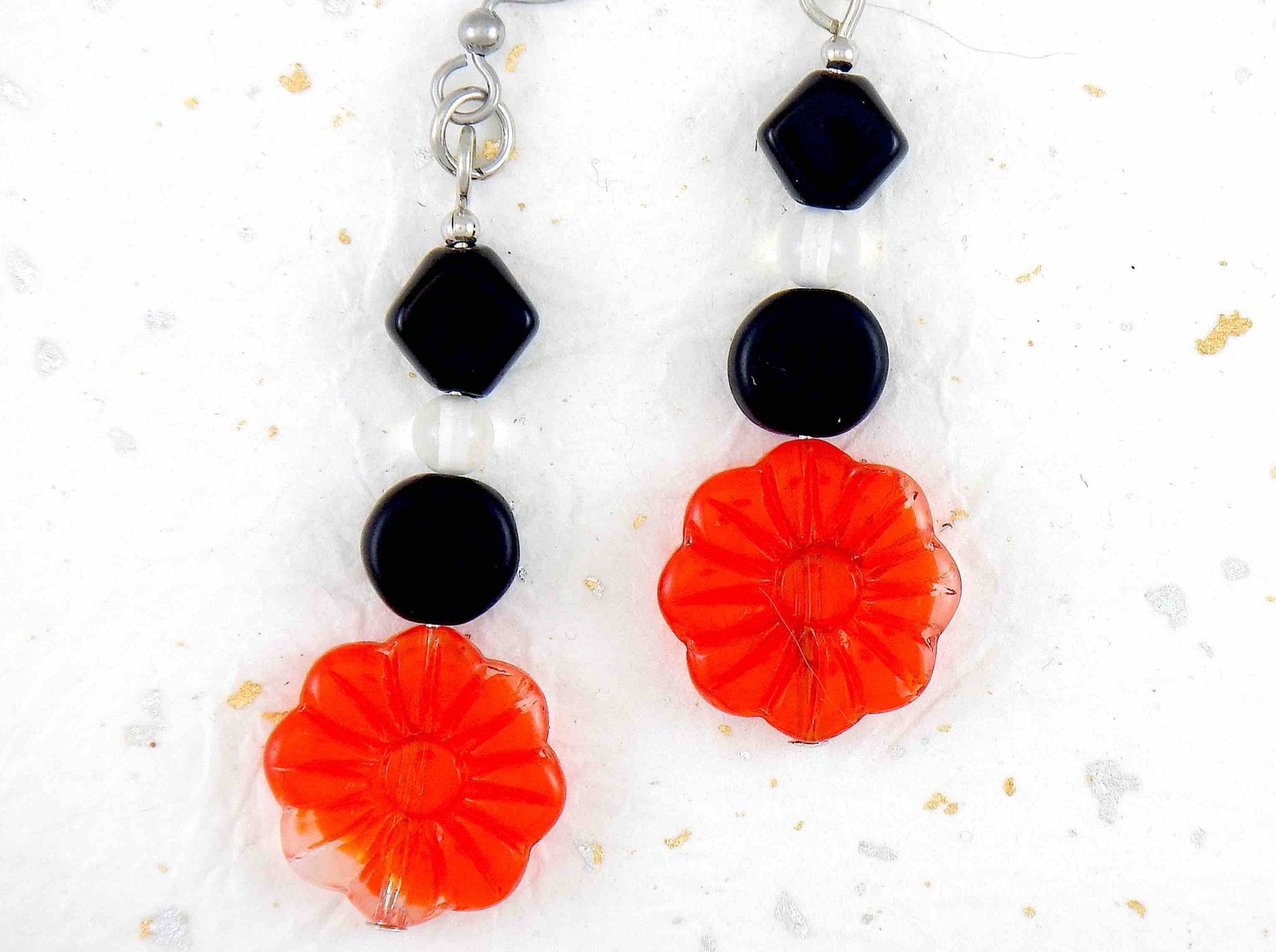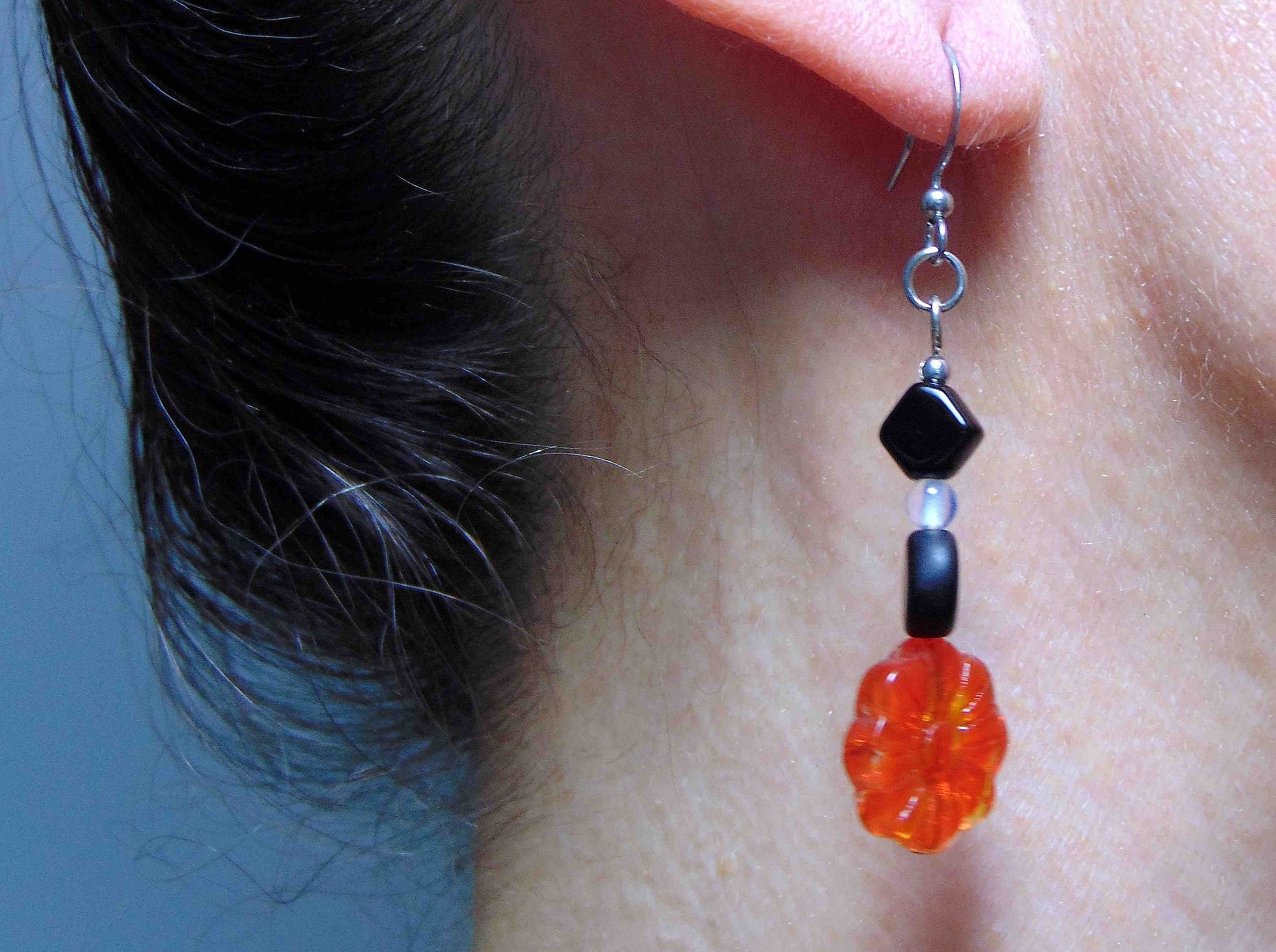 Long earrings with orange flowers, matte black pellets and shiny black lozenges, stainless steel hooks