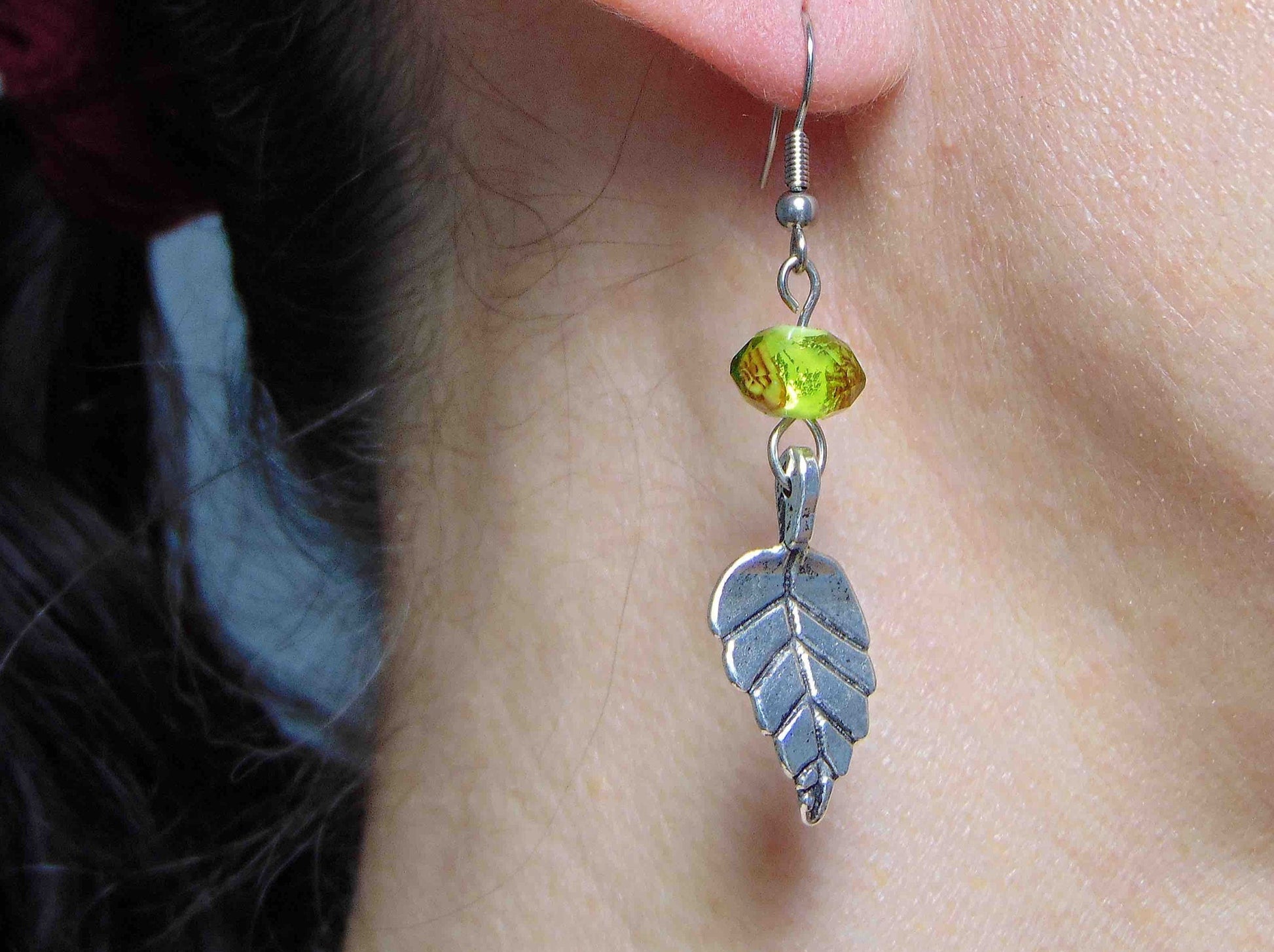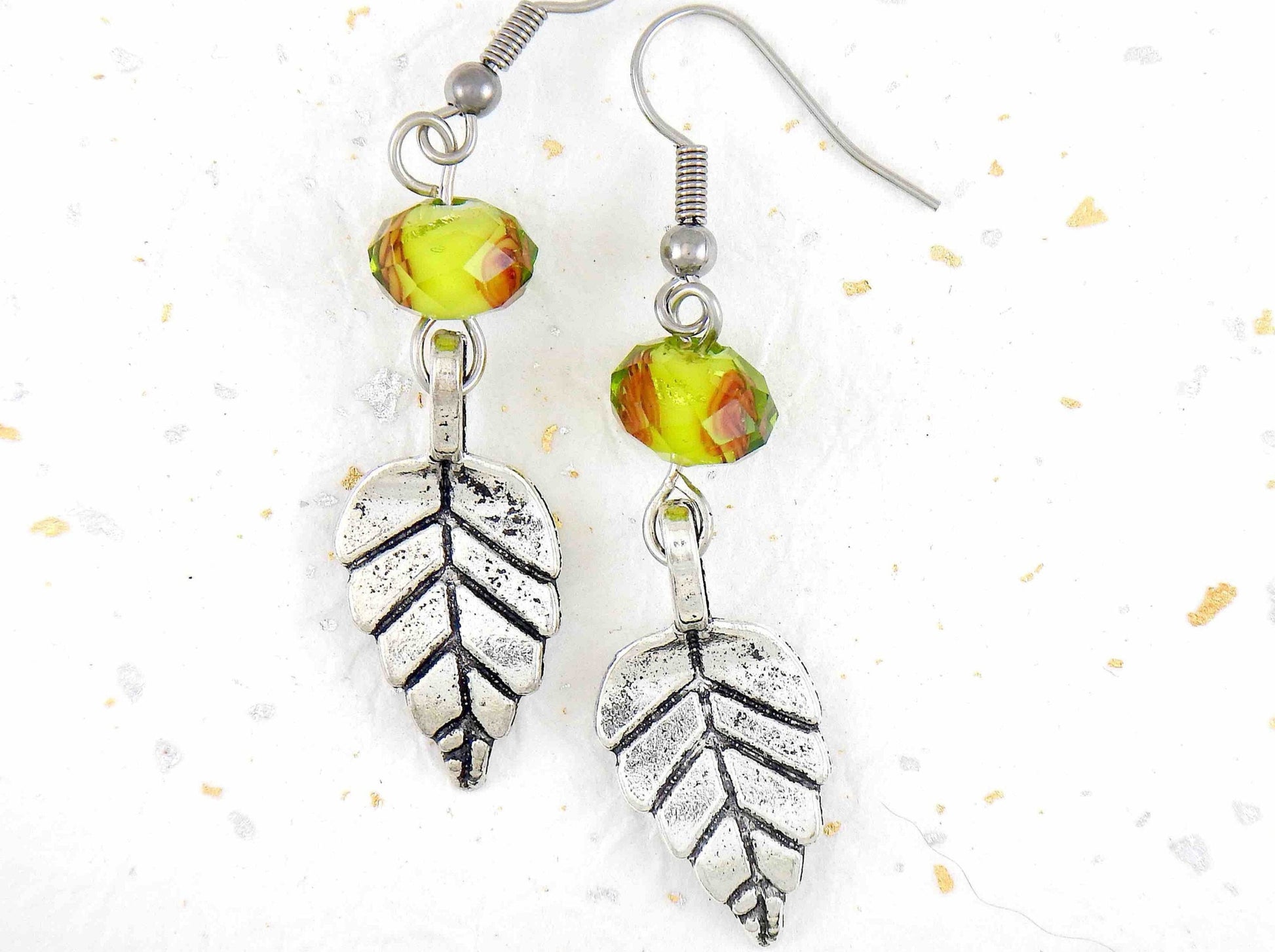 Long earrings with pewter leaves and lime green faceted crystal balls, tiny rose detail, stainless steel hooks