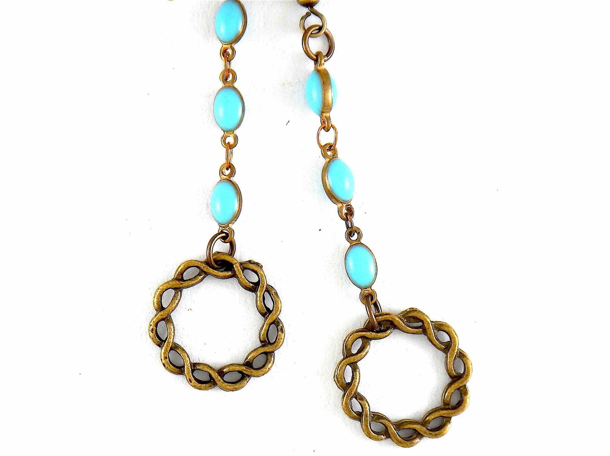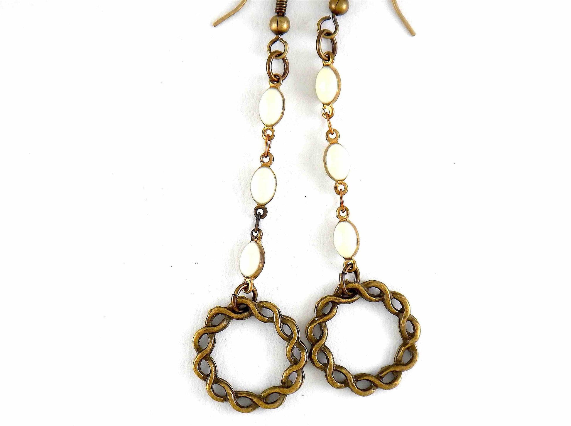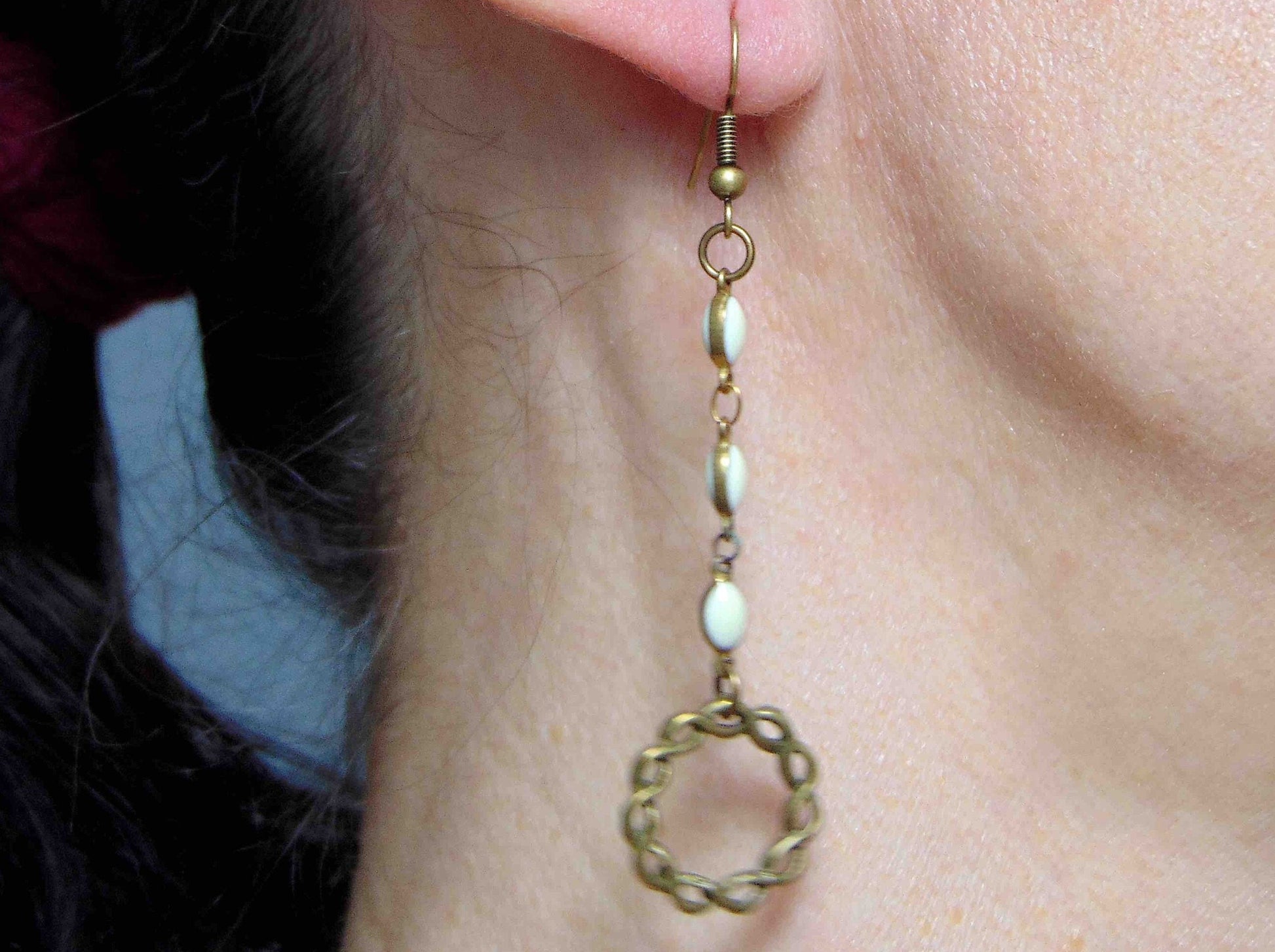 Long earrings with plaited brass rings and egg-shaped chain (off-white, black or turquoise), brass hooks