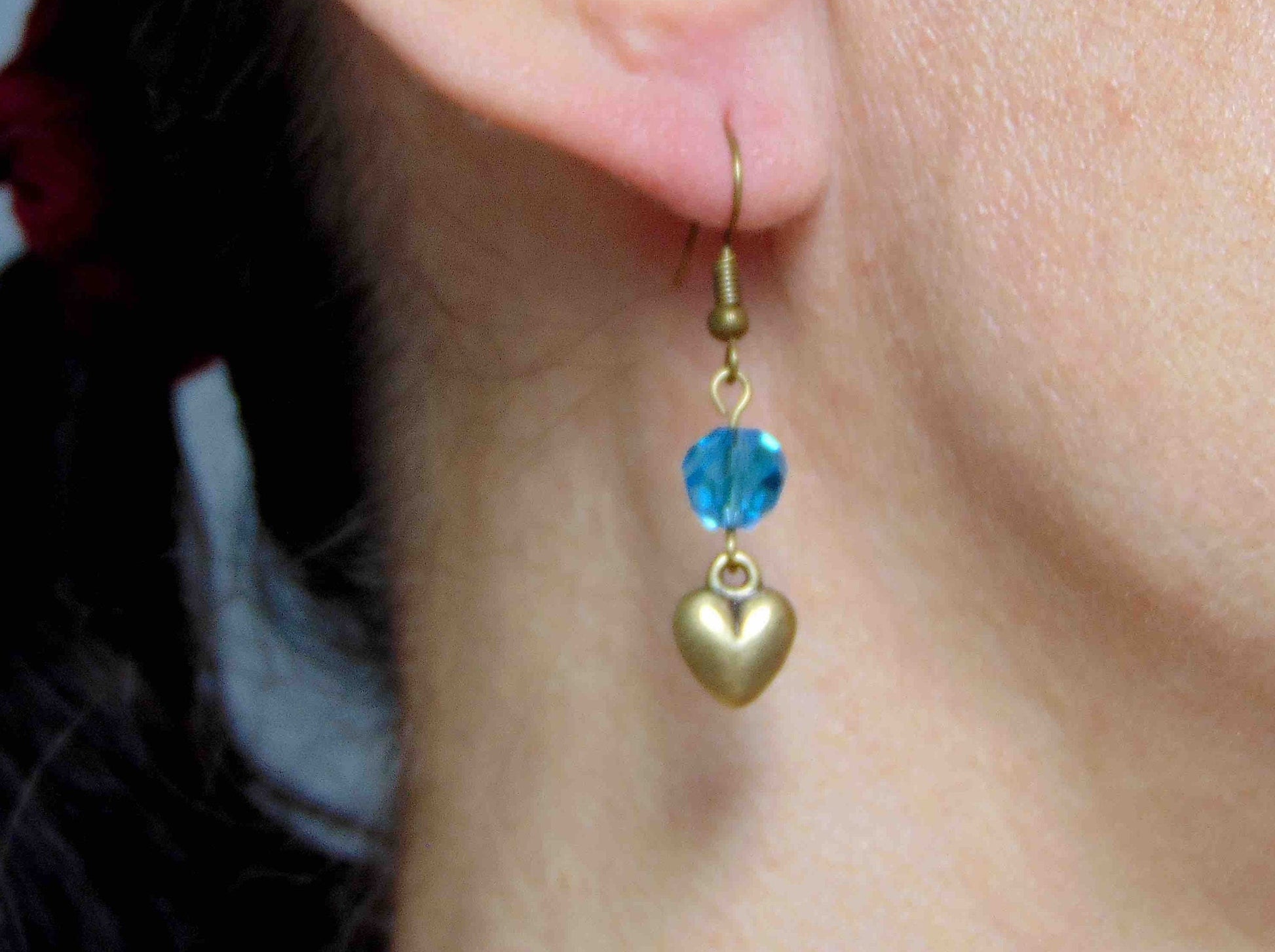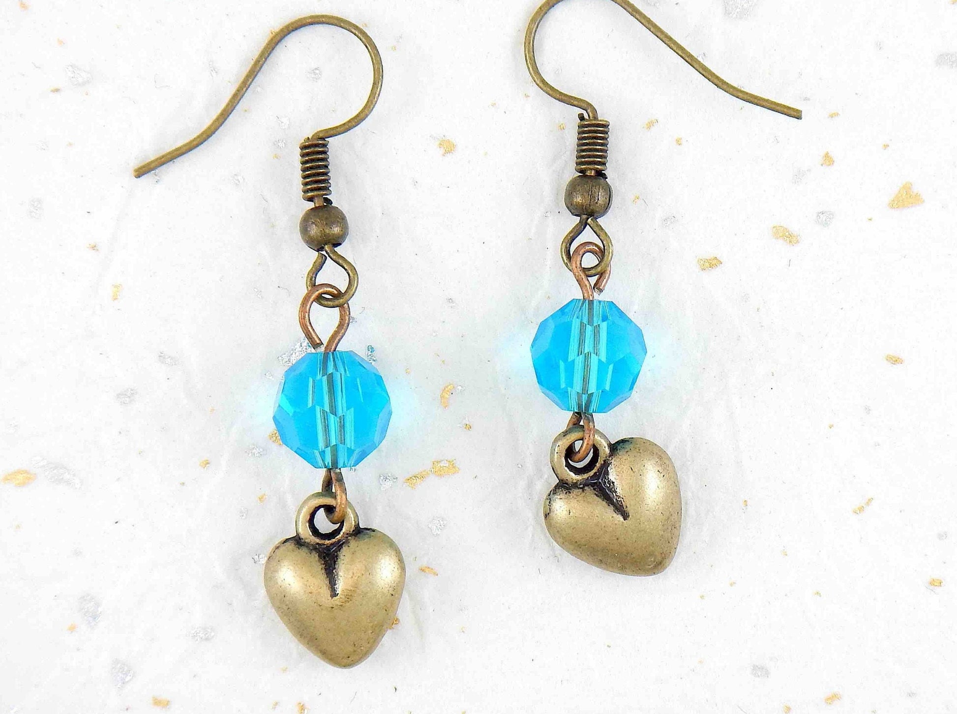 Long earrings with plump brass hearts and translucent turquoise faceted crystal balls, brass hooks