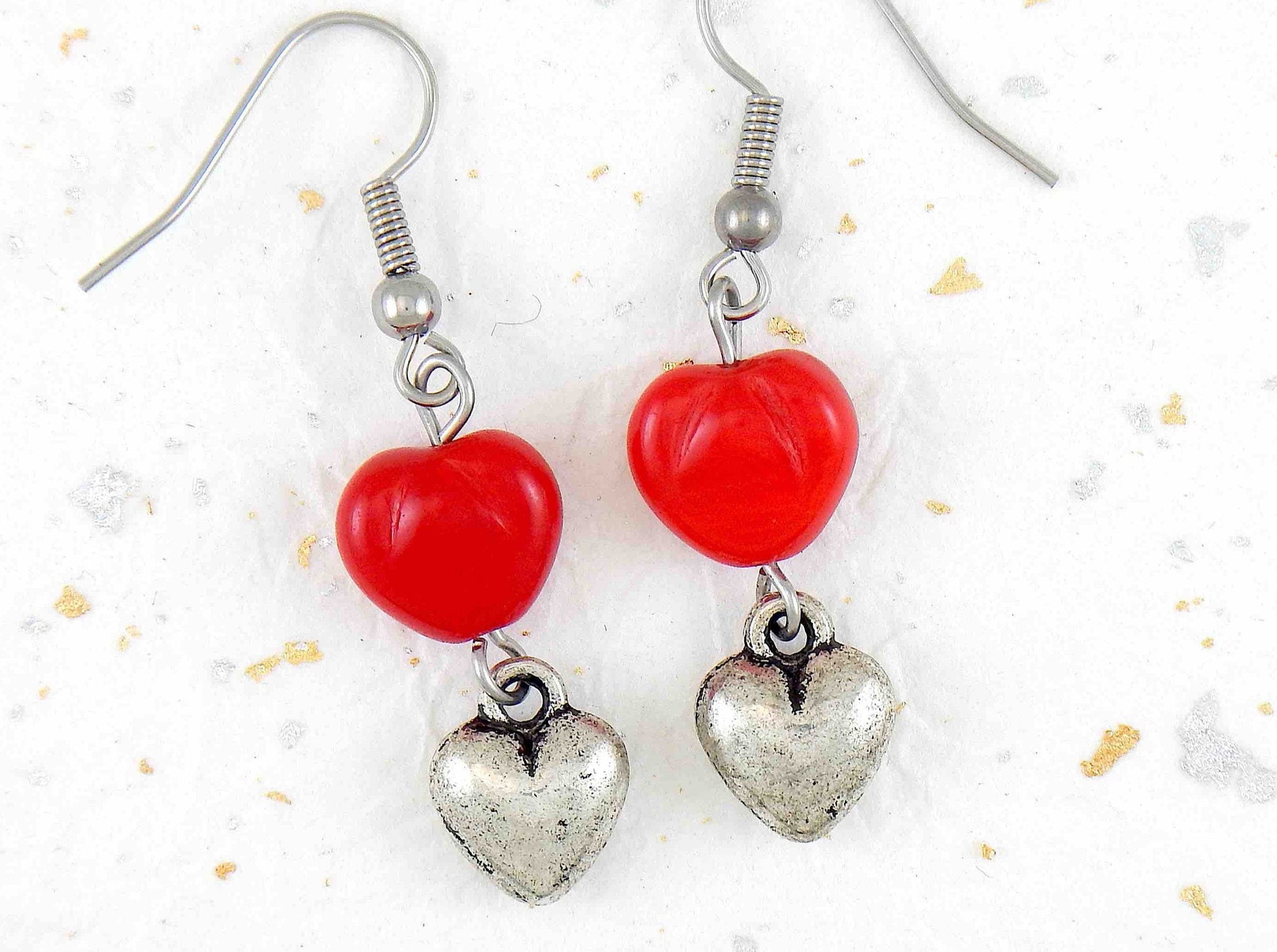 Long earrings with plump pewter hearts and bright red glass hearts, stainless steel hooks