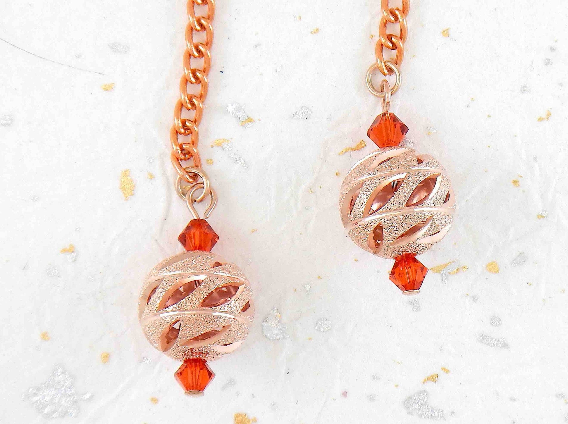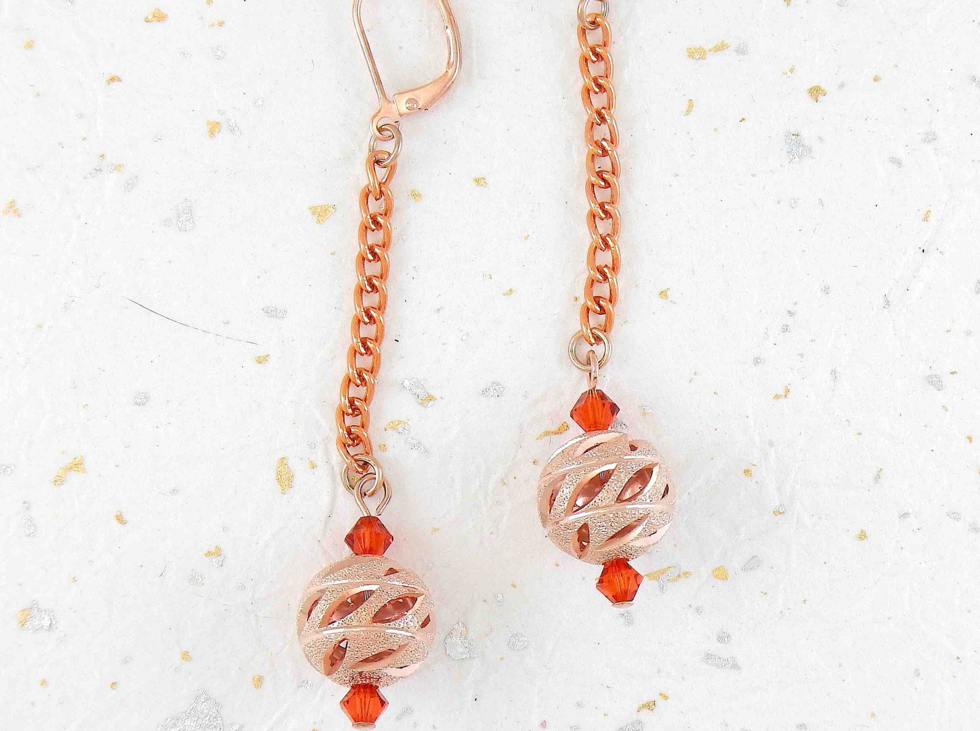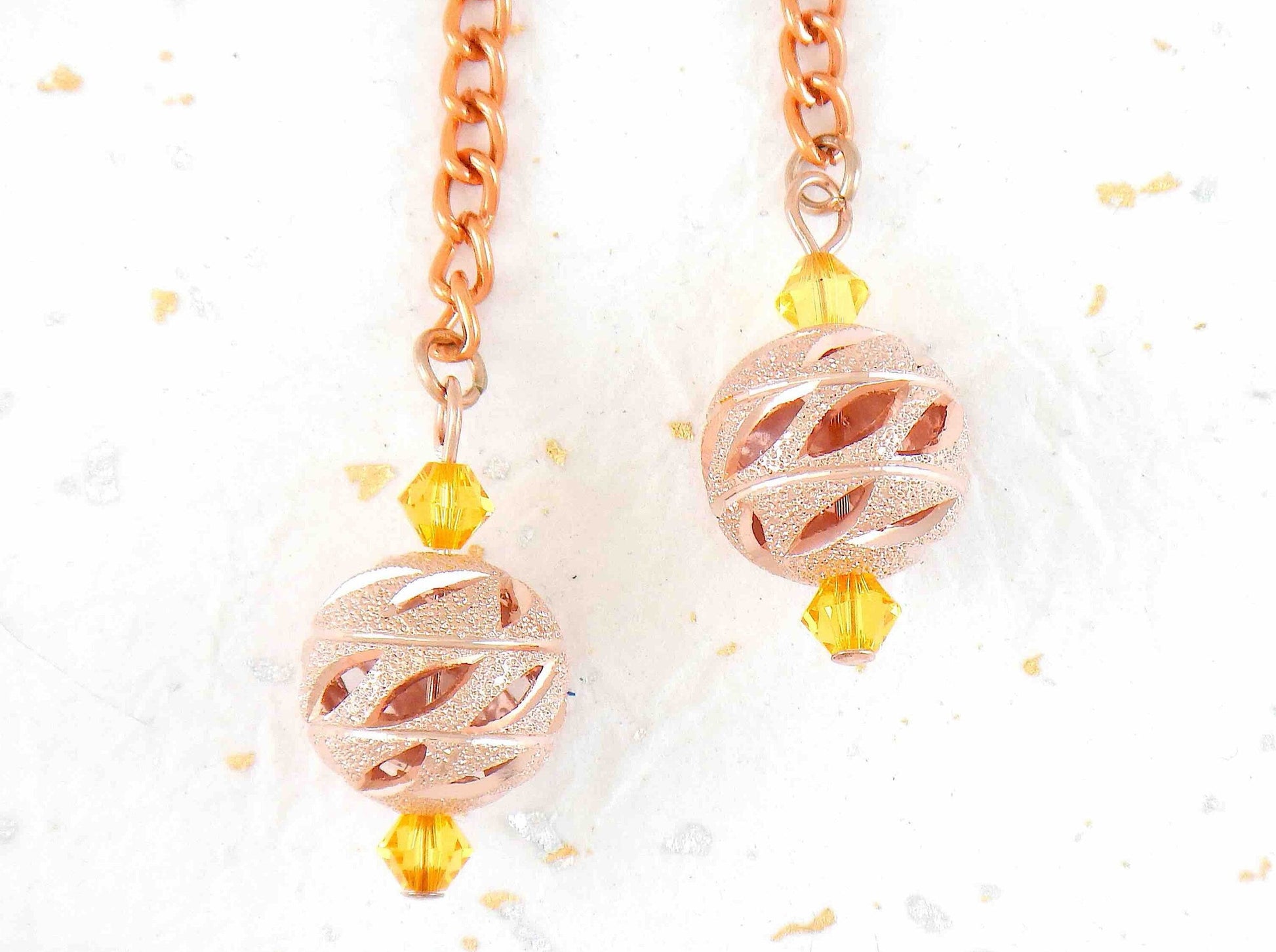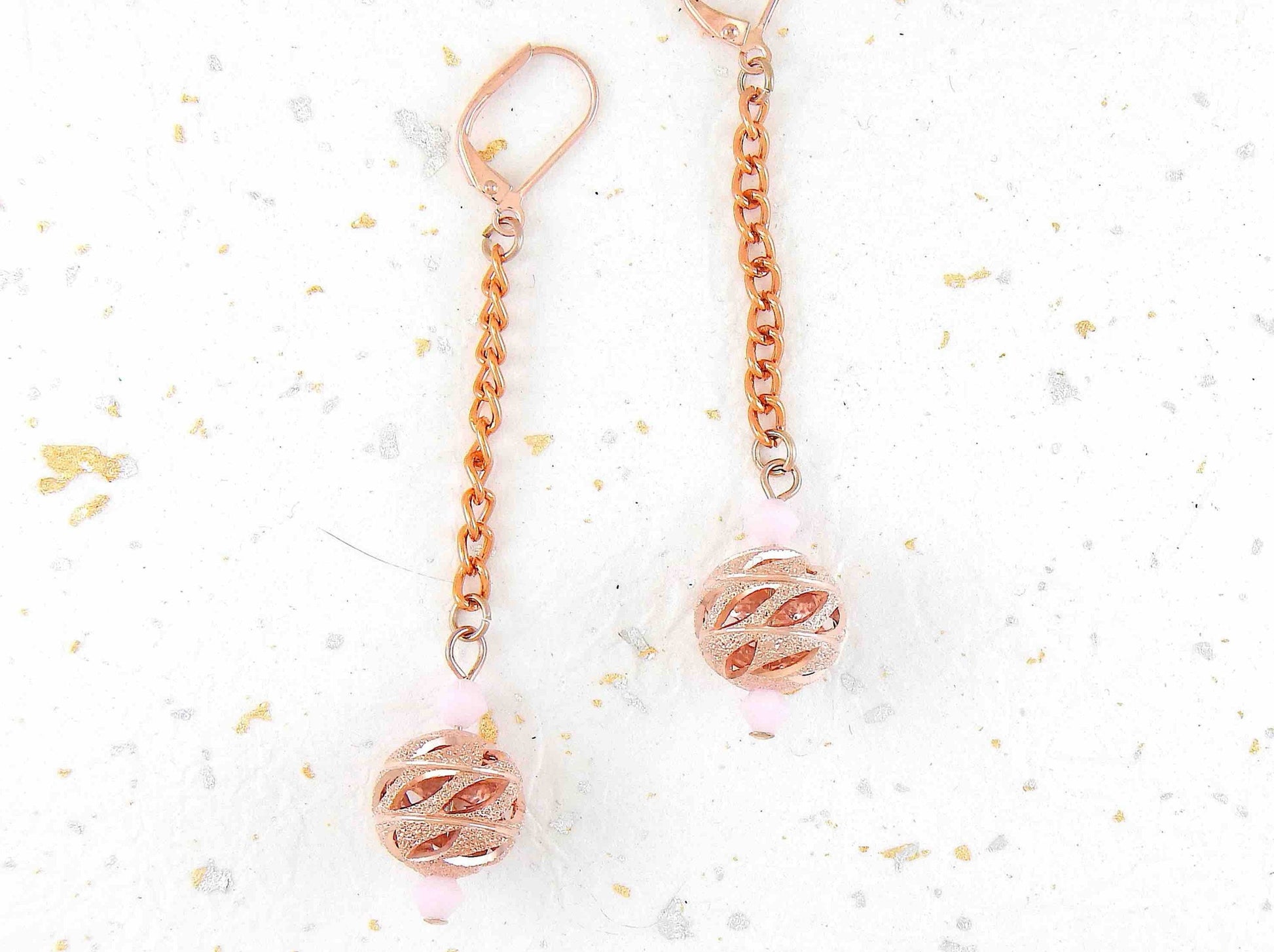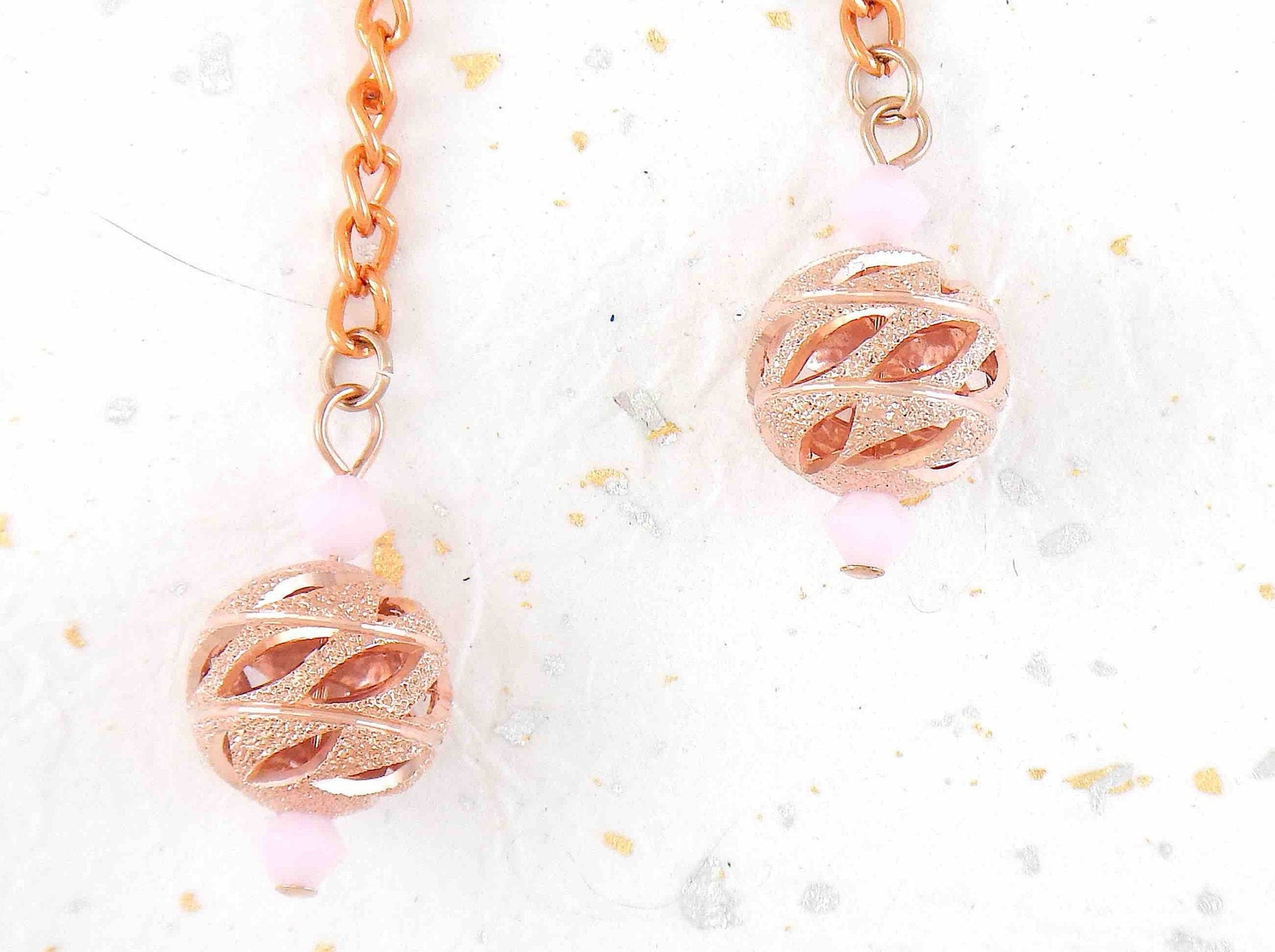 Long earrings with rose gold filigree balls and Swarovski crystals, rose-gold plated metal lever back hooks