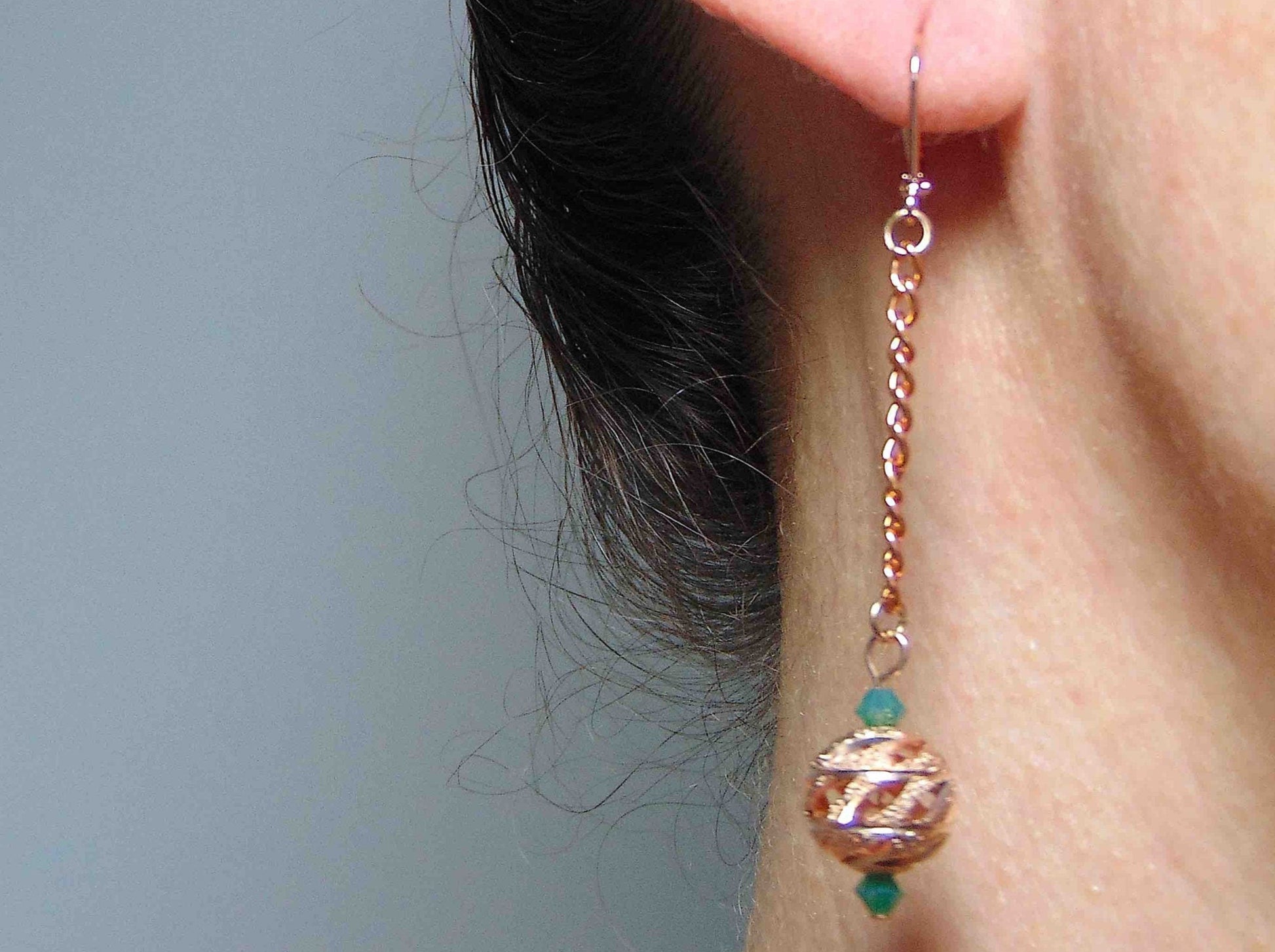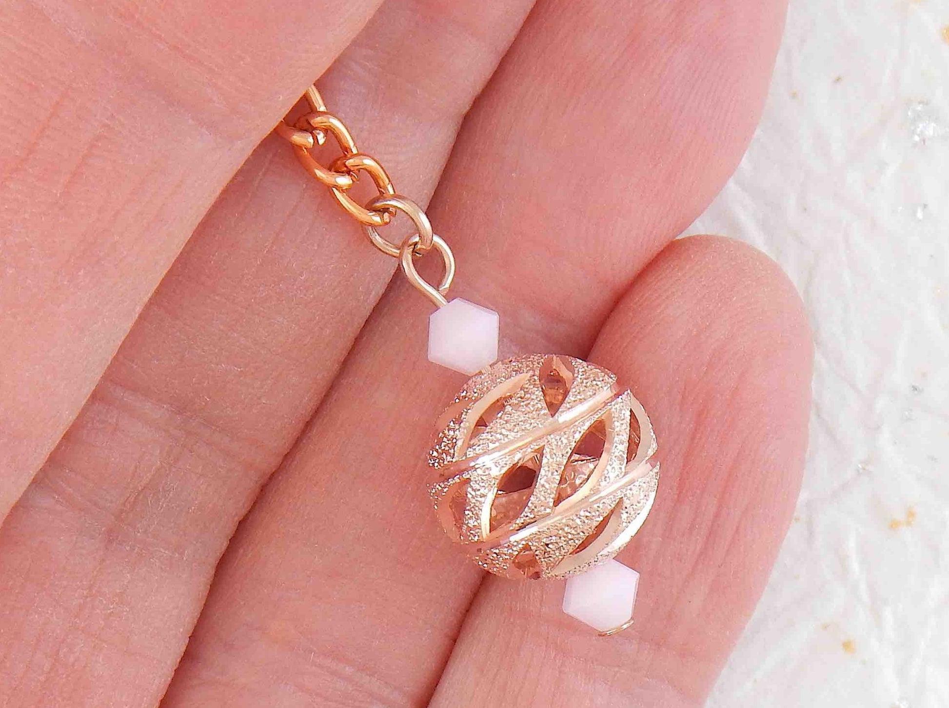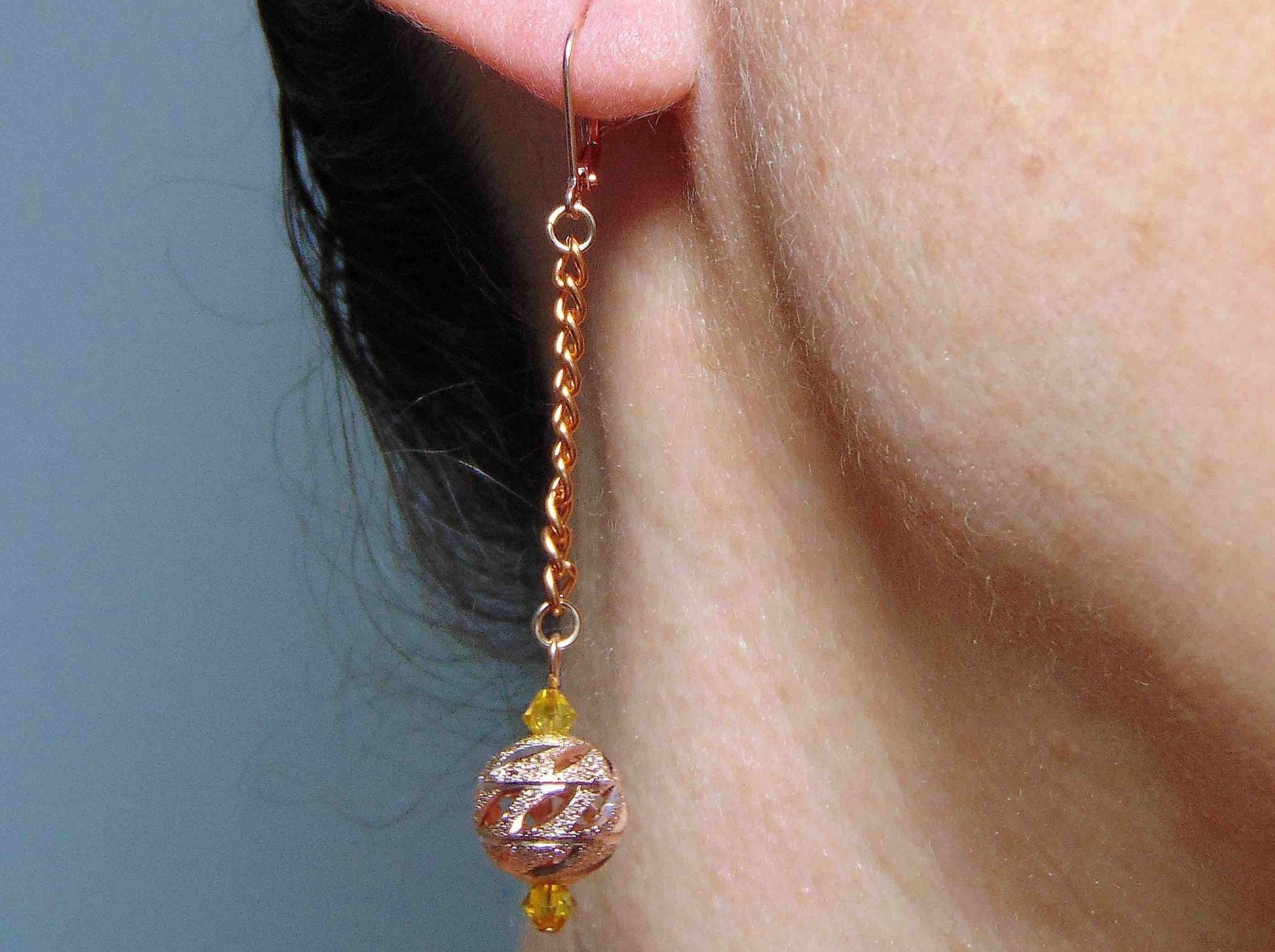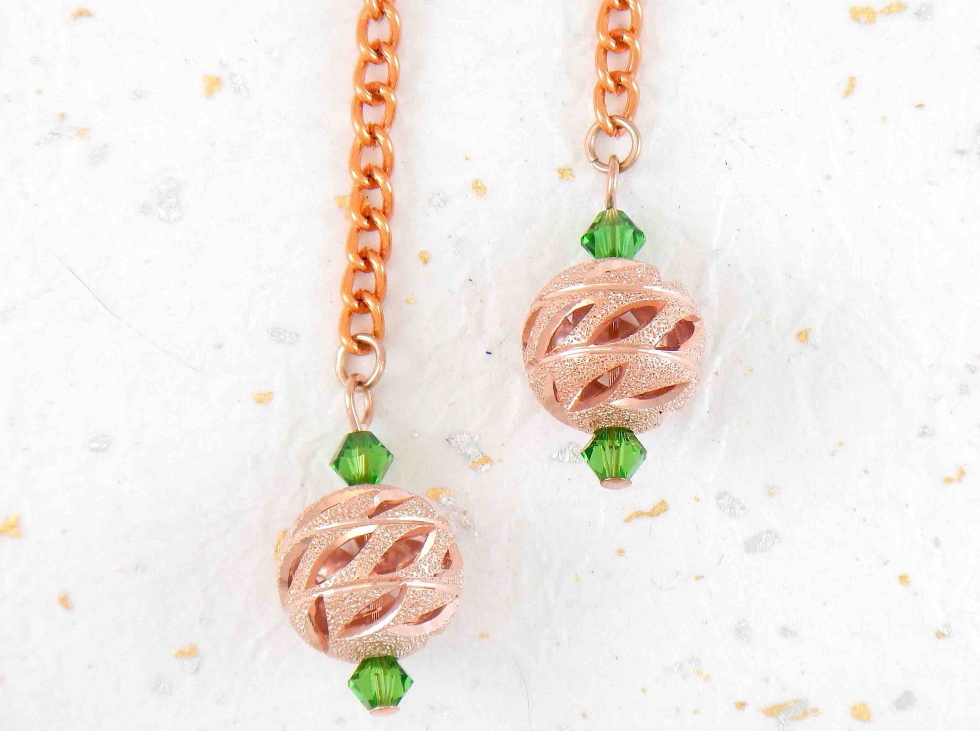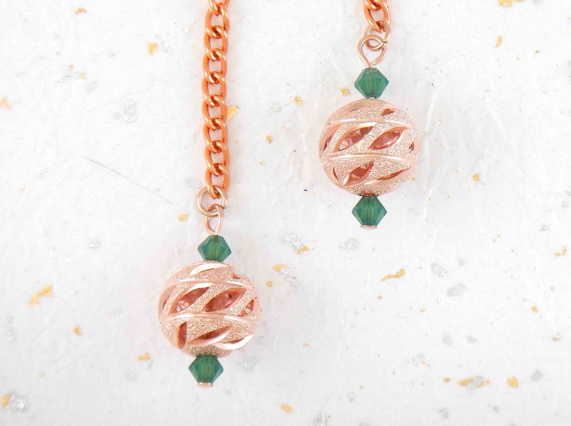 Long earrings with rose gold filigree balls and Swarovski crystals, rose-gold plated metal lever back hooks