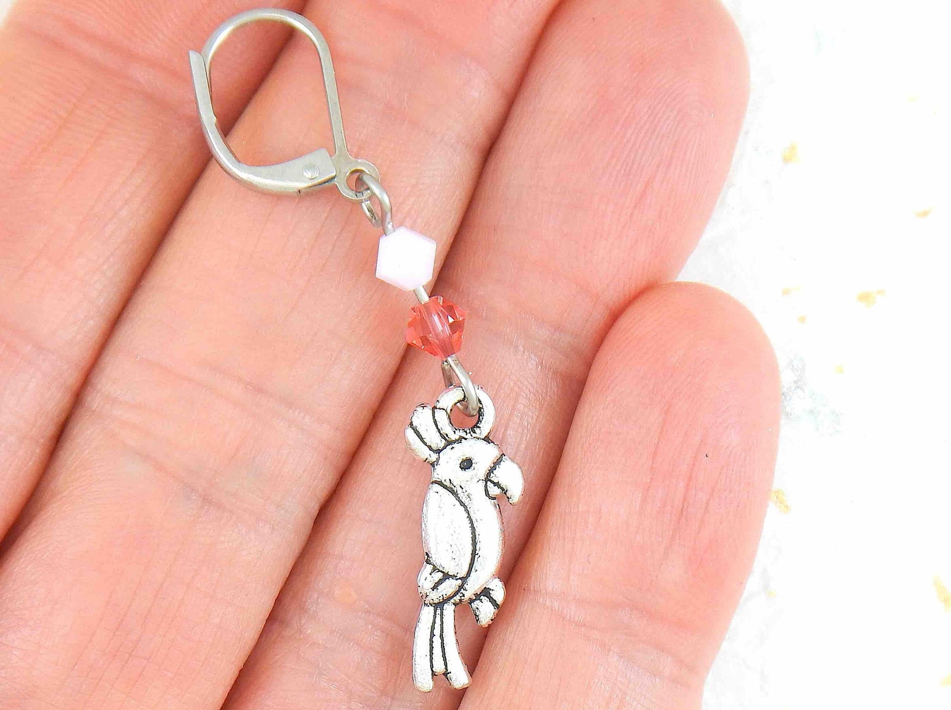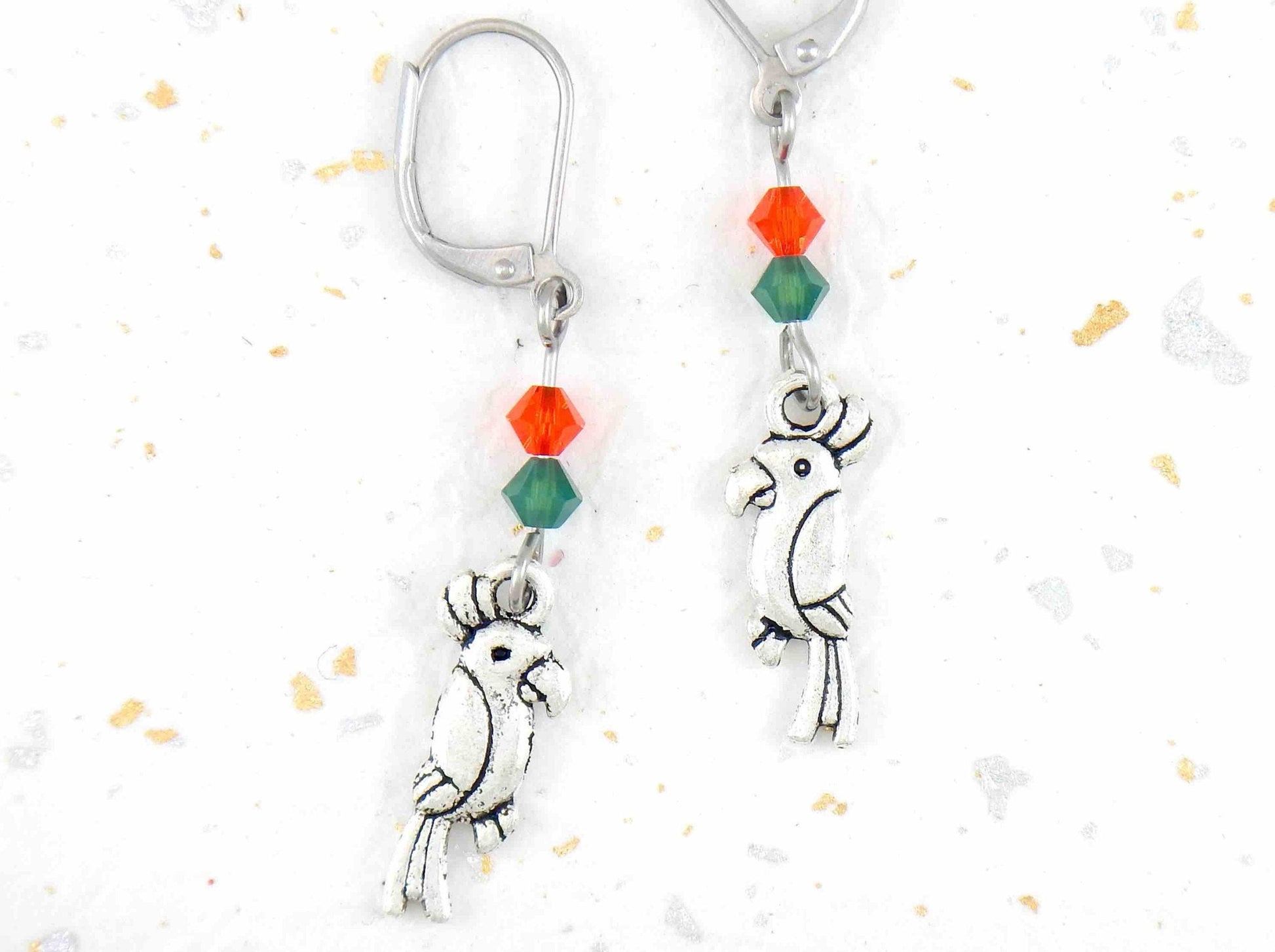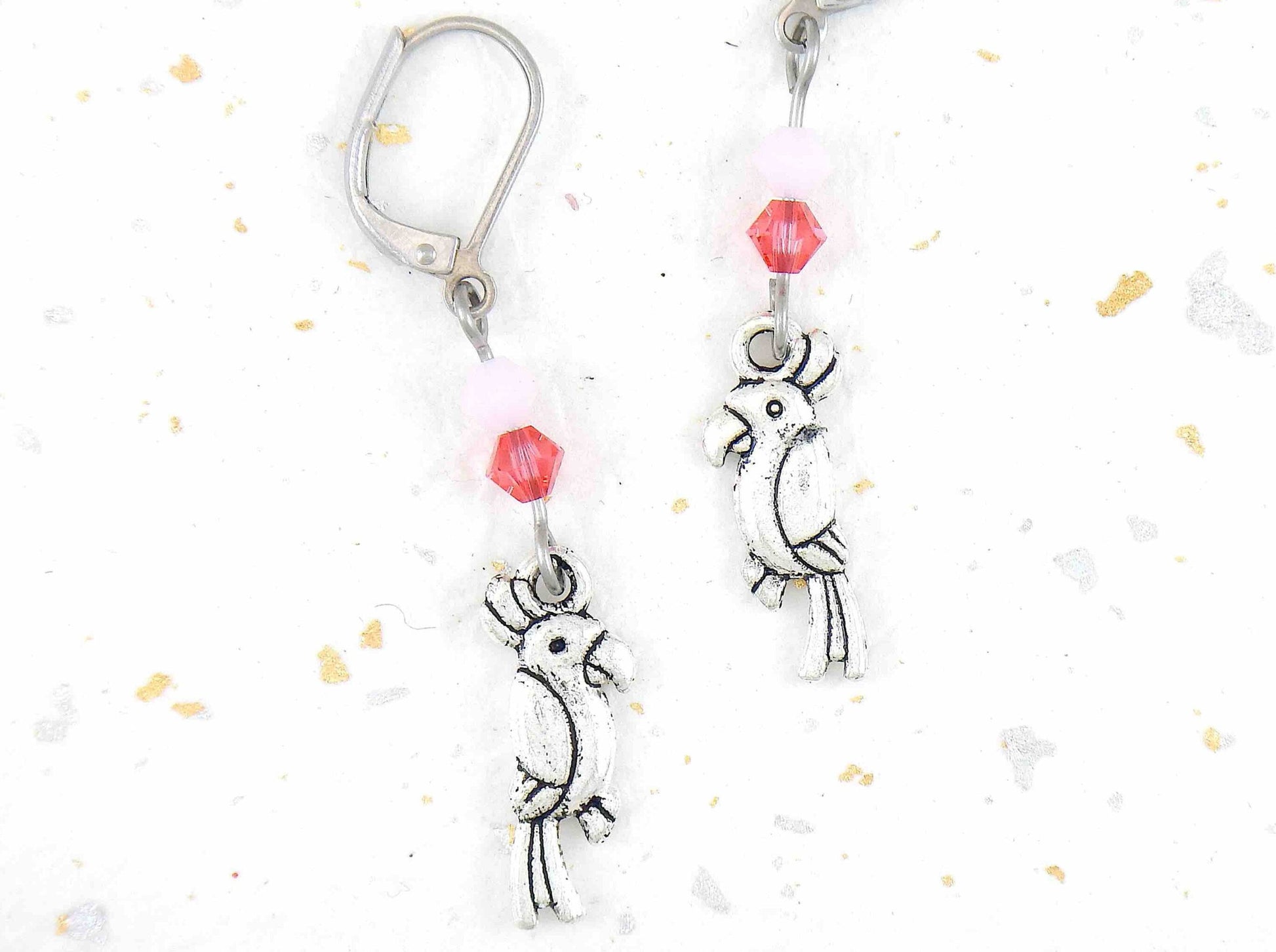 Long earrings with small pewter cockatoos (parrots) and Swarovski crystals, stainless steel lever back hooks