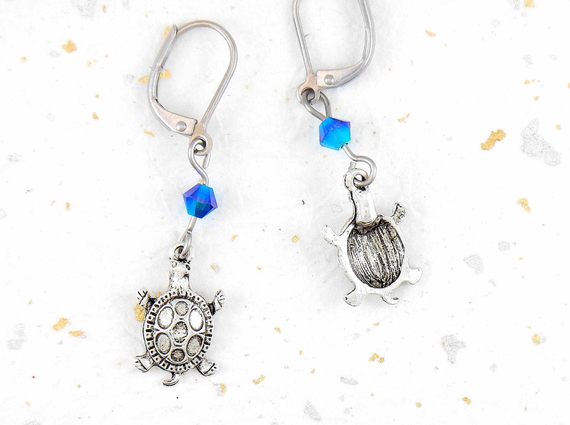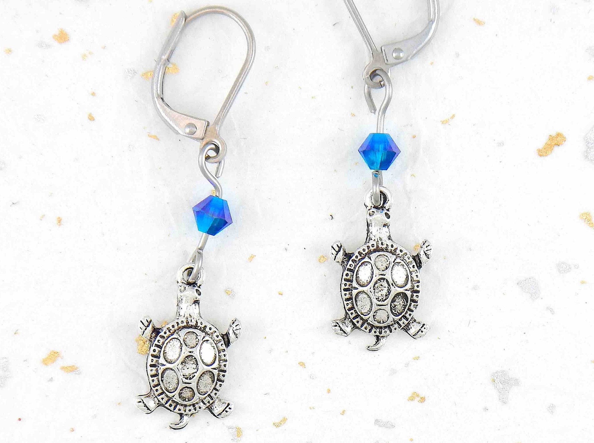 Long earrings with small silver turtles and metallic blue Swarovski crystals, stainless steel lever back hooks