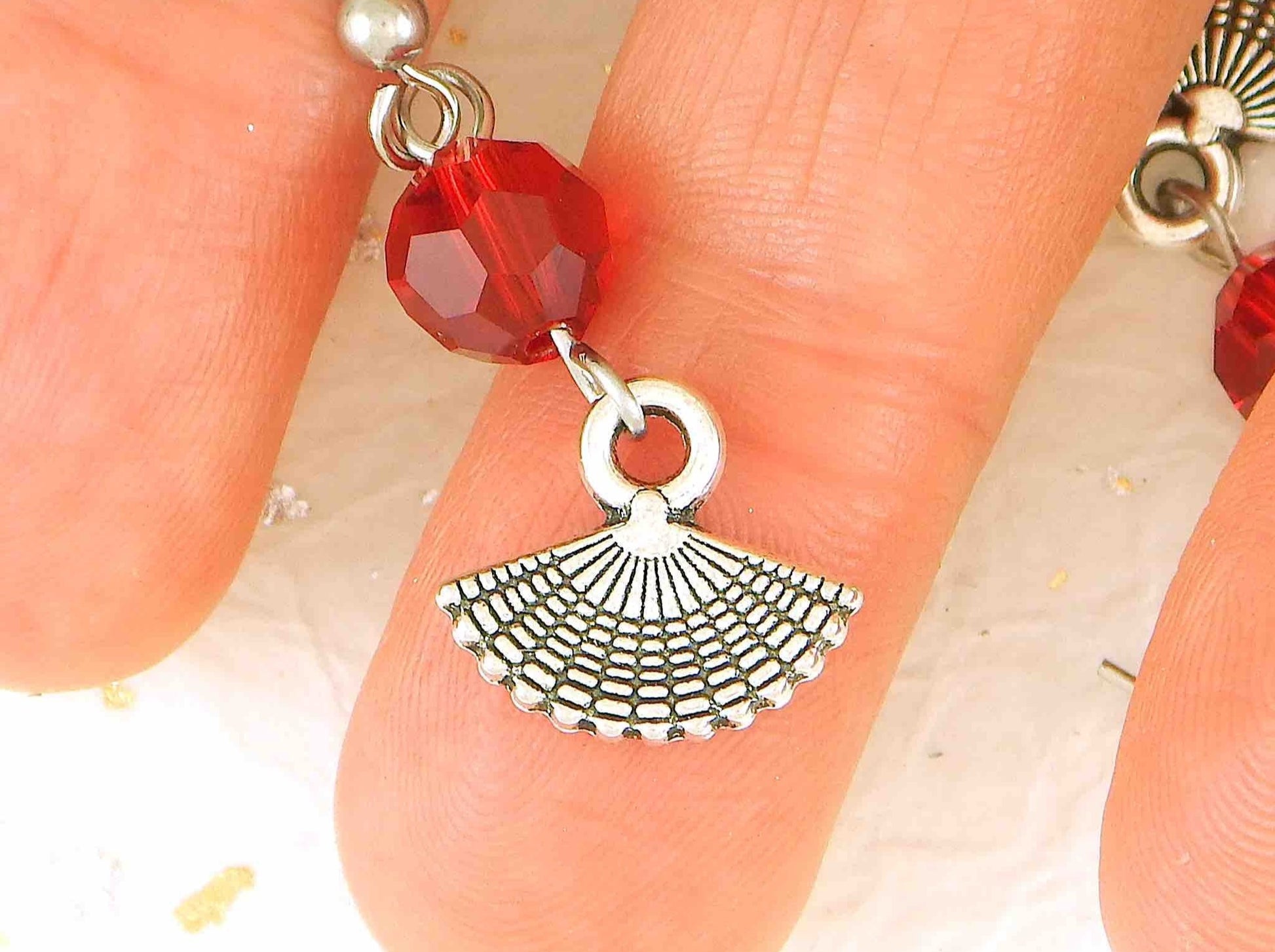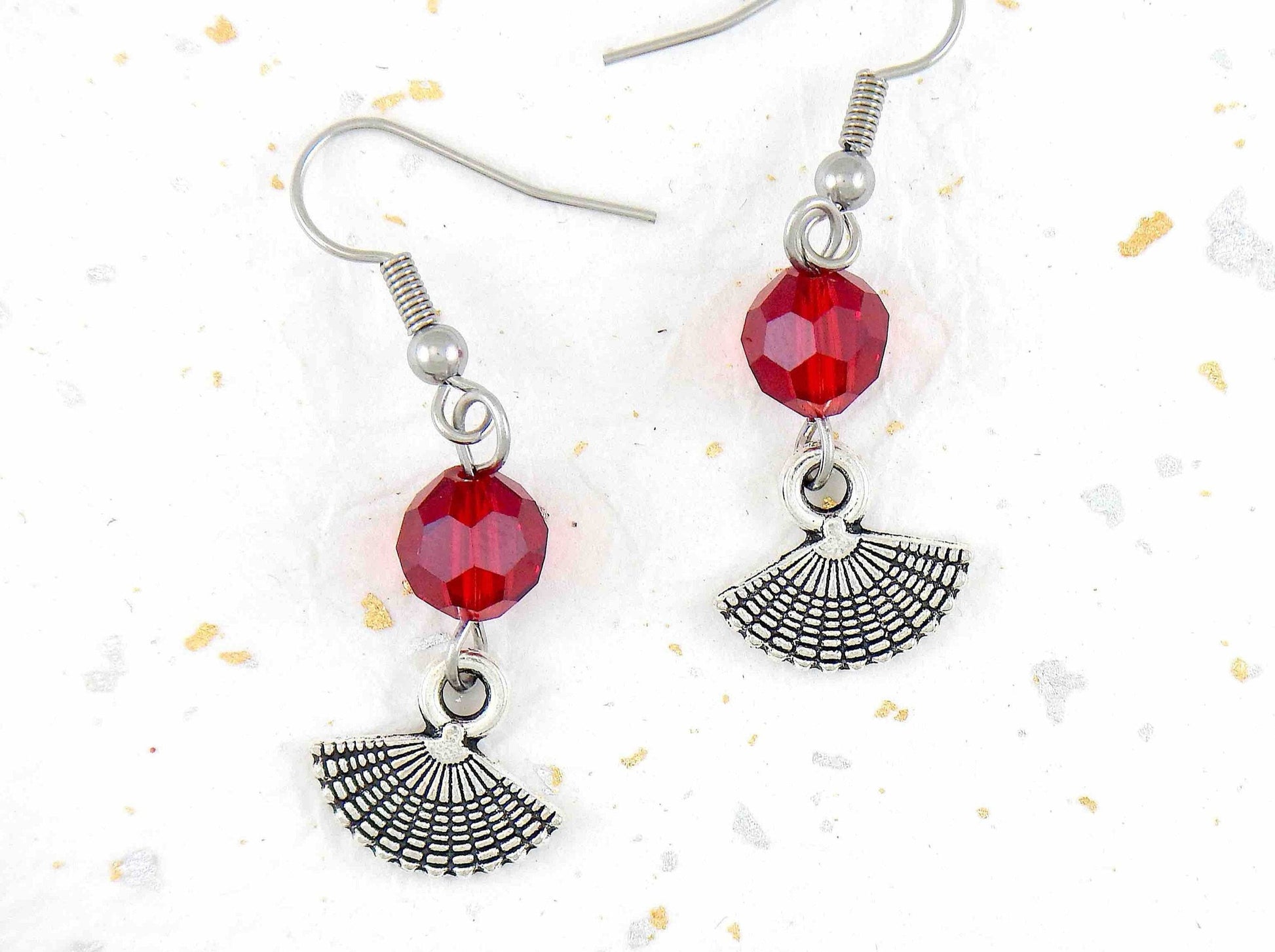 Long earrings with tiny pewter fans and red crystal balls, stainless steel hooks