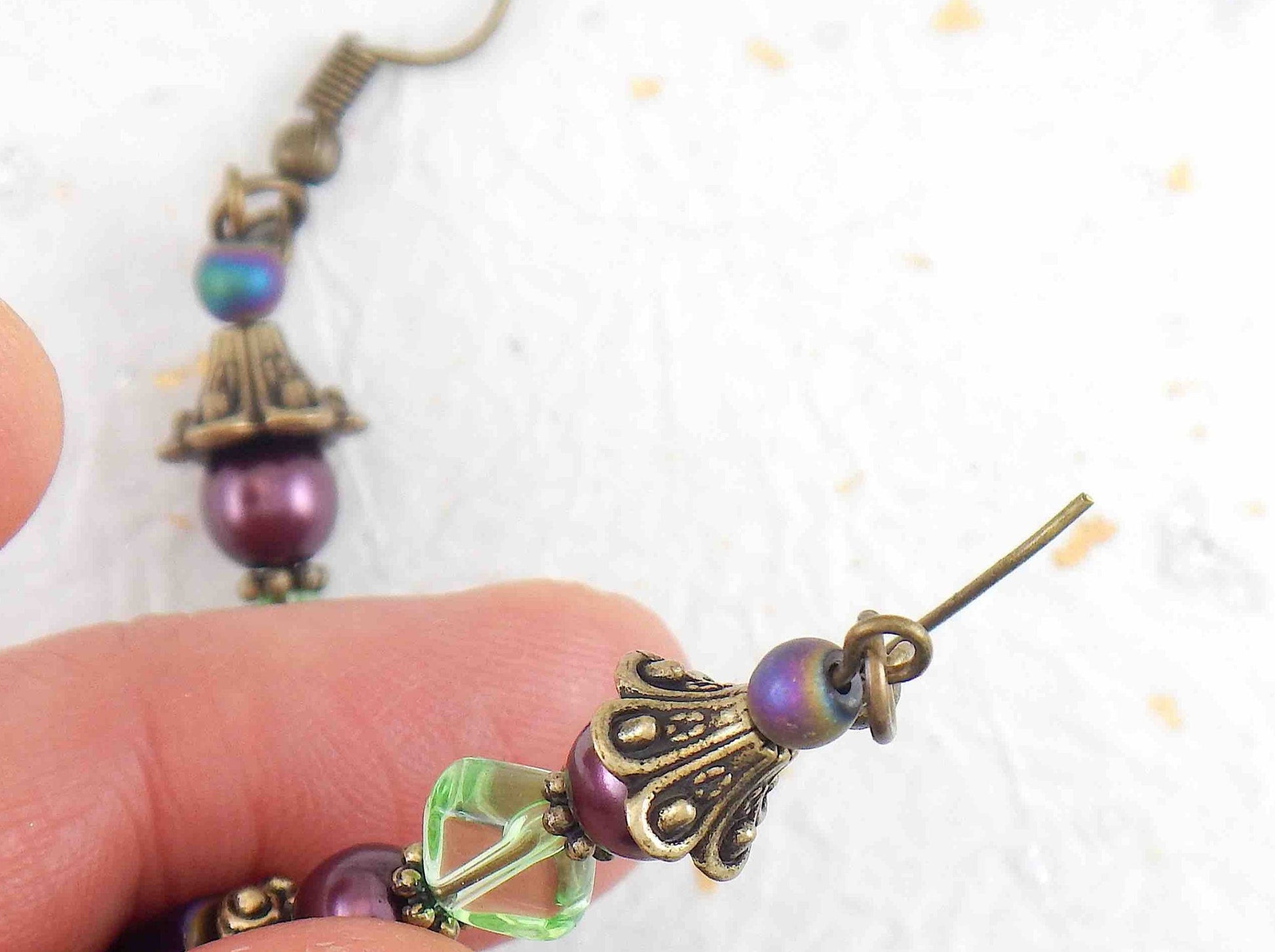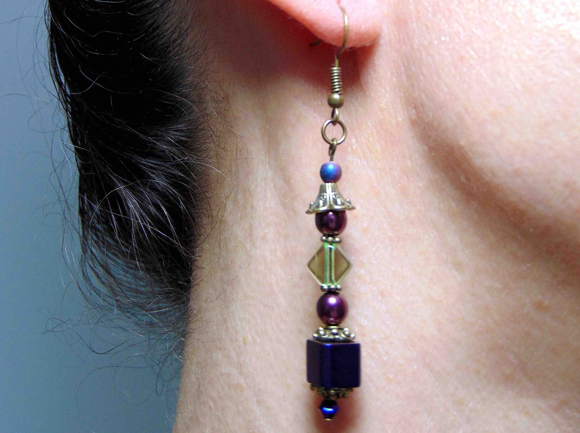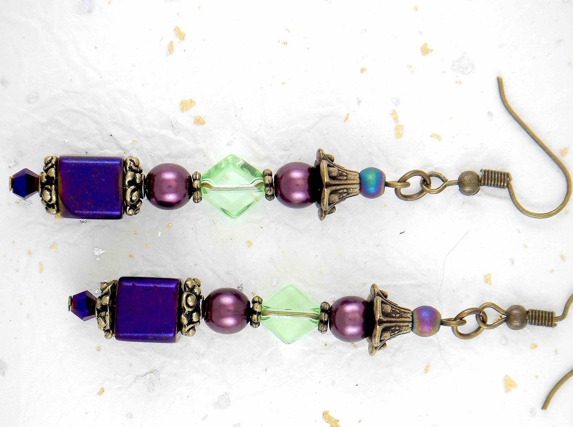 Long layered earrings with metallic violet cubes, plum balls, green lozenges, violet crystals, brass caps, brass hooks