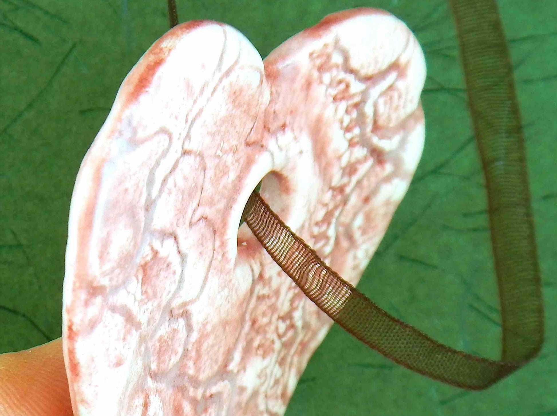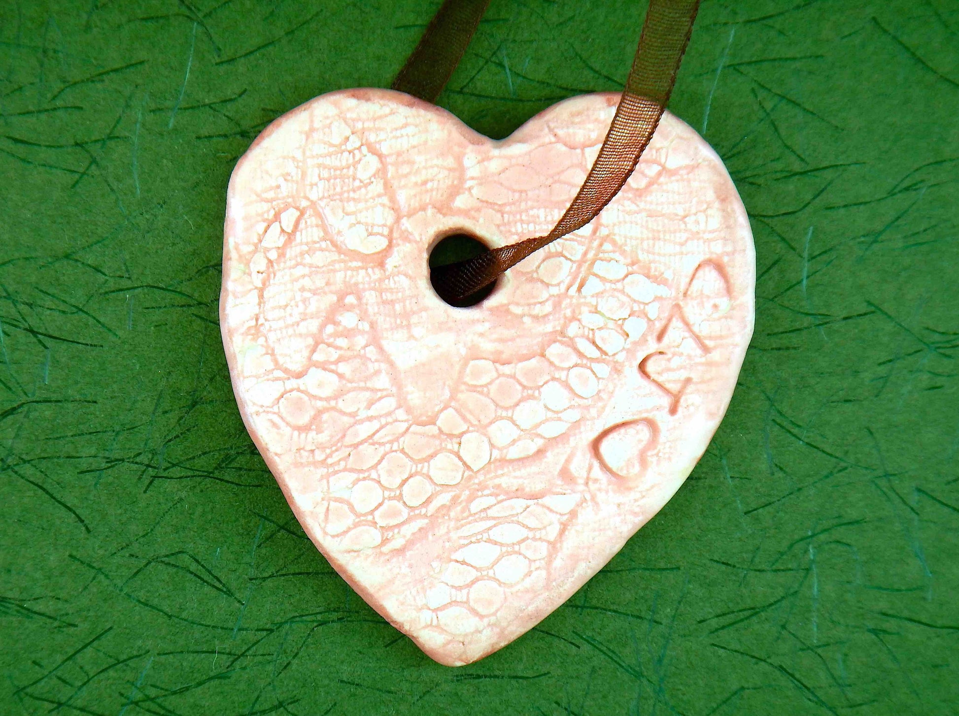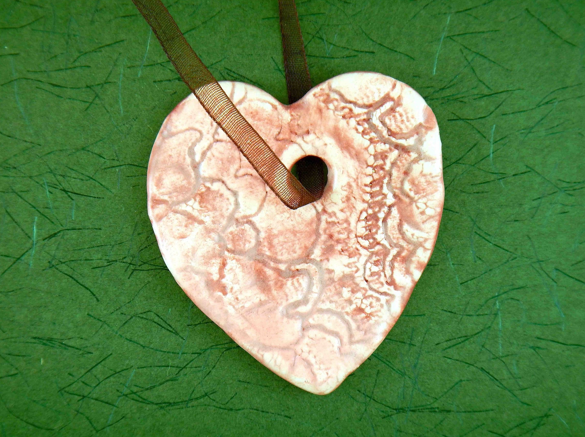 Ornament with large light pink ceramics heart handmade in Montreal, burgundy lace pattern, chocolate brown organza ribbon