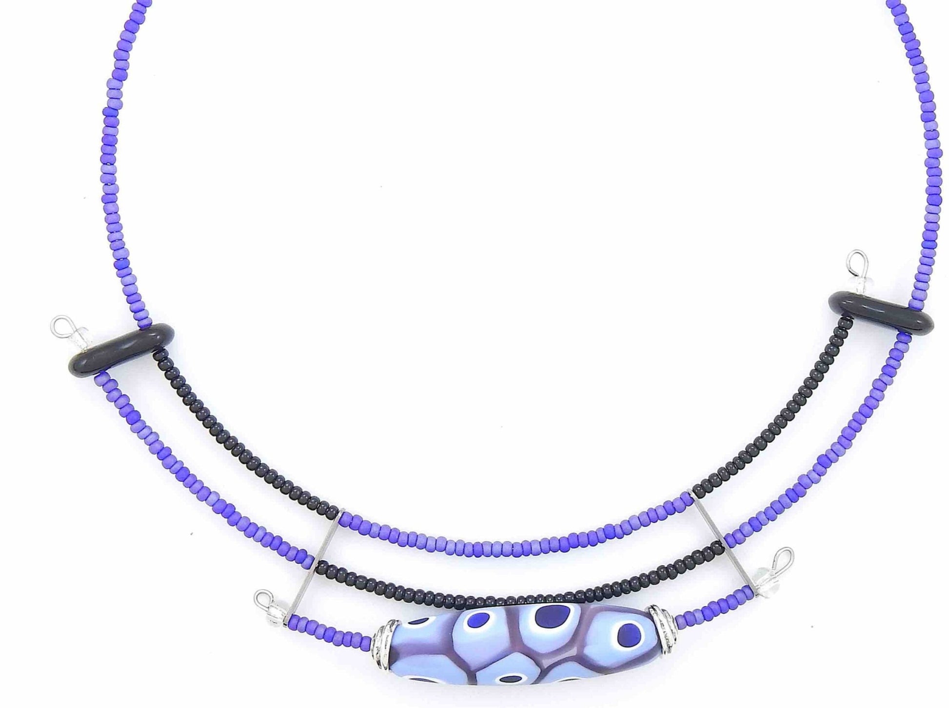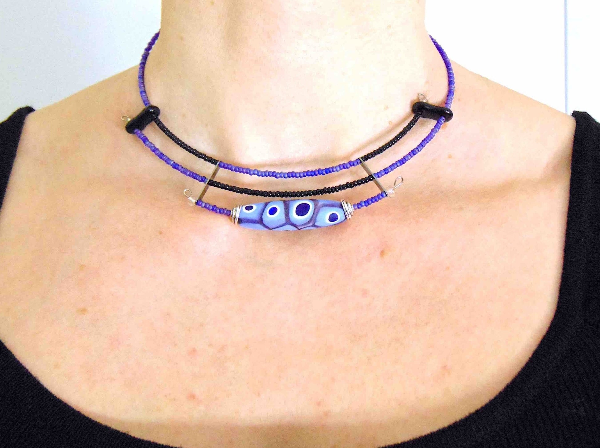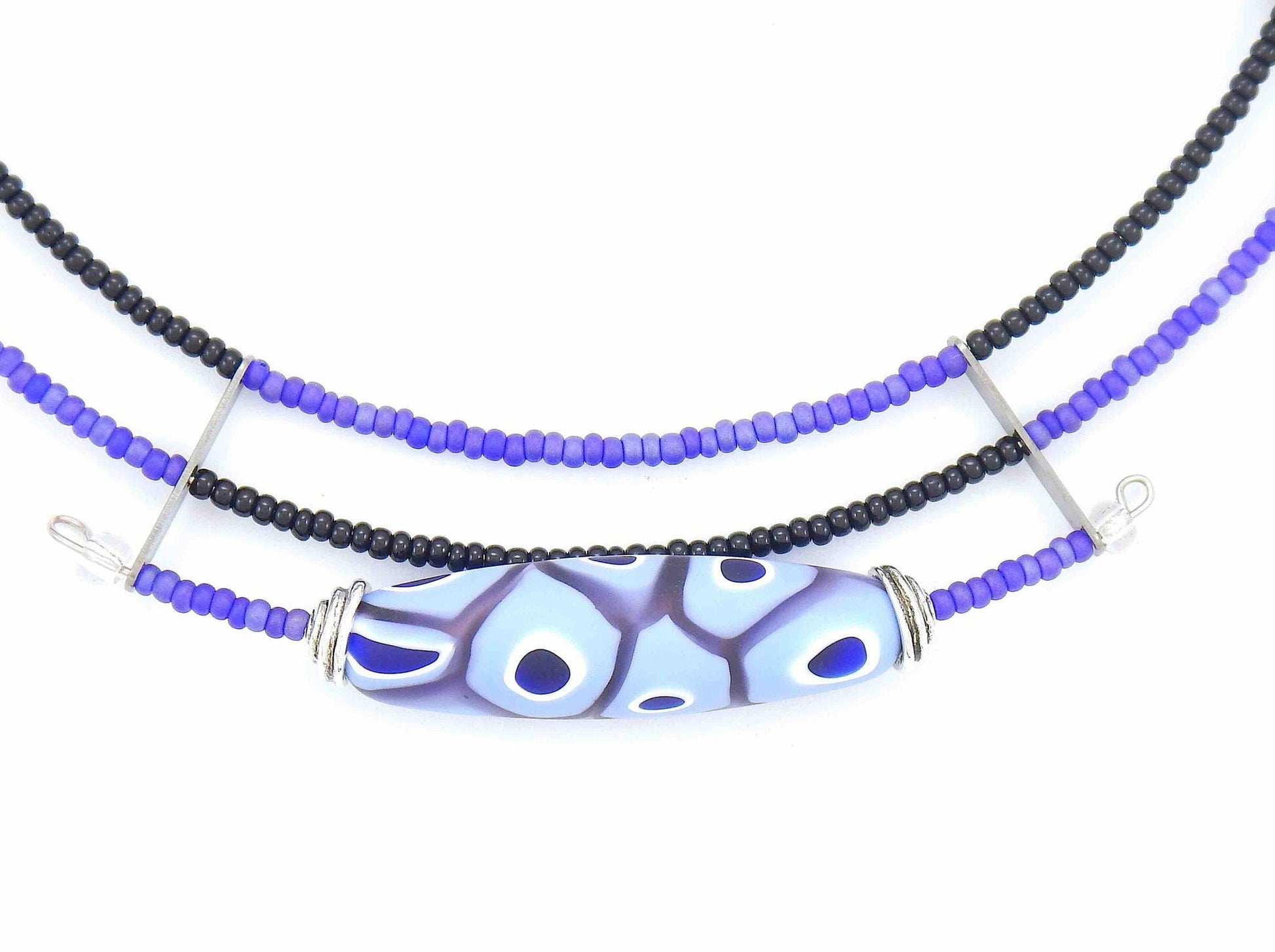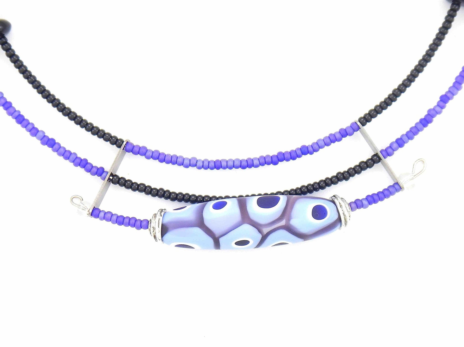 Short asymmetric necklace with matte lilac and black Murano glass bead, eye-dot pattern, metal clasp