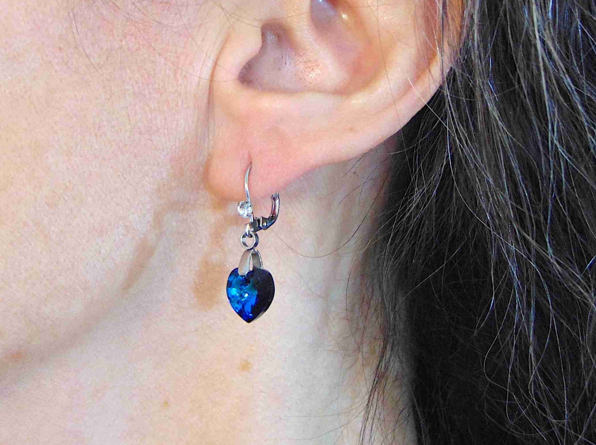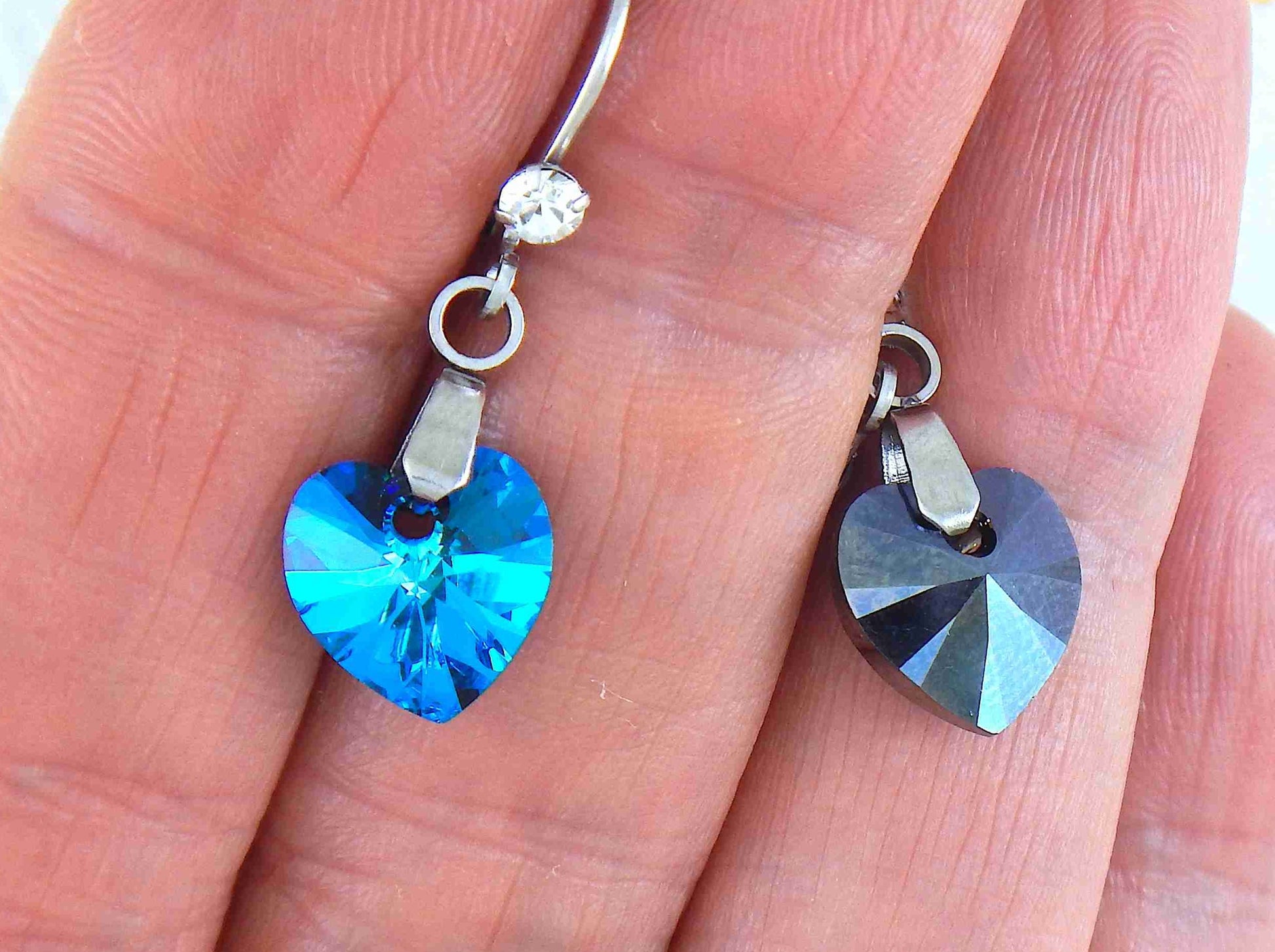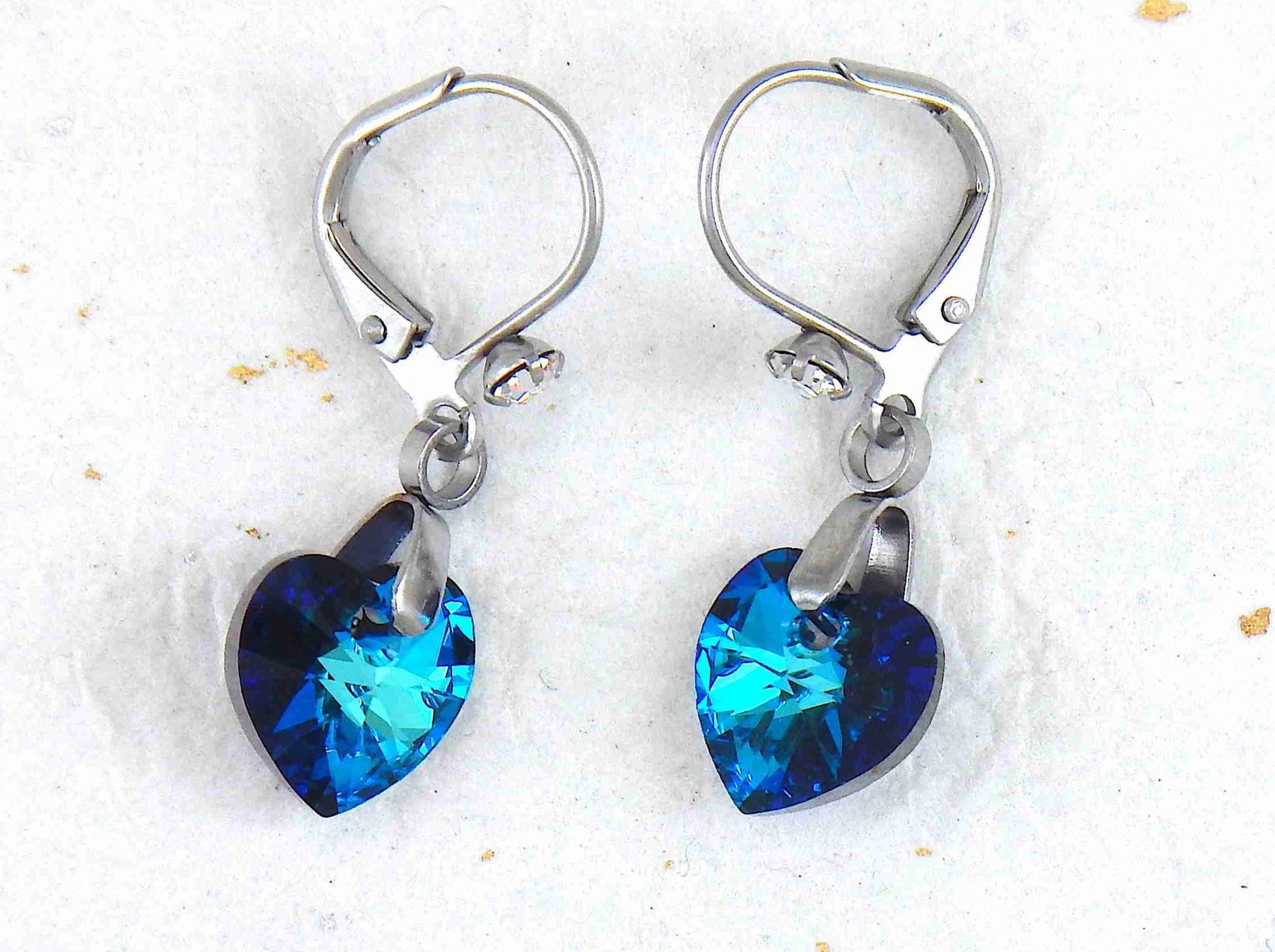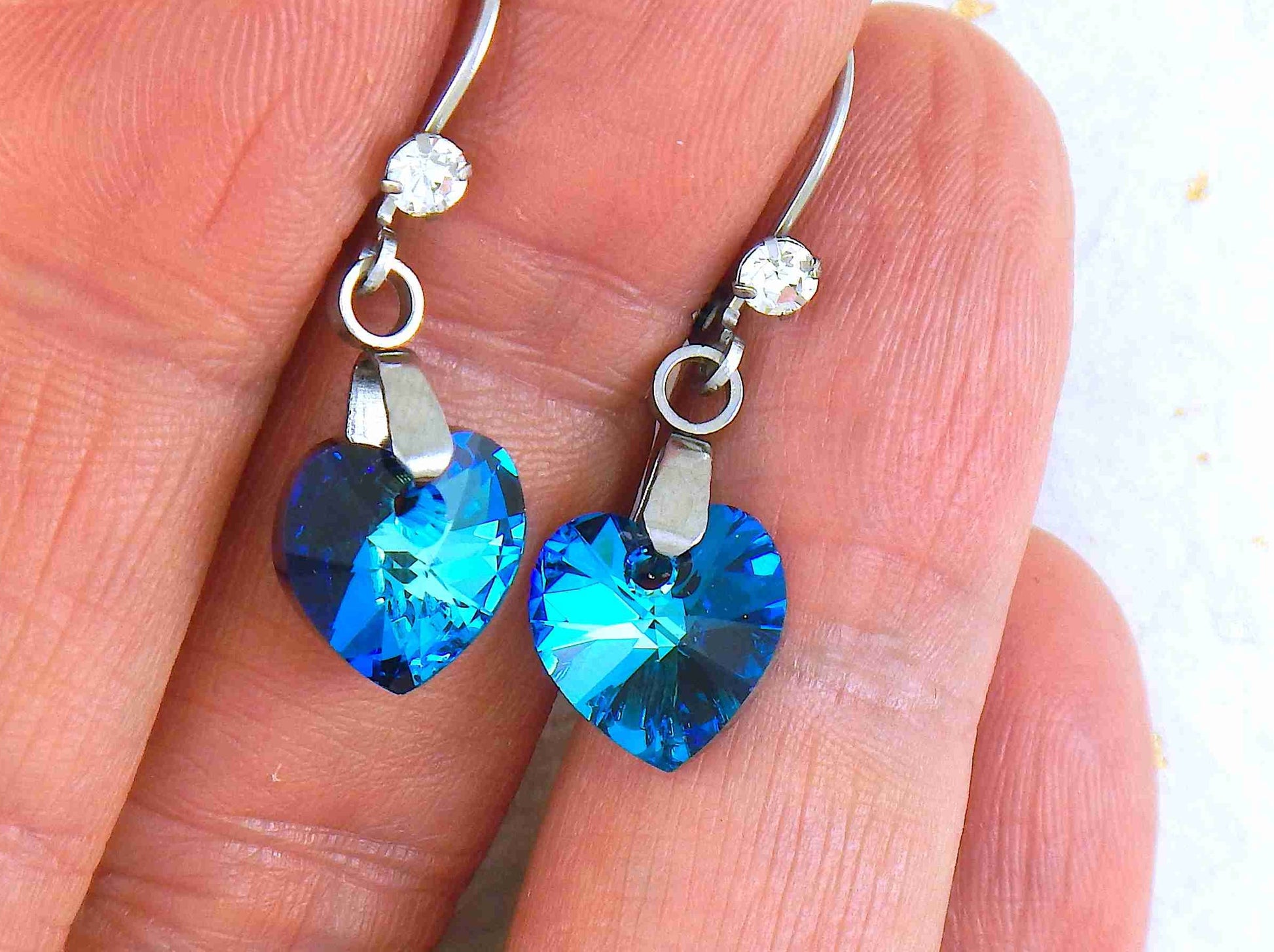Short earrings with 10mm faceted Bermuda Blue Swarovski crystal hearts, stainless steel lever back hooks with tiny clear crystals
