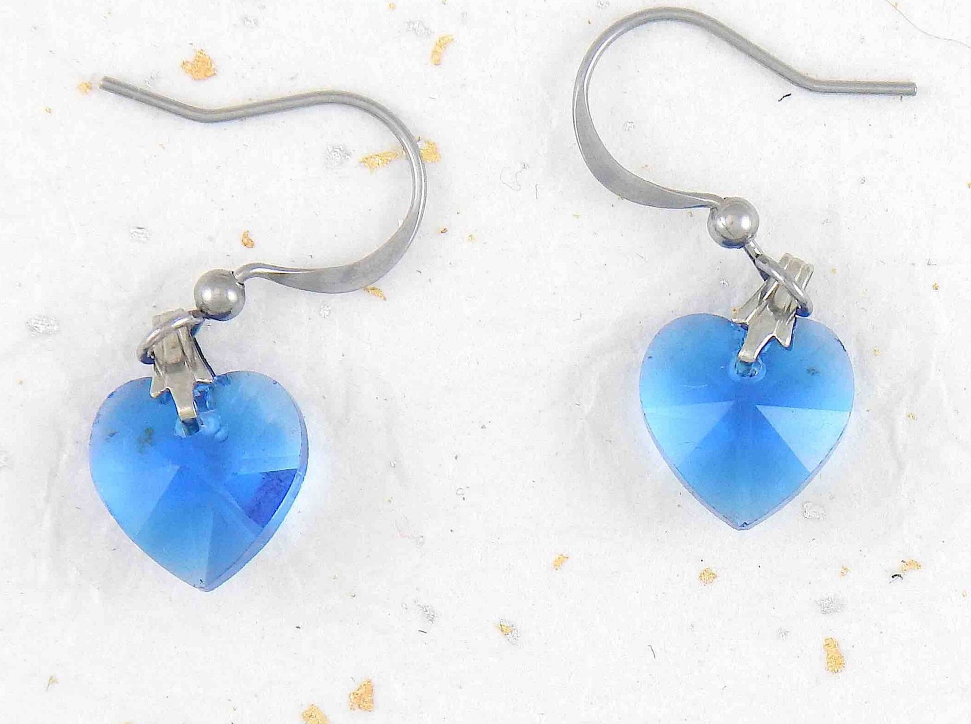 Short earrings with 10mm faceted blue Swarovski crystal hearts, stainless steel hooks
