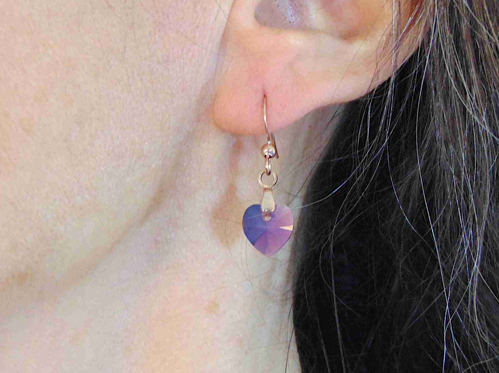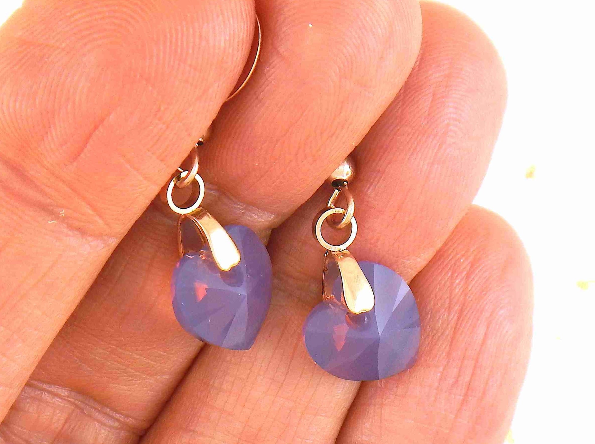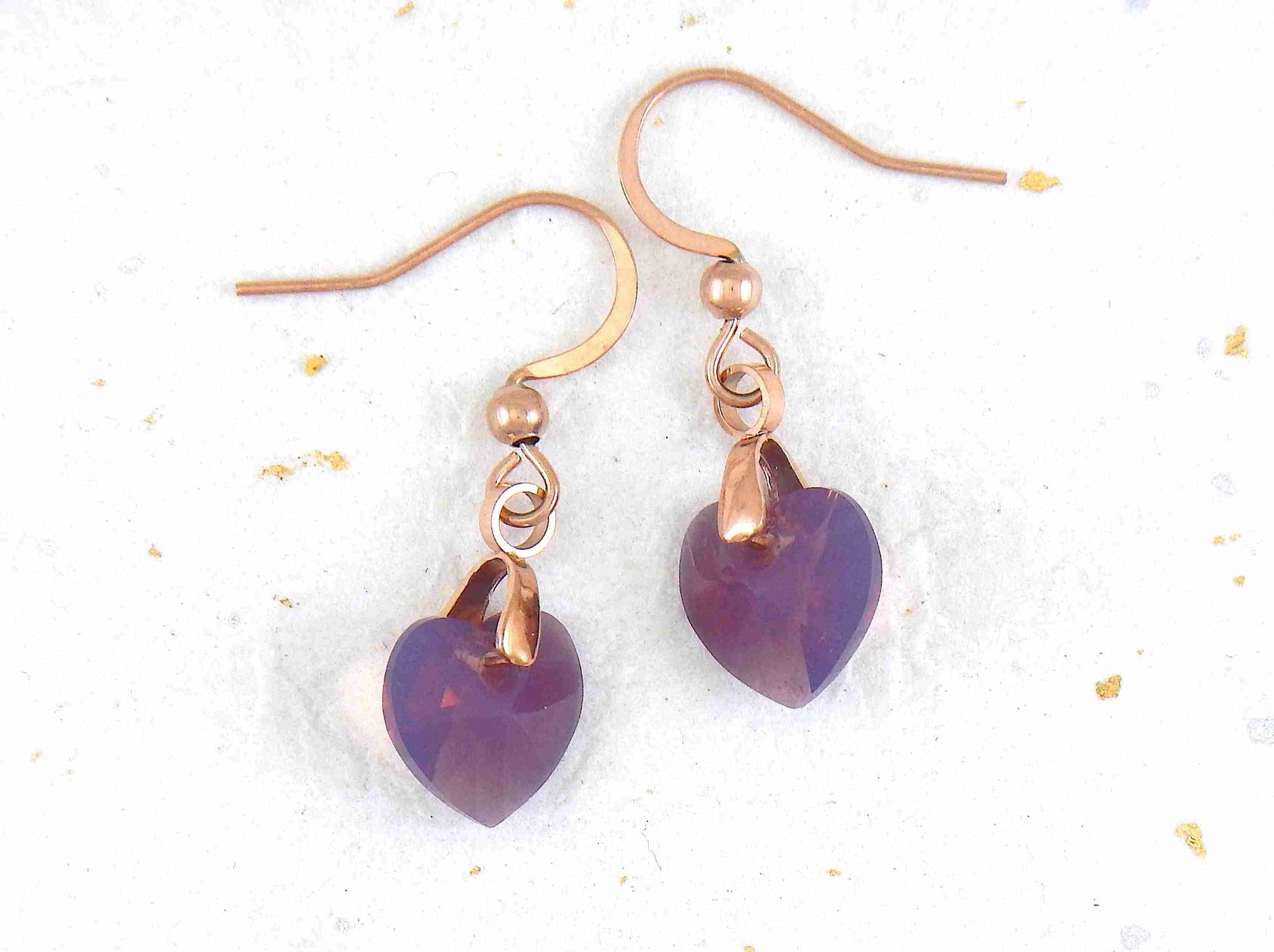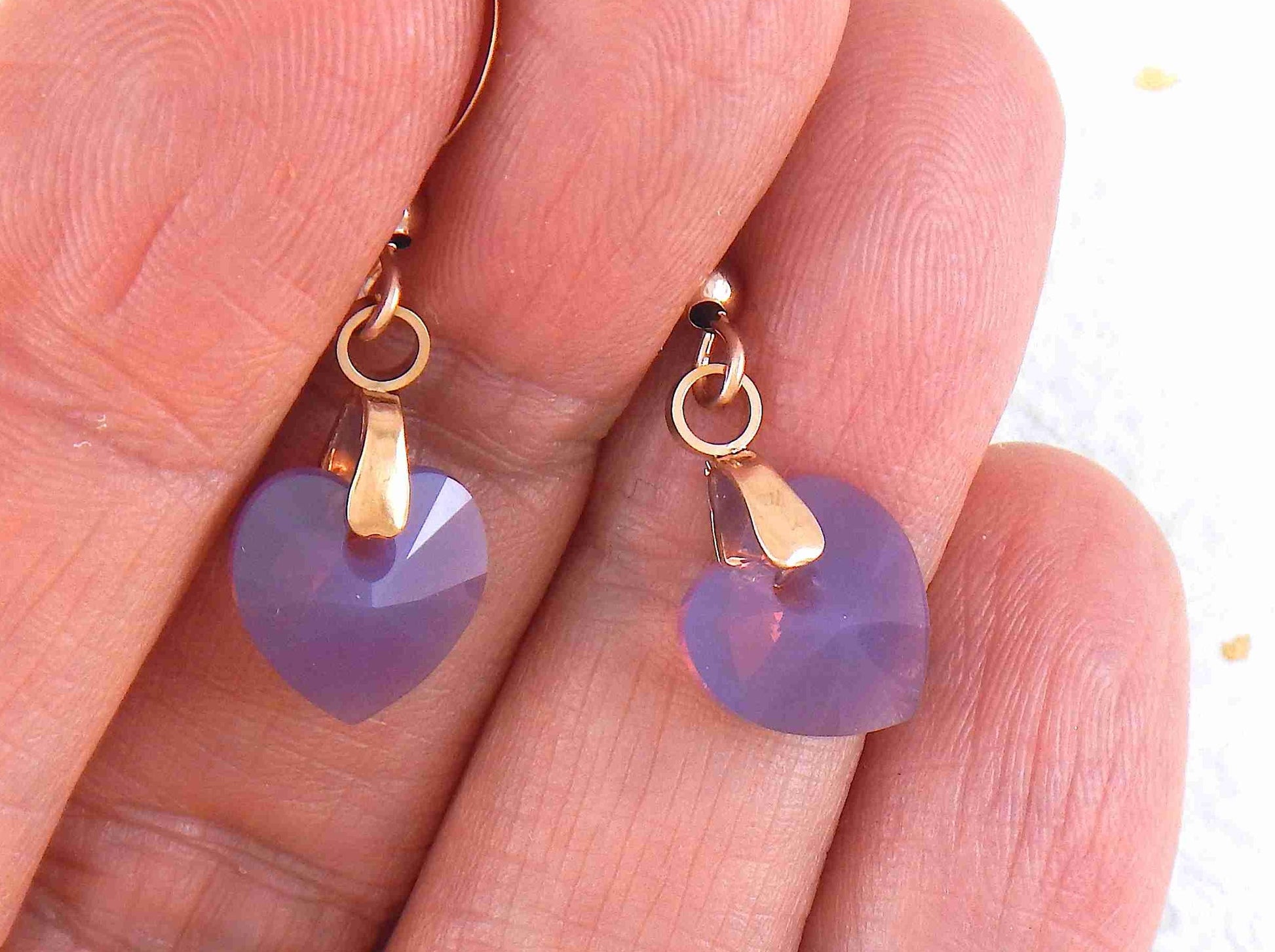 Short earrings with 10mm faceted Lilac Shadow Swarovski crystal hearts, rose-gold toned stainless steel hooks