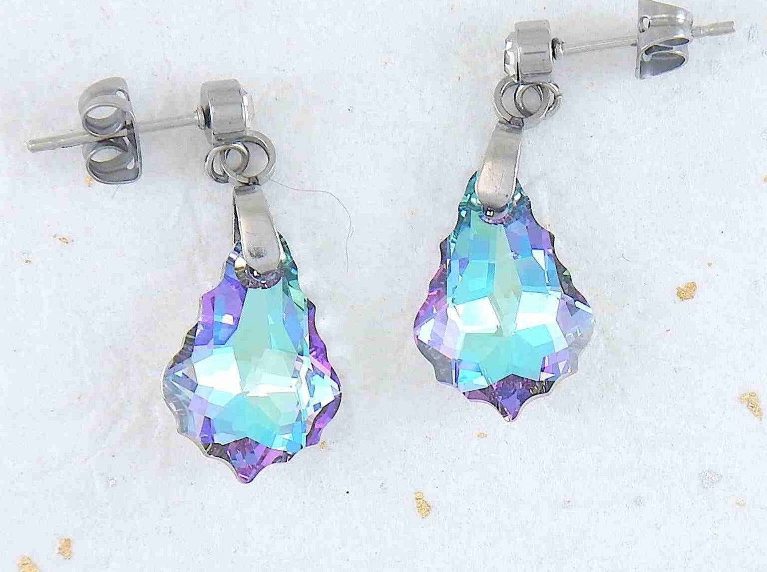 Short earrings with 16mm Vitrail Light (blue/lilac) baroque Swarovski crystals, stainless steel studs with tiny clear crystals