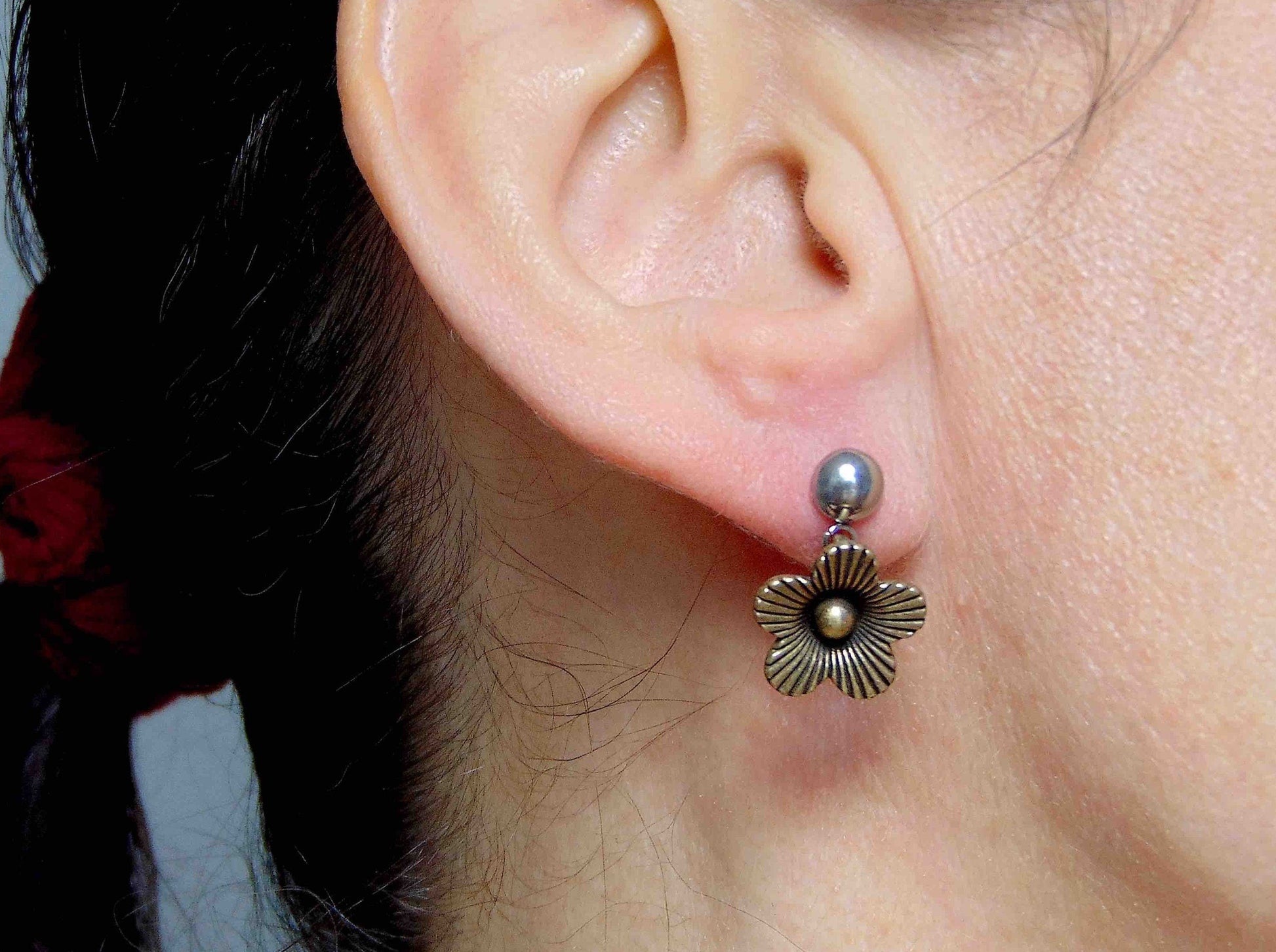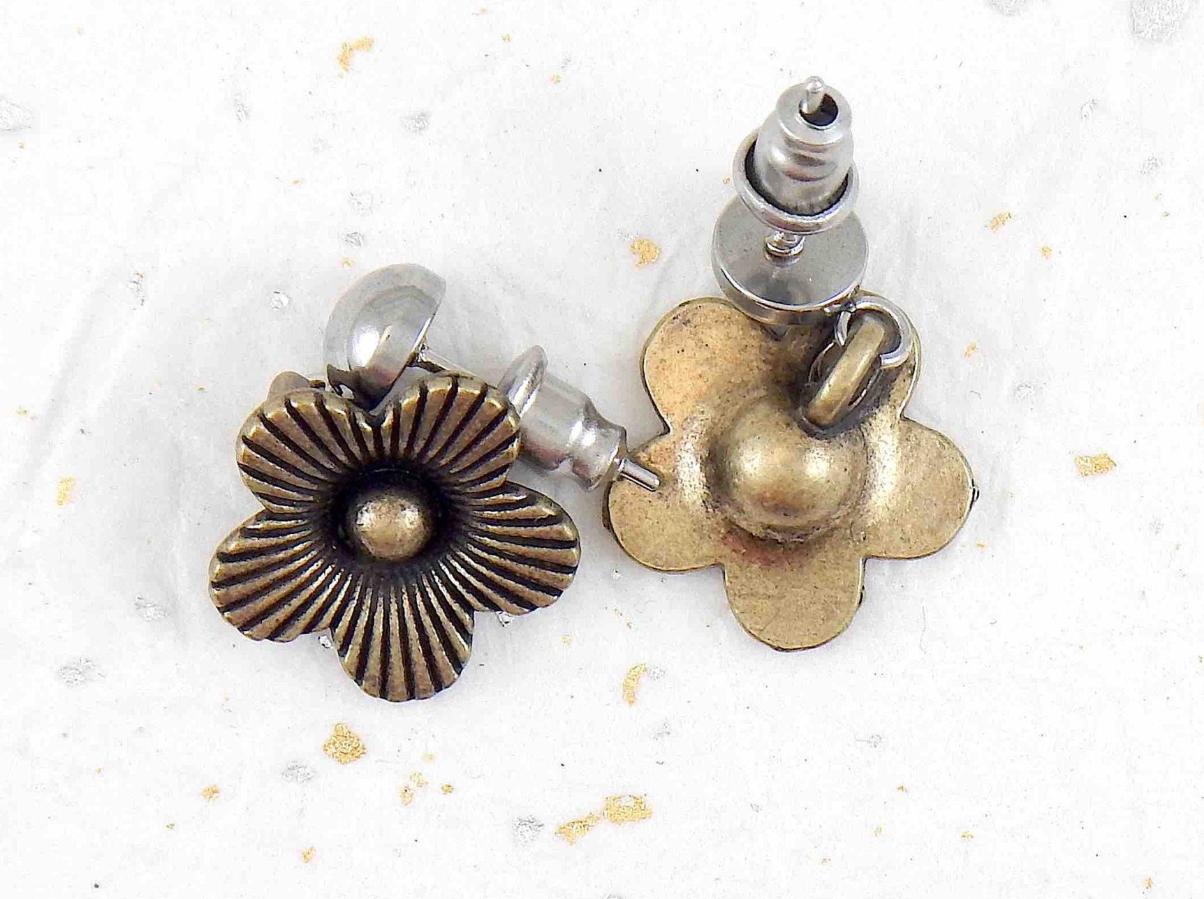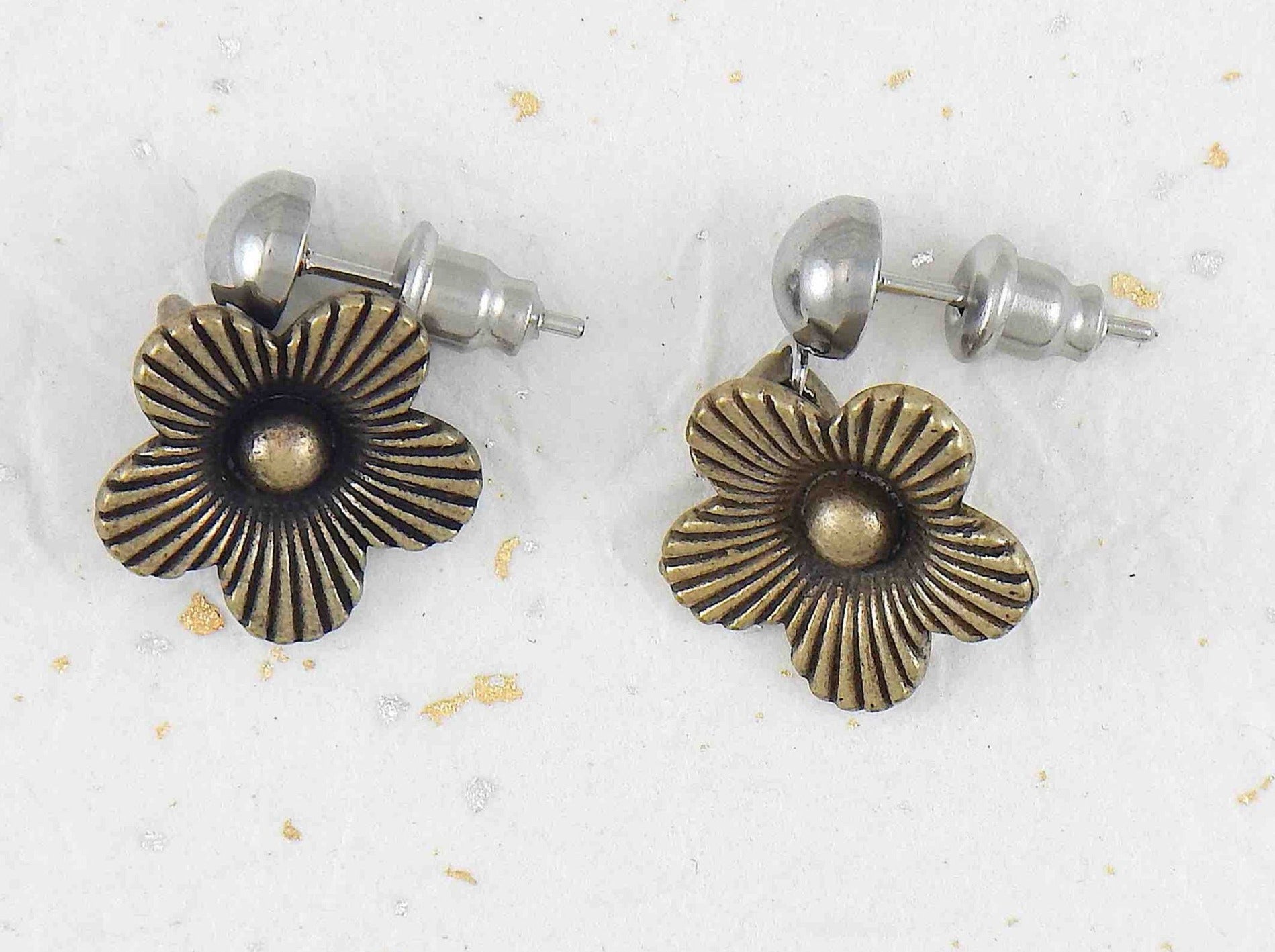 Short earrings with 3-dimensional brass flowers, stainless steel studs