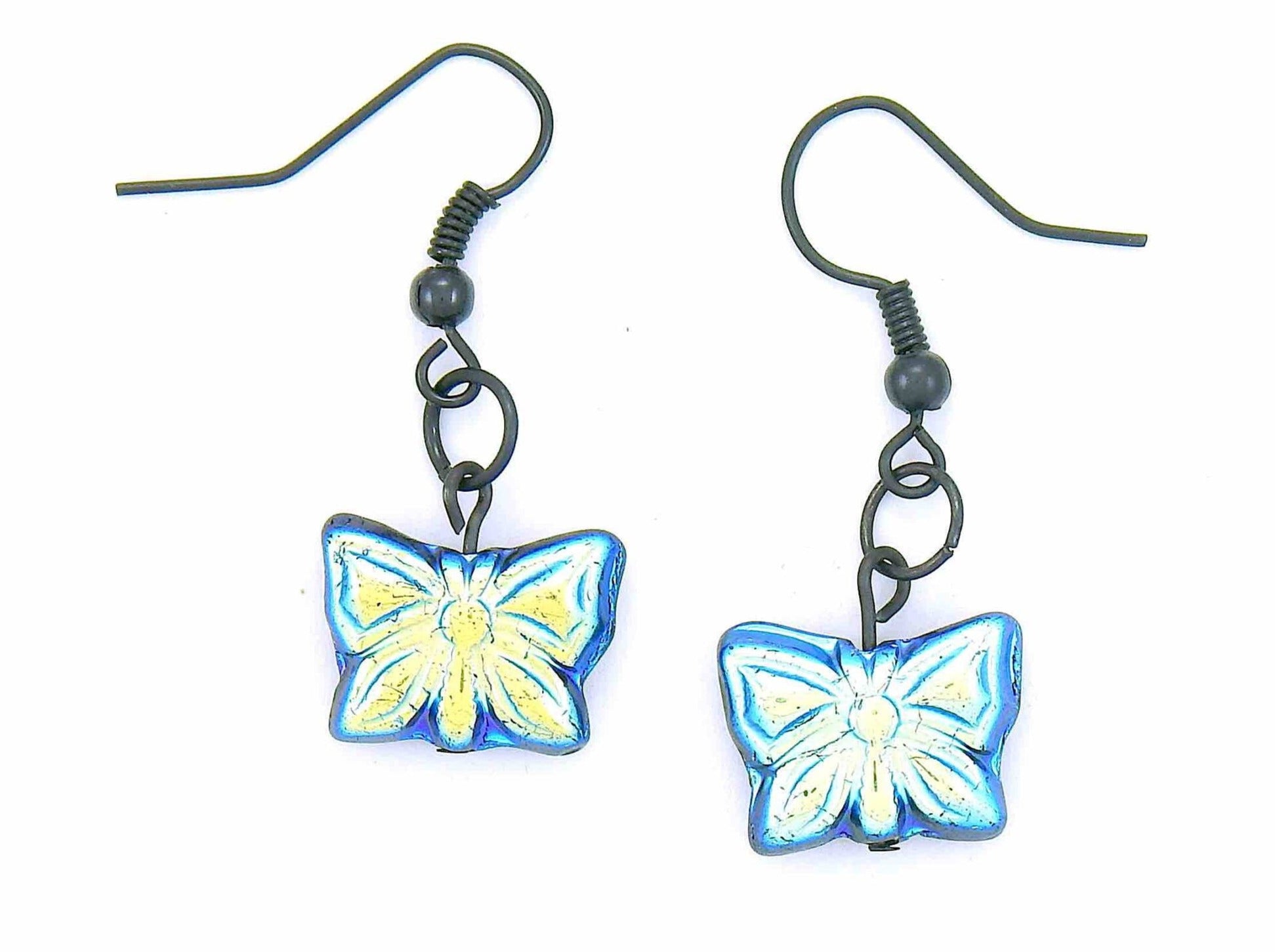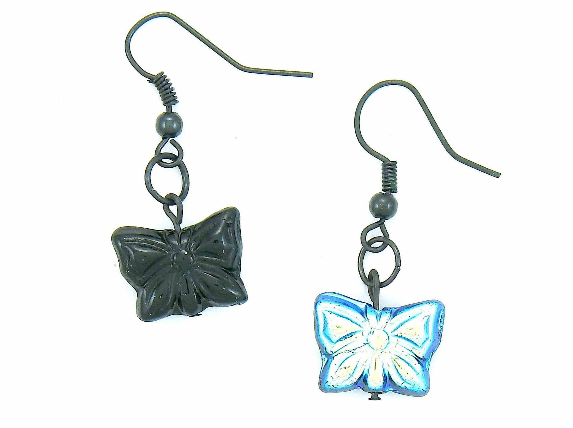 Short earrings with black and iridescent blue Czech glass butterflies, black metal hooks