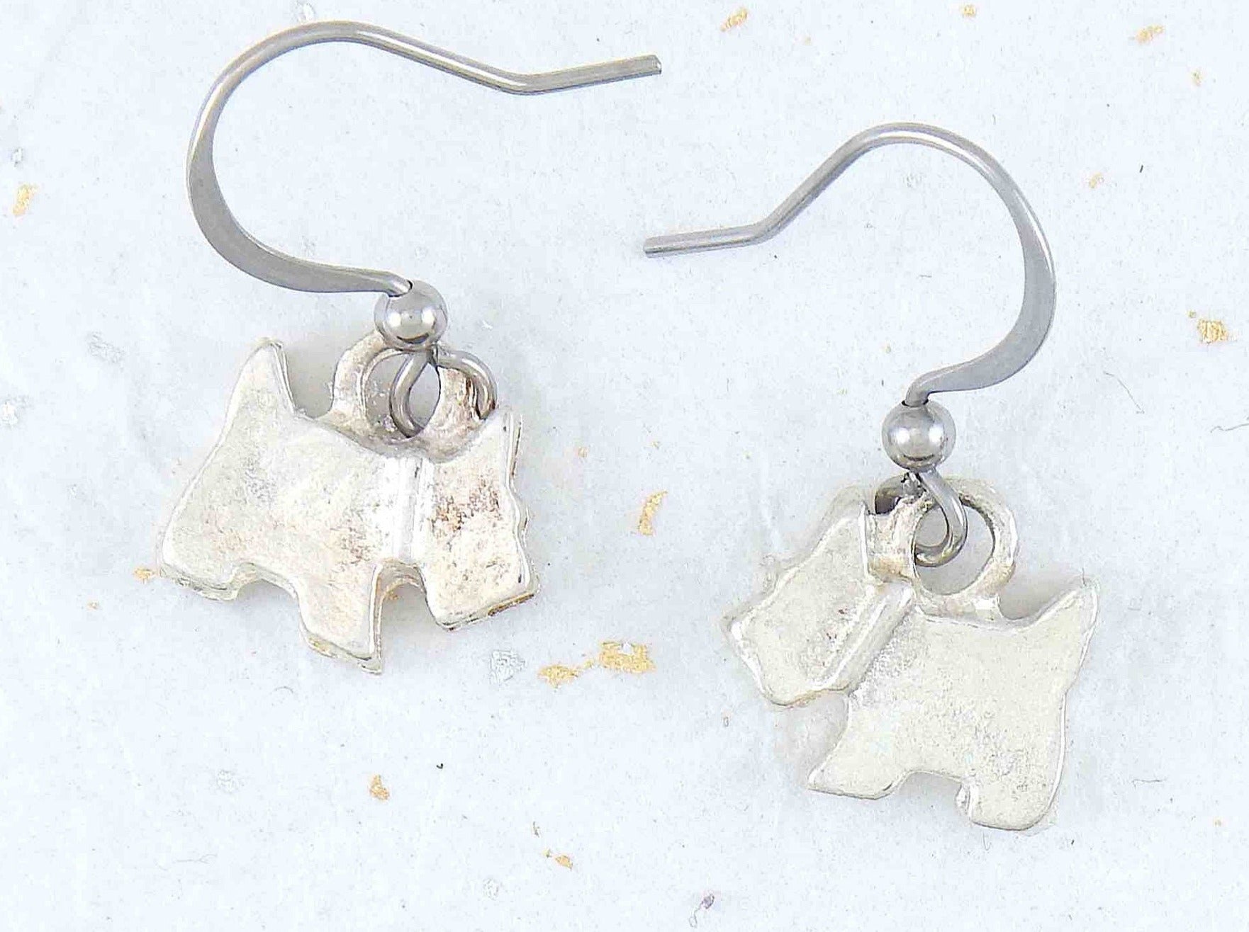 Short earrings with bright silver Scottish Terrier dogs, stainless steel hooks
