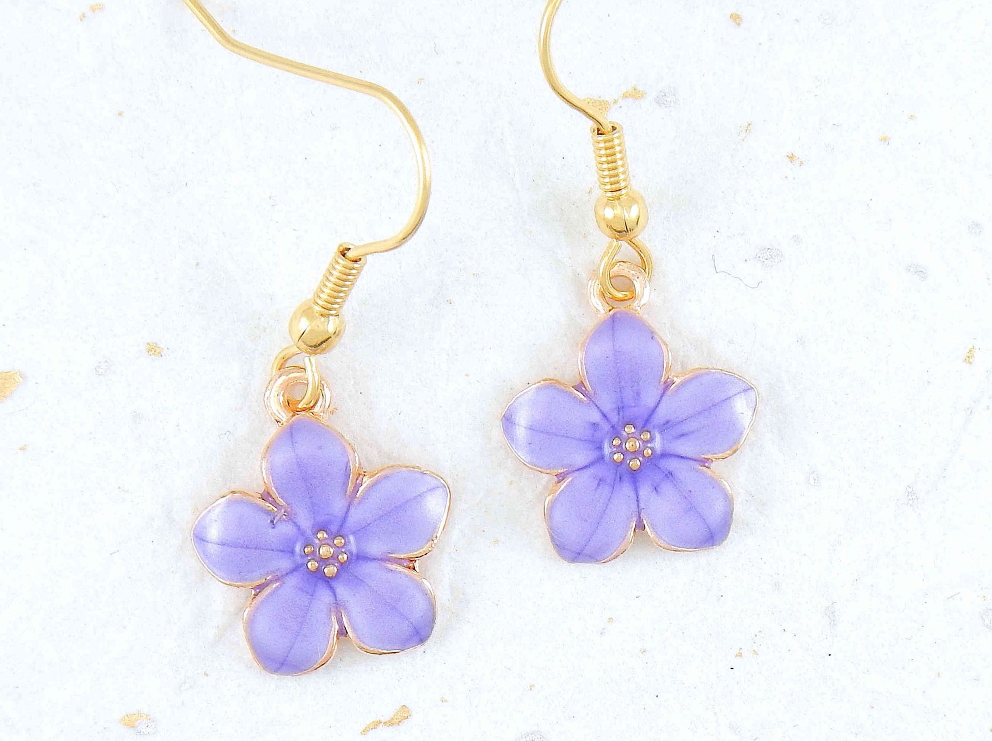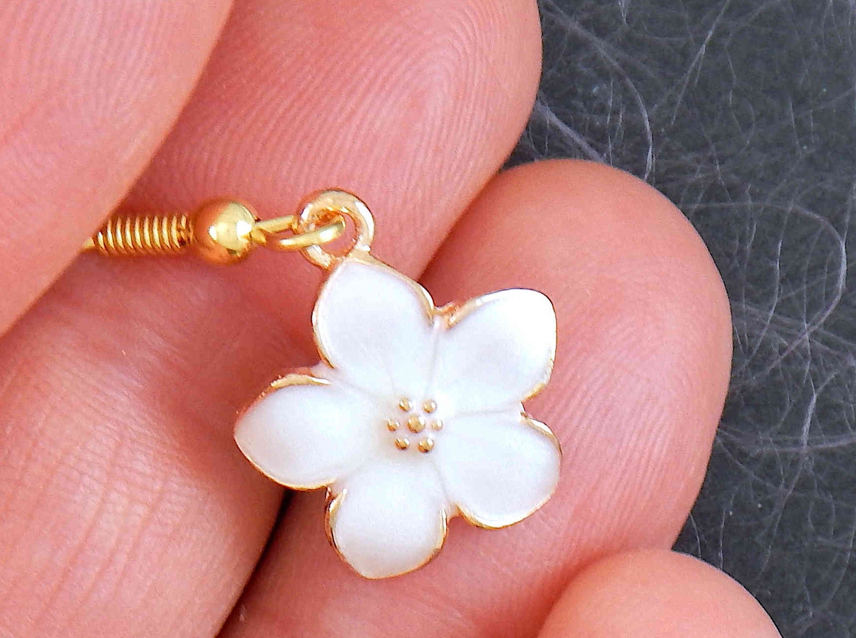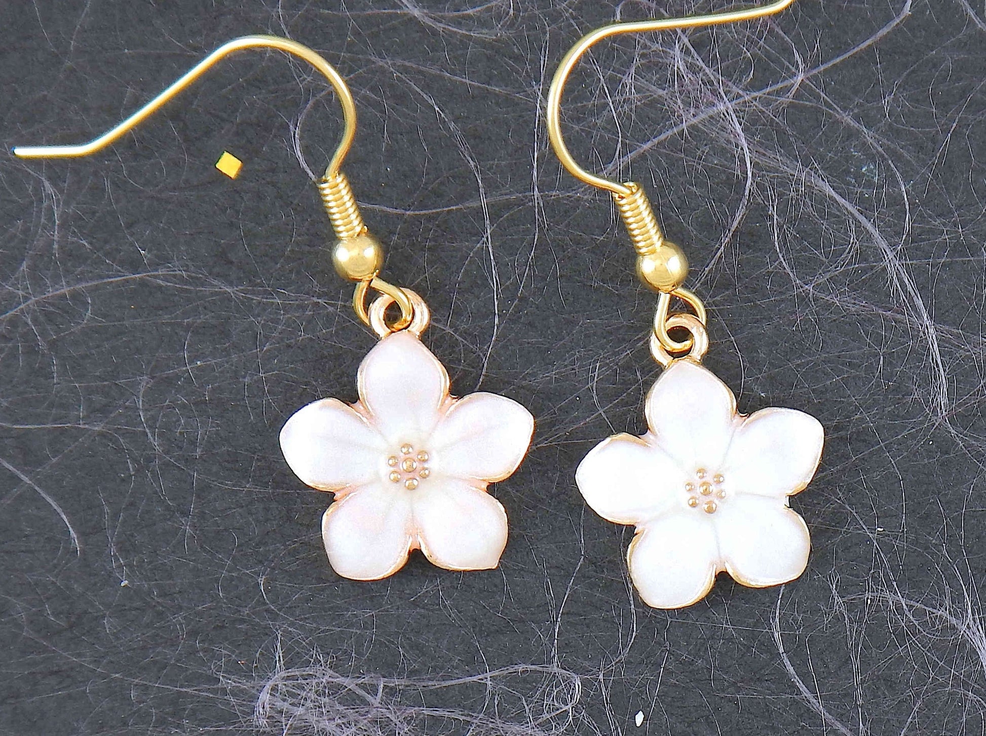 Short earrings with enamelled cherry blossoms (sakura) in 4 pastel colours (white, lilac, pink, blue), gold-toned stainless steel hooks