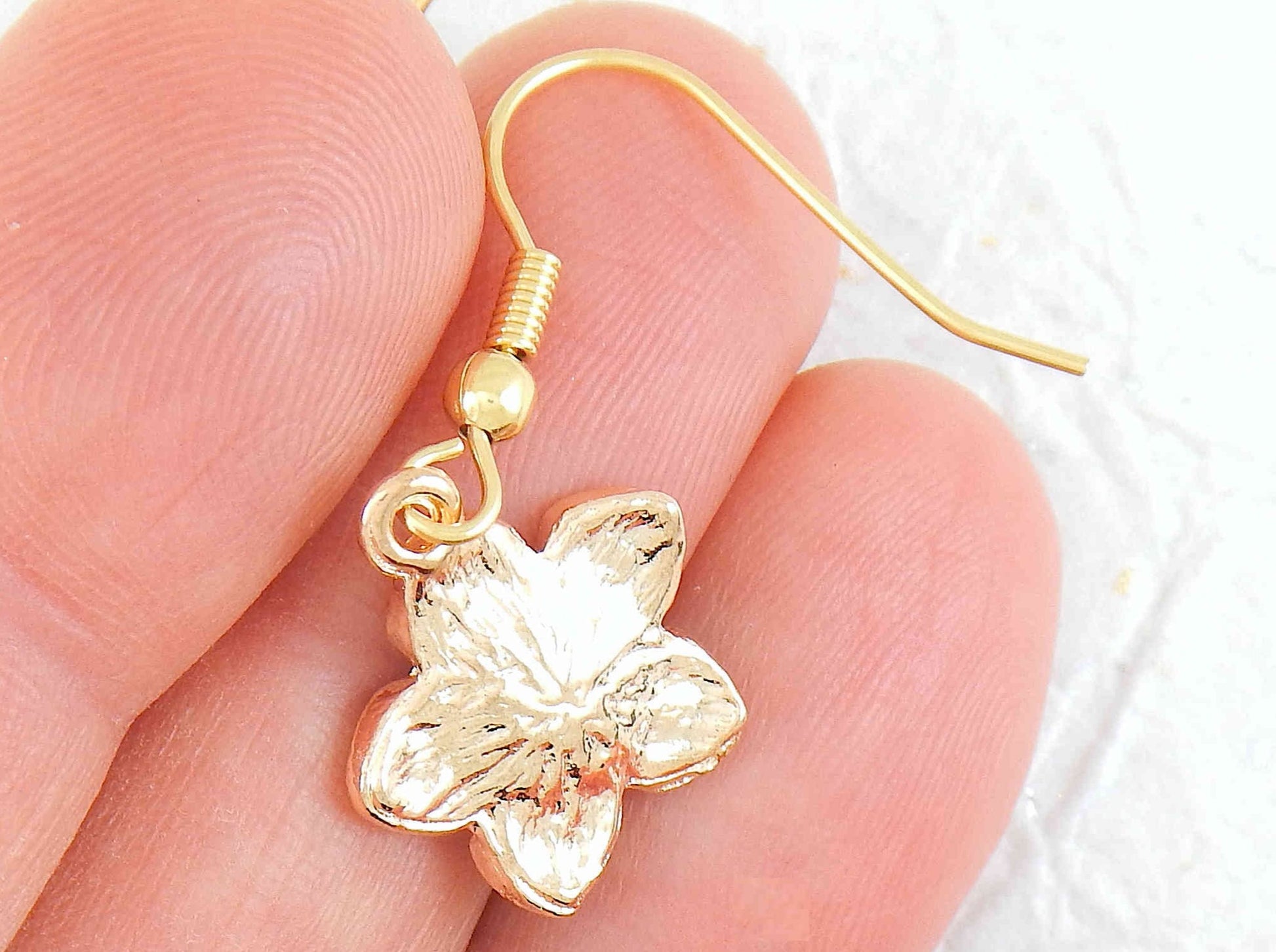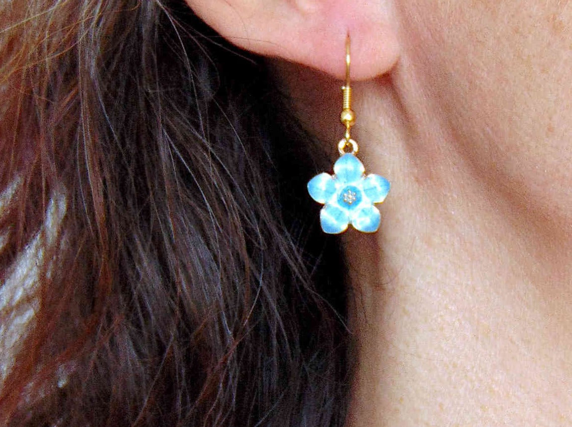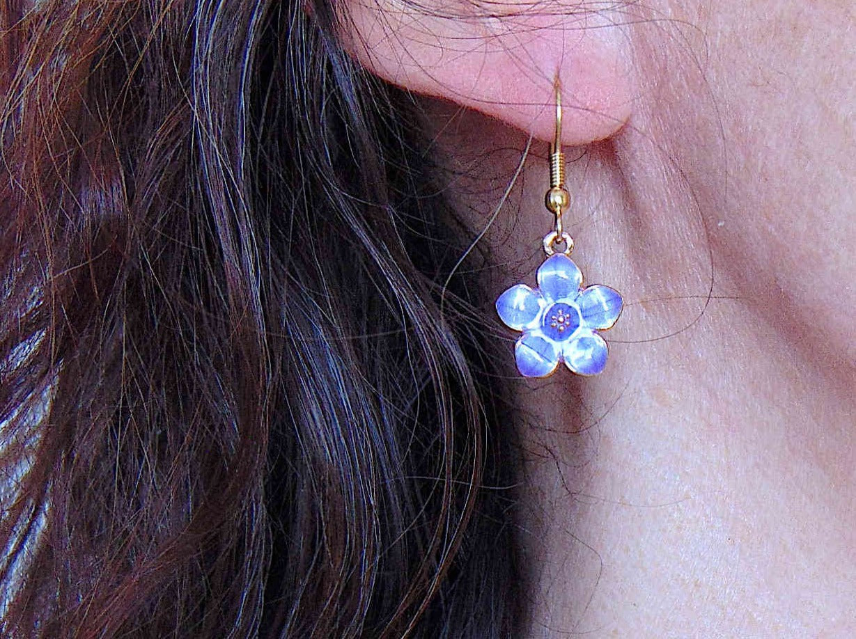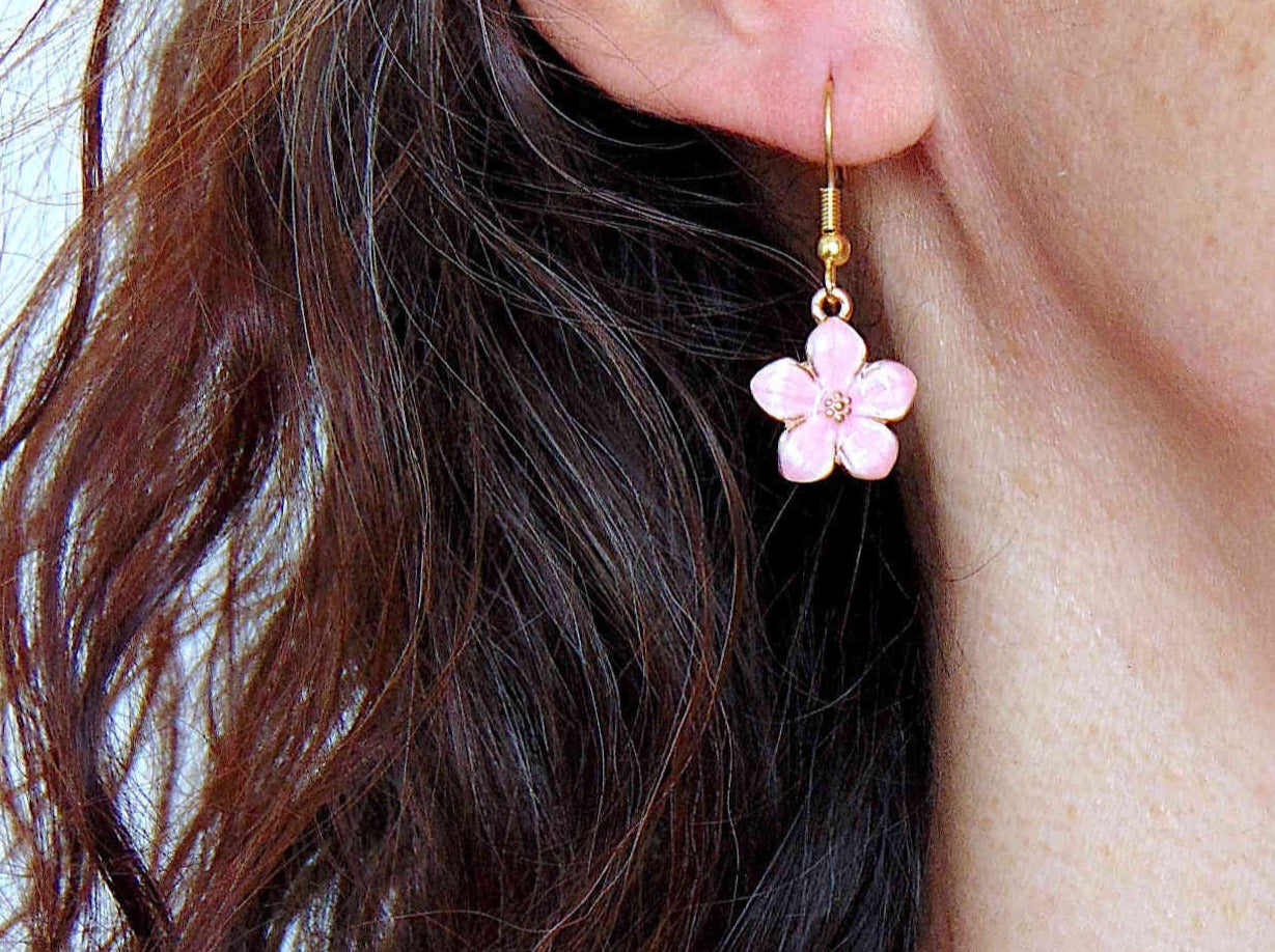 Short earrings with enamelled cherry blossoms (sakura) in 4 pastel colours (white, lilac, pink, blue), gold-toned stainless steel hooks
