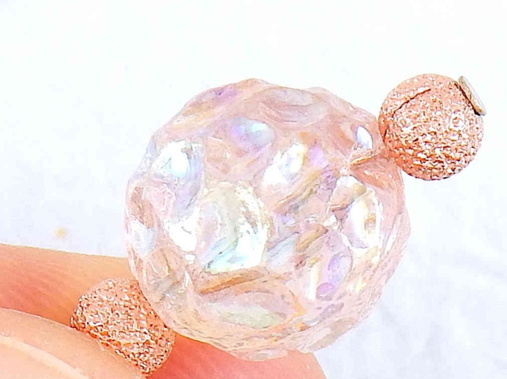 Short earrings with iridescent light peach vintage glass raspberry beads, rose gold-toned stainless steel hooks
