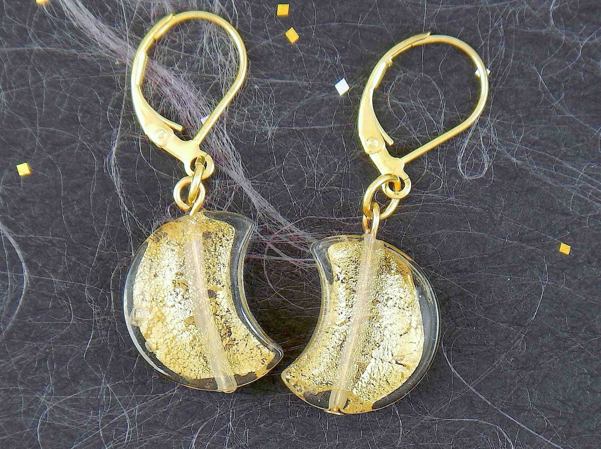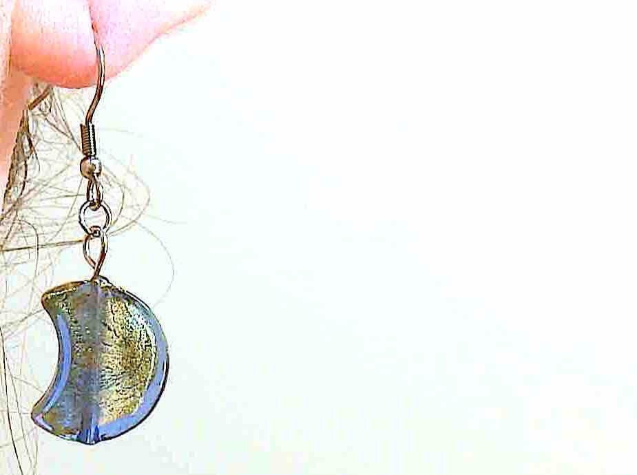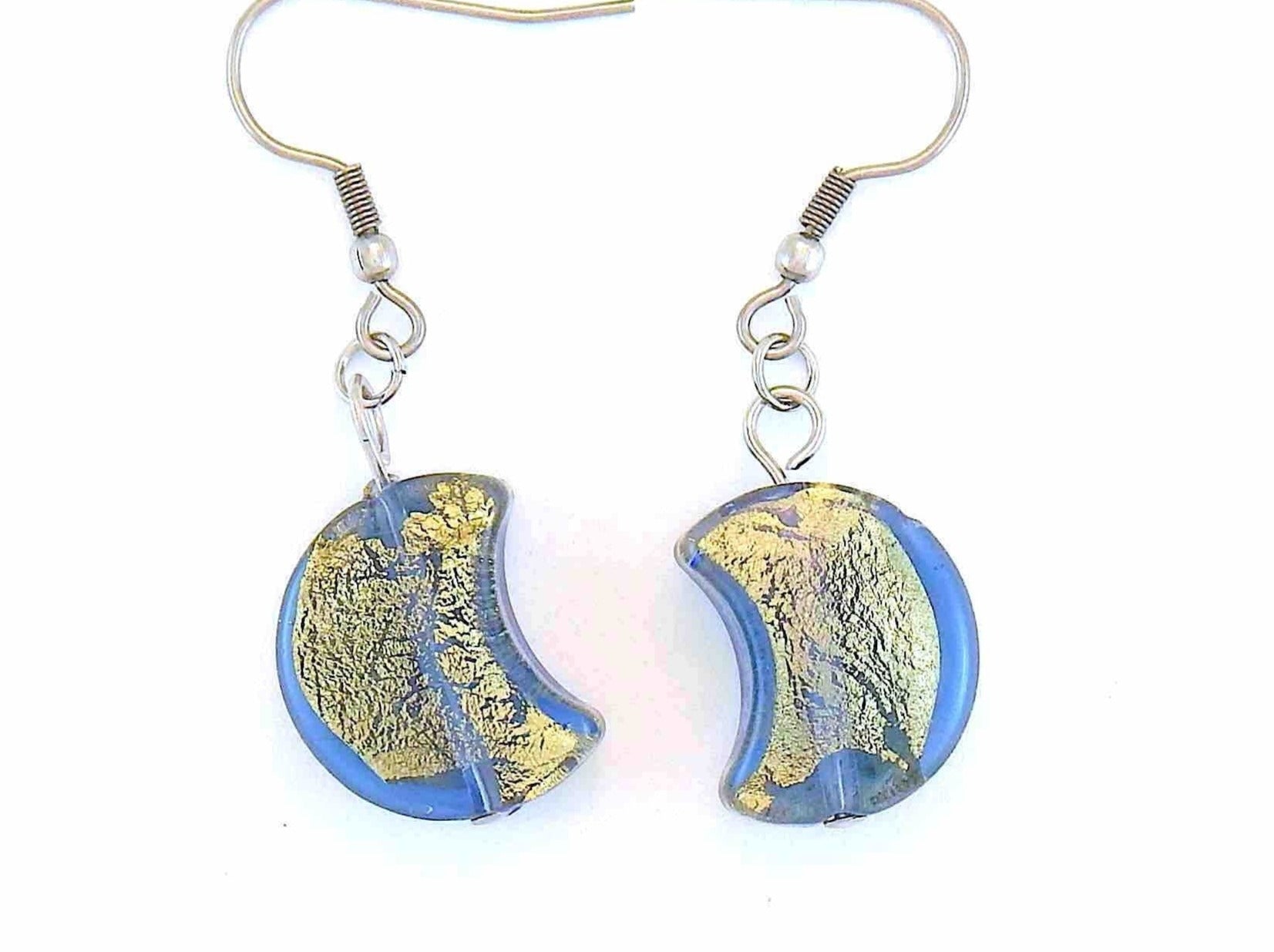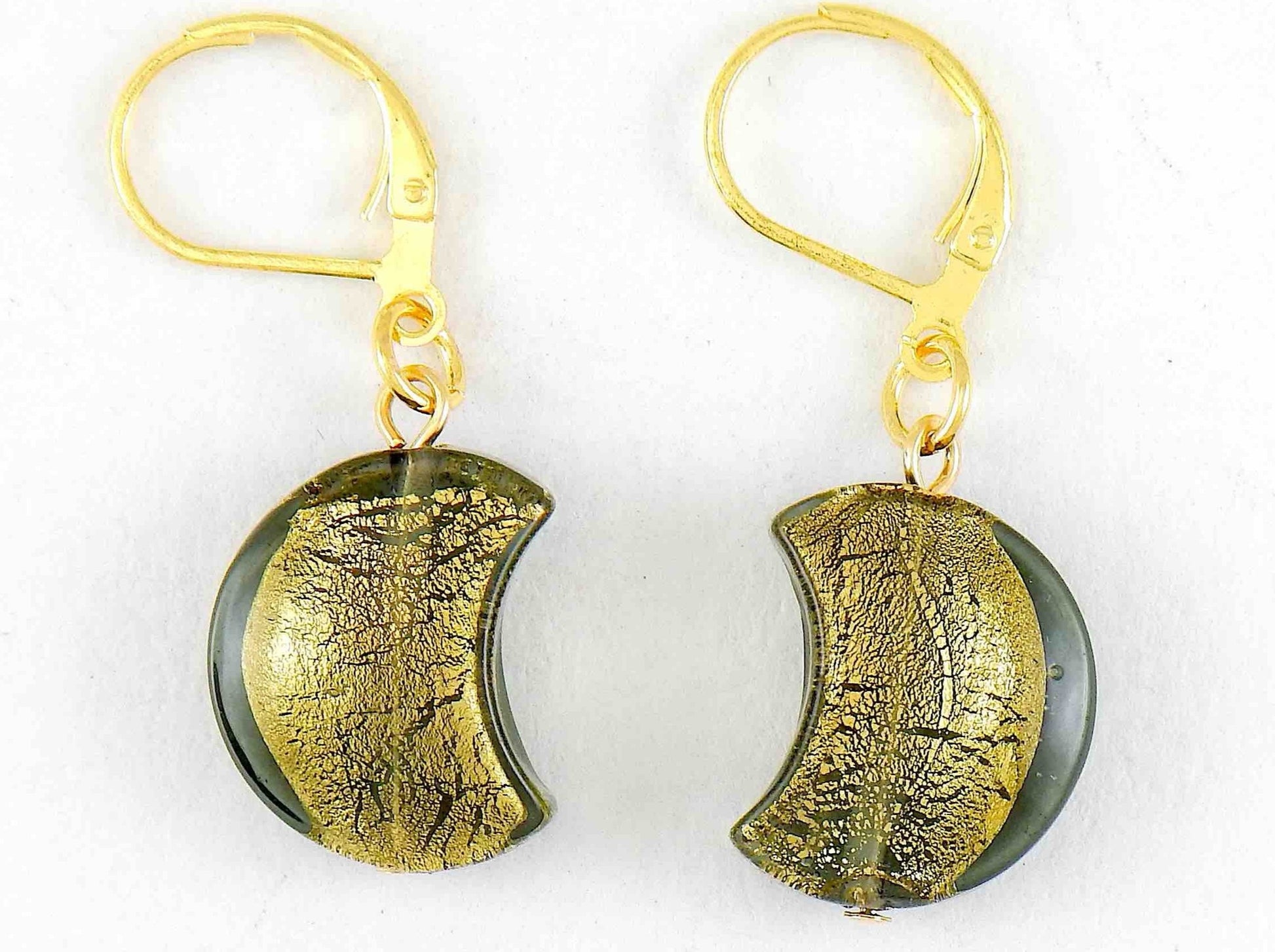 Short earrings with Murano glass half-moons, gold foil, available in 3 colours (clear, blue, khaki), gold-toned stainless steel lever back hooks