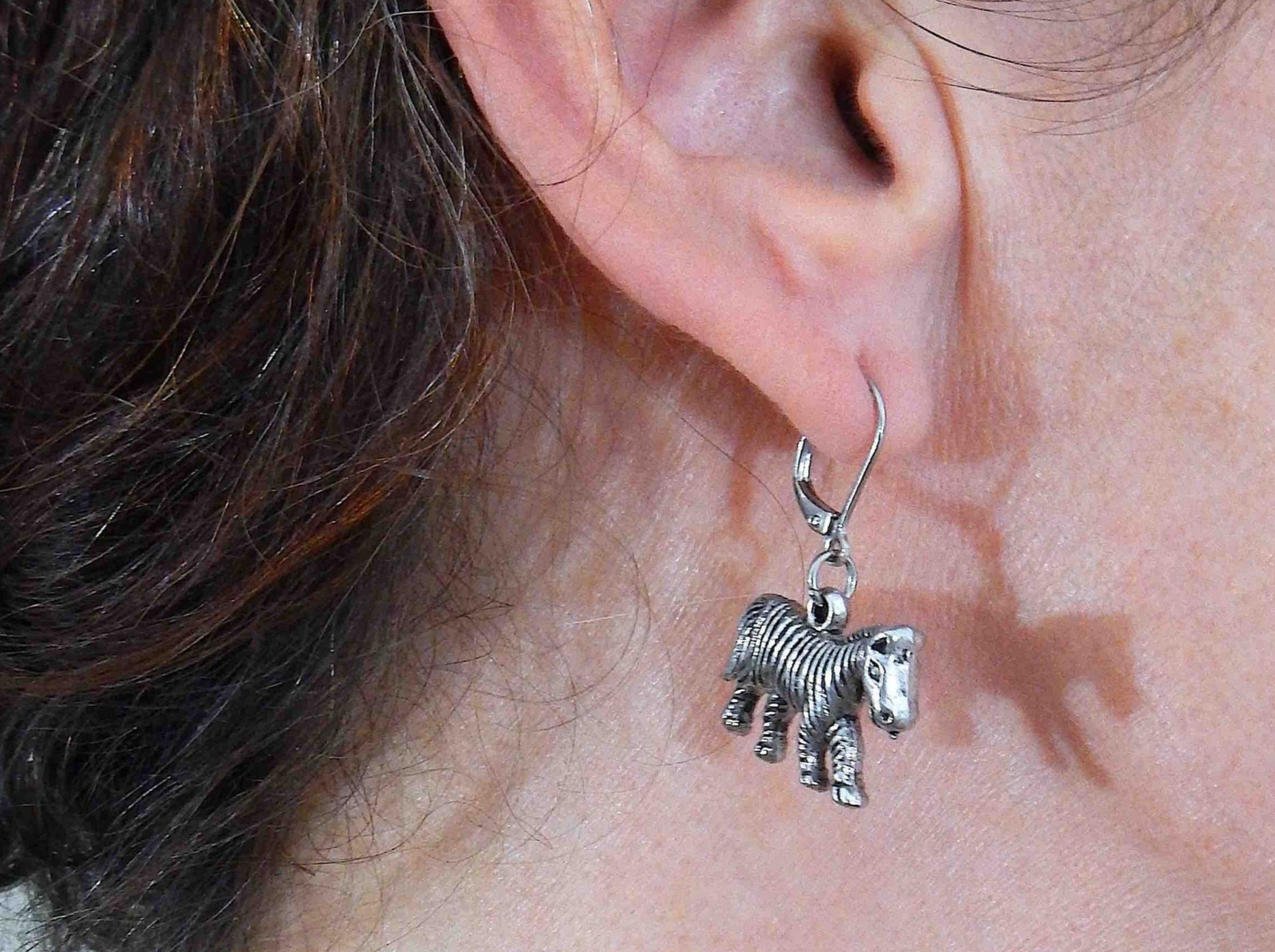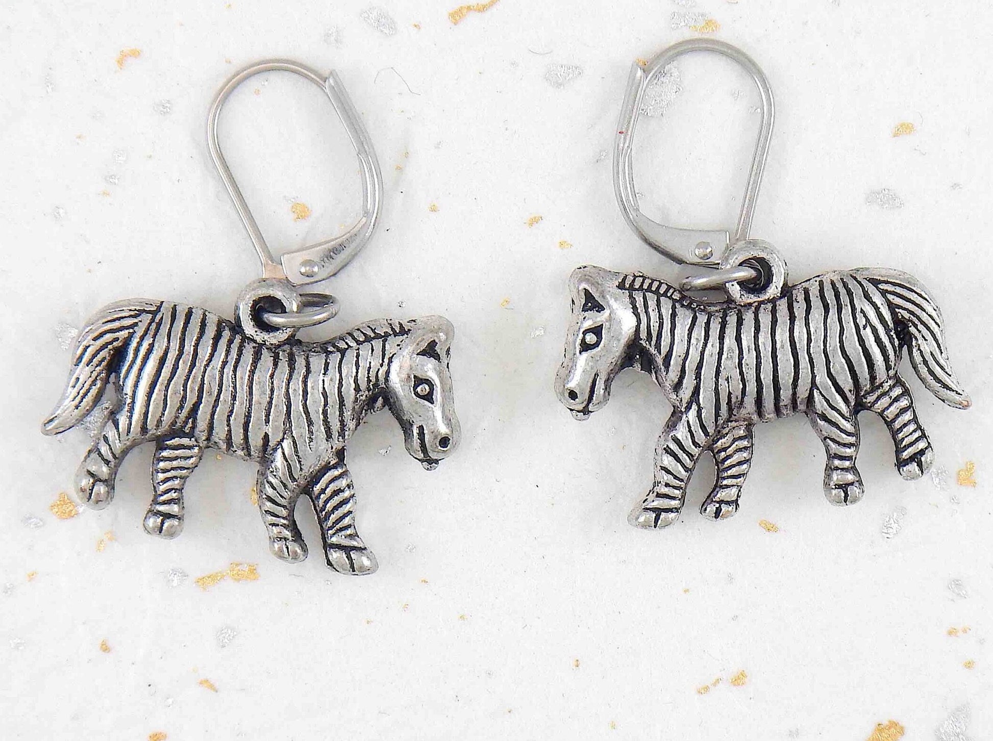 Short earrings with pewter zebras, stainless steel lever back hooks
