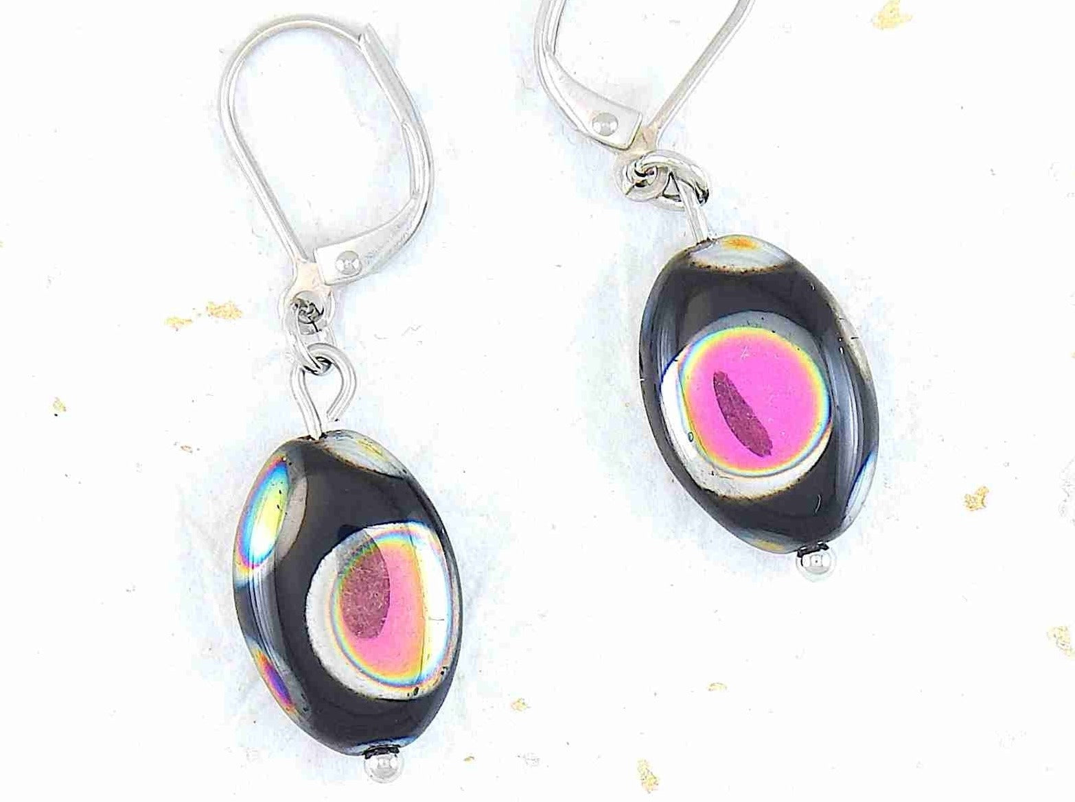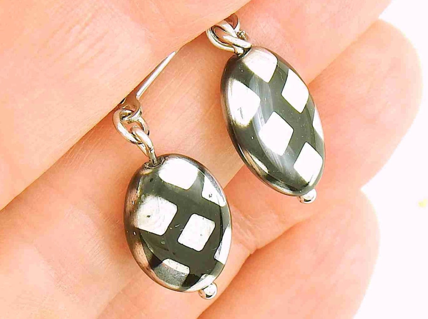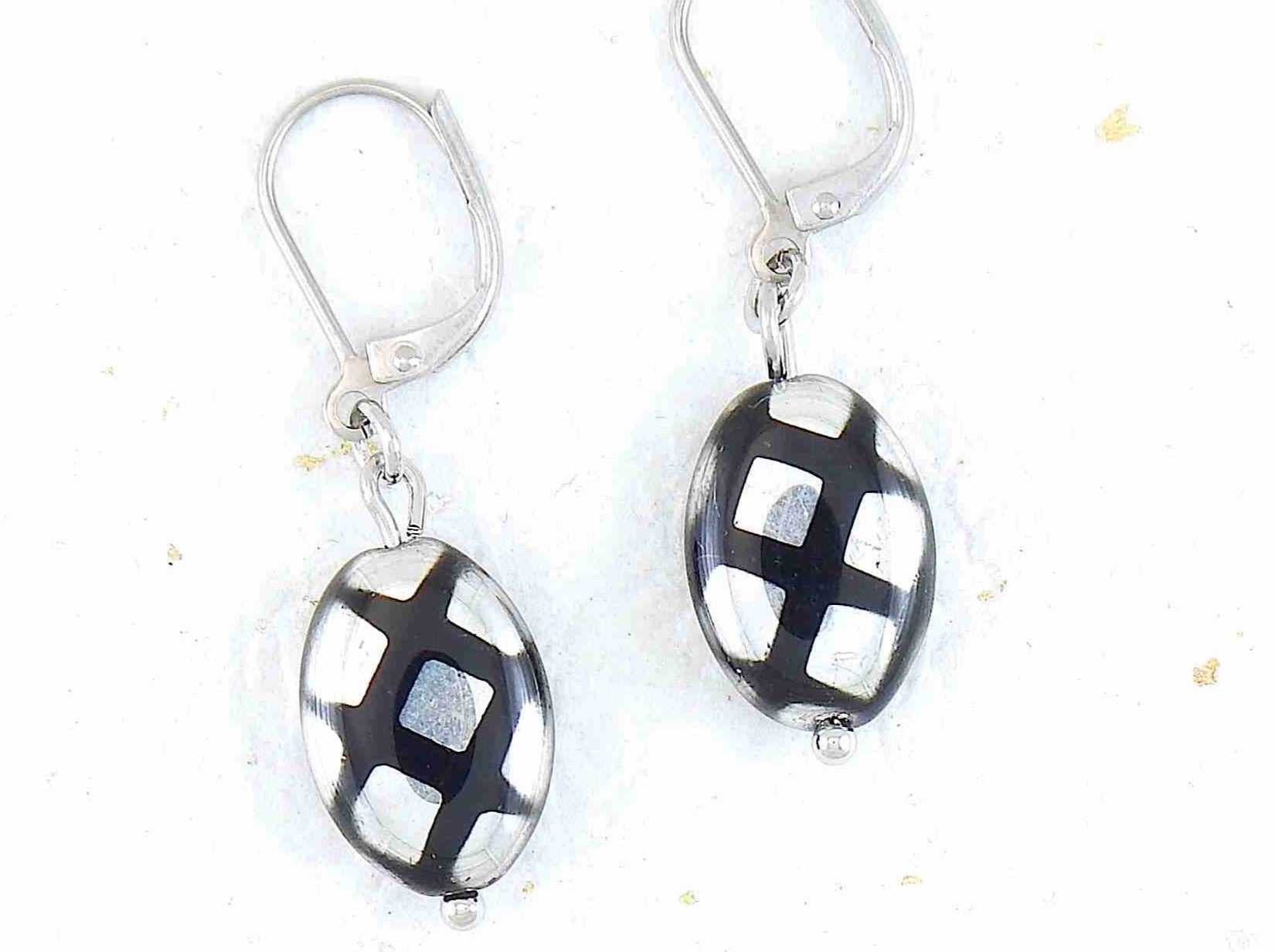 Short earrings with shiny black Czech glass ovals, choice of 2 patterns (multicoloured dots, silver criss-cross), stainless steel lever back hooks