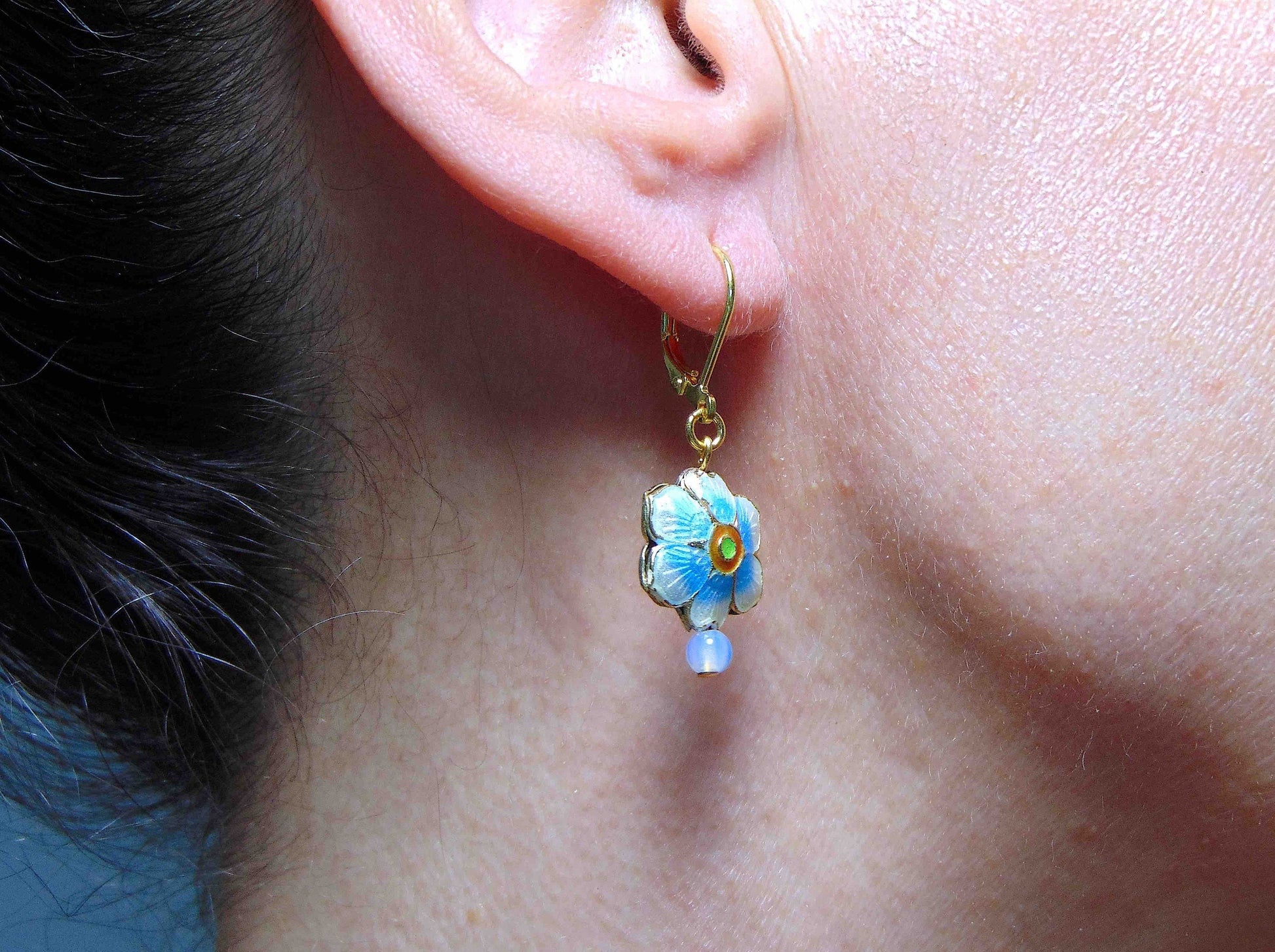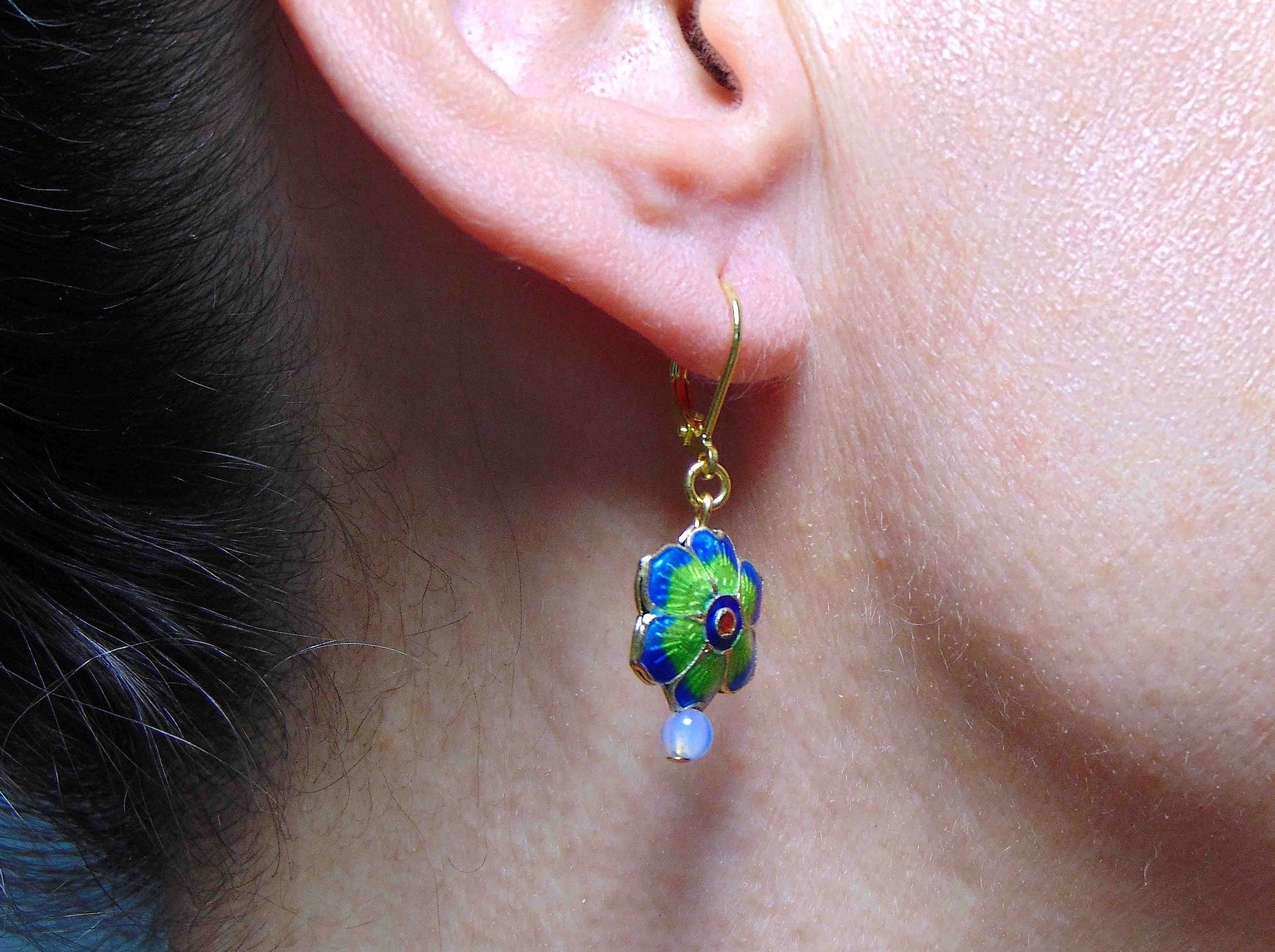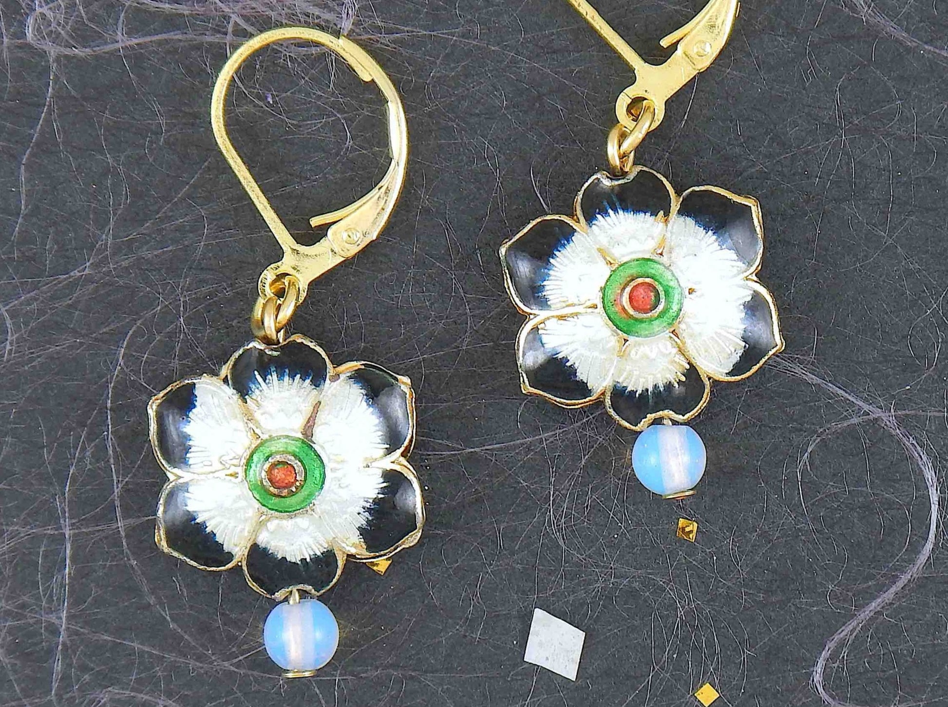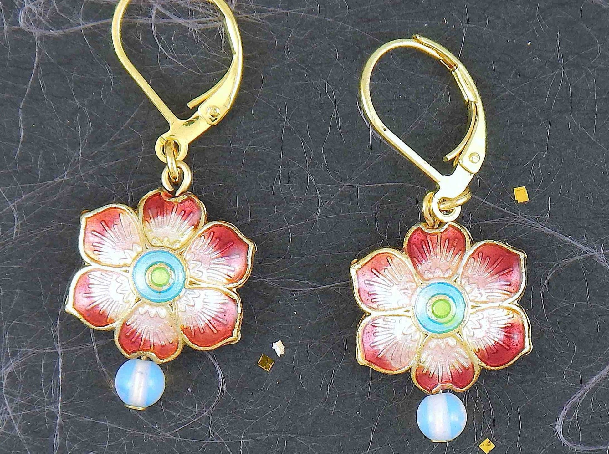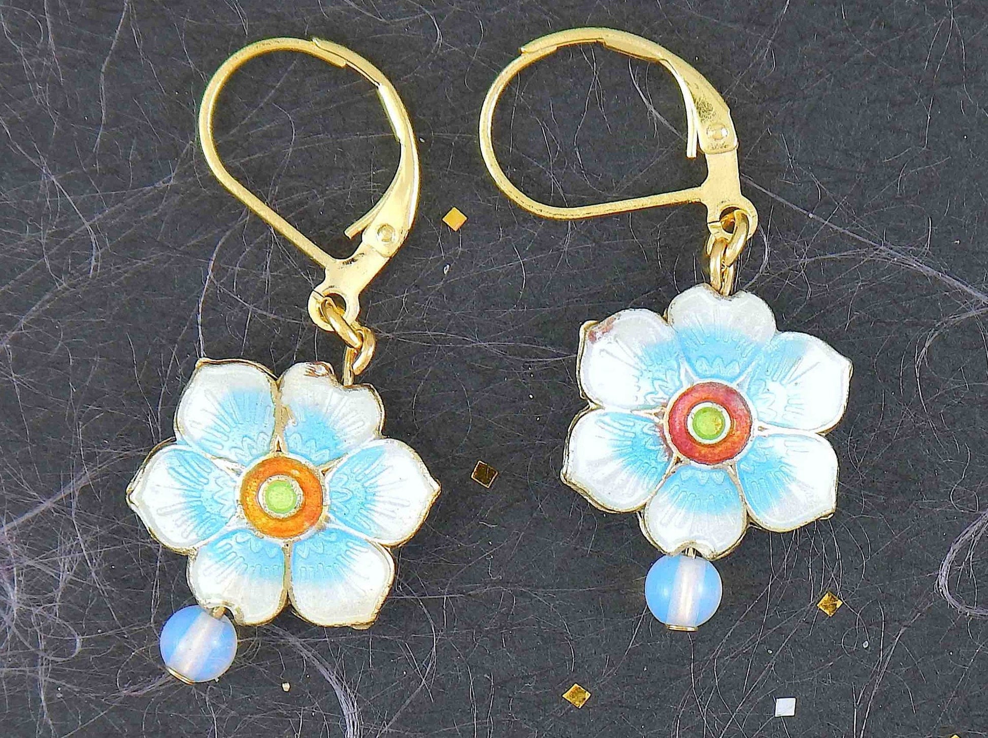 Short earrings with small enamelled flowers offered in 6 colours, synthetic moonstone (opalite), gold-toned stainless steel lever back hooks