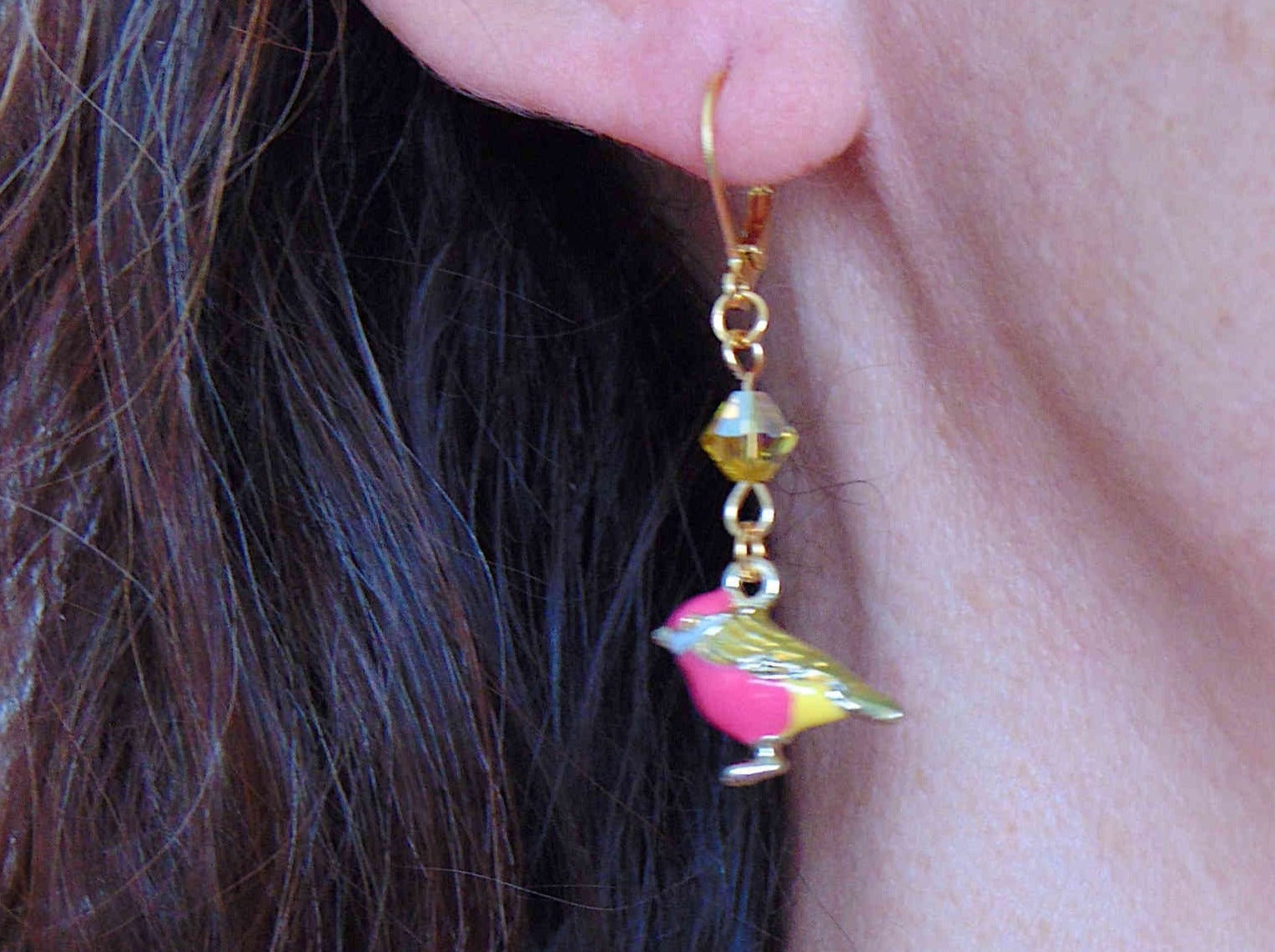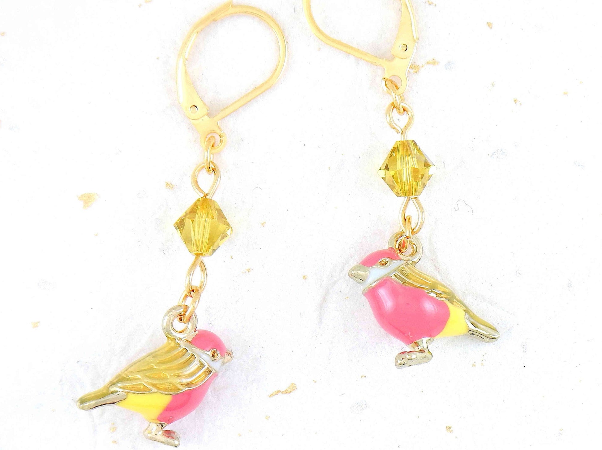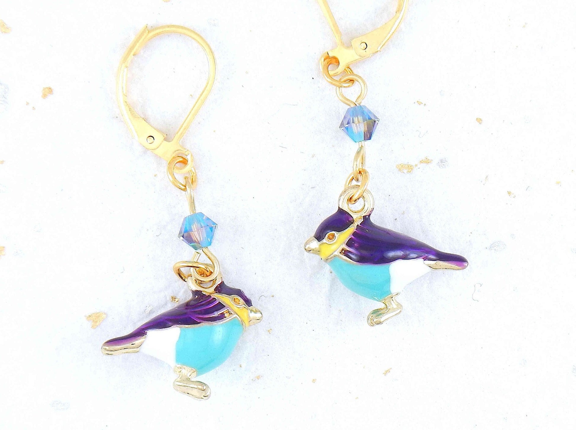 Short earrings with small plump enamelled birds in 2 colours, Swarovski crystals, gold-toned stainless steel lever back hooks