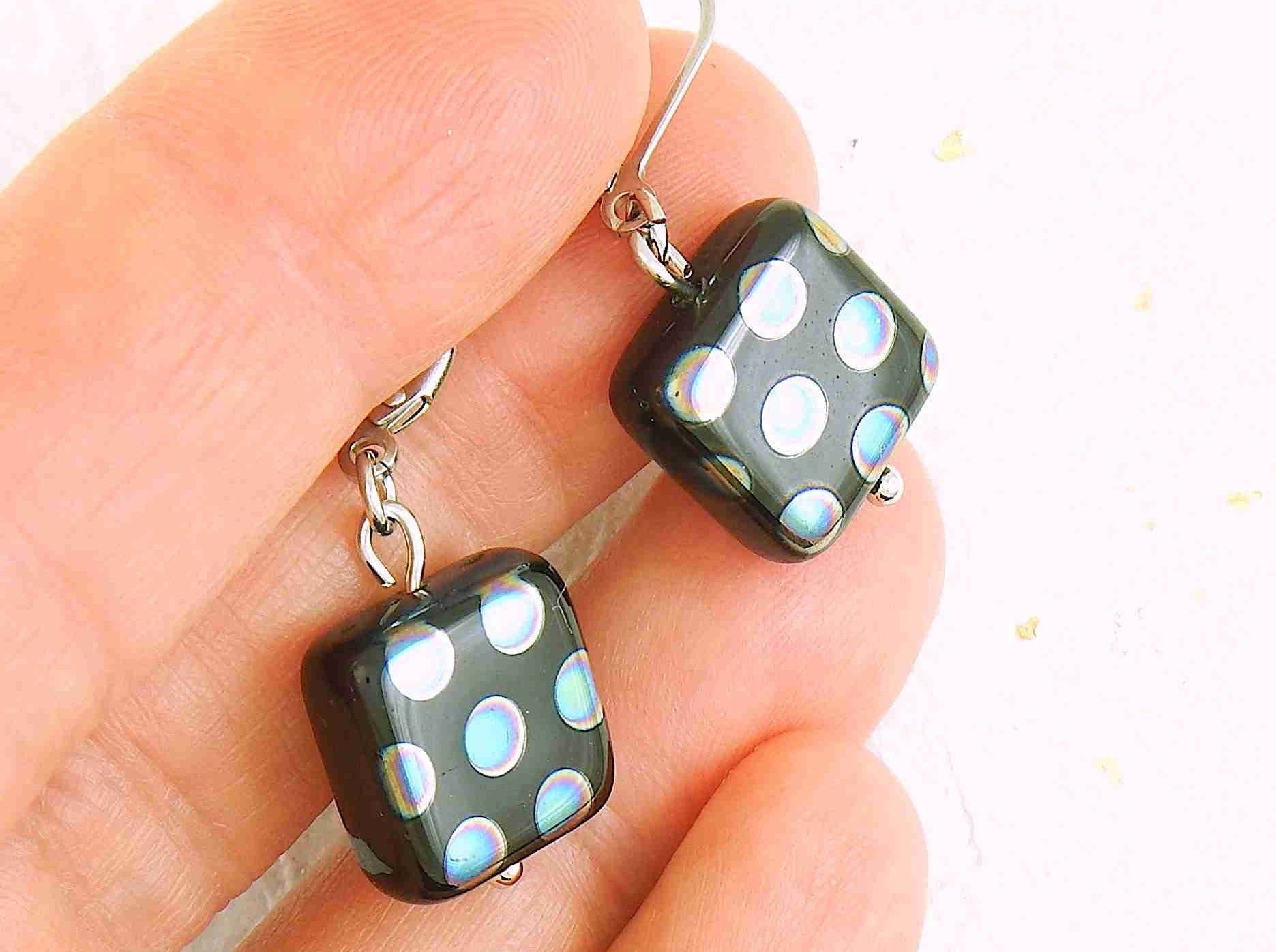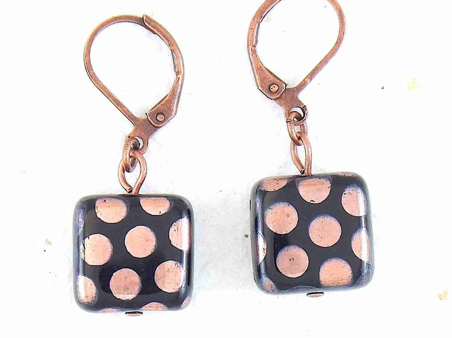Short earrings with small shiny black Czech glass squares, small multicolored or copper dots, silver or rose gold-toned stainless steel lever back hooks