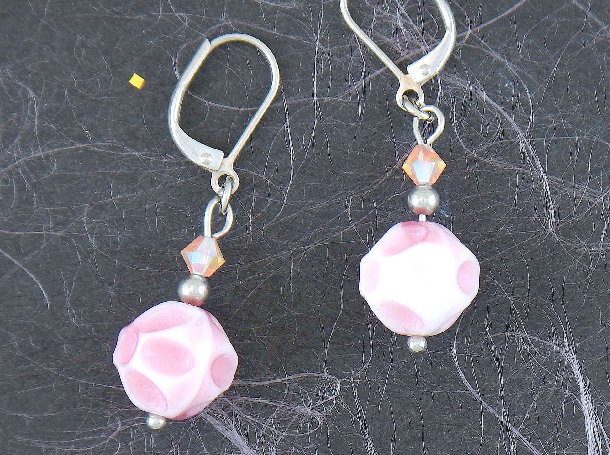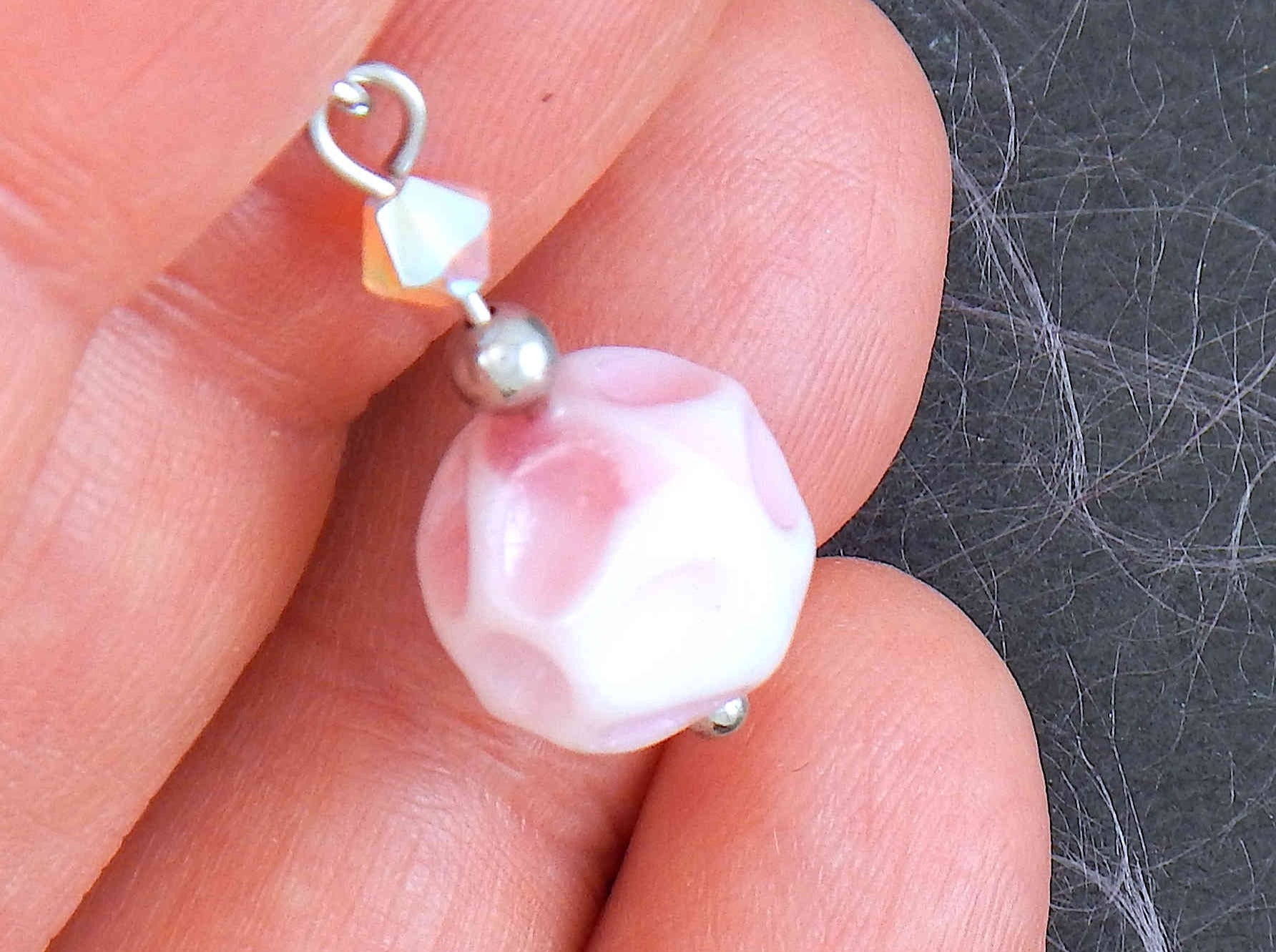 Short earrings with soft pink vintage glass crater balls, iridescent light pink Swarovski crystals, stainless steel lever back hooks