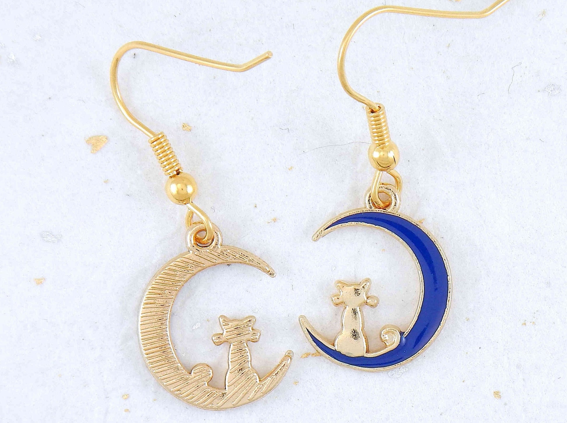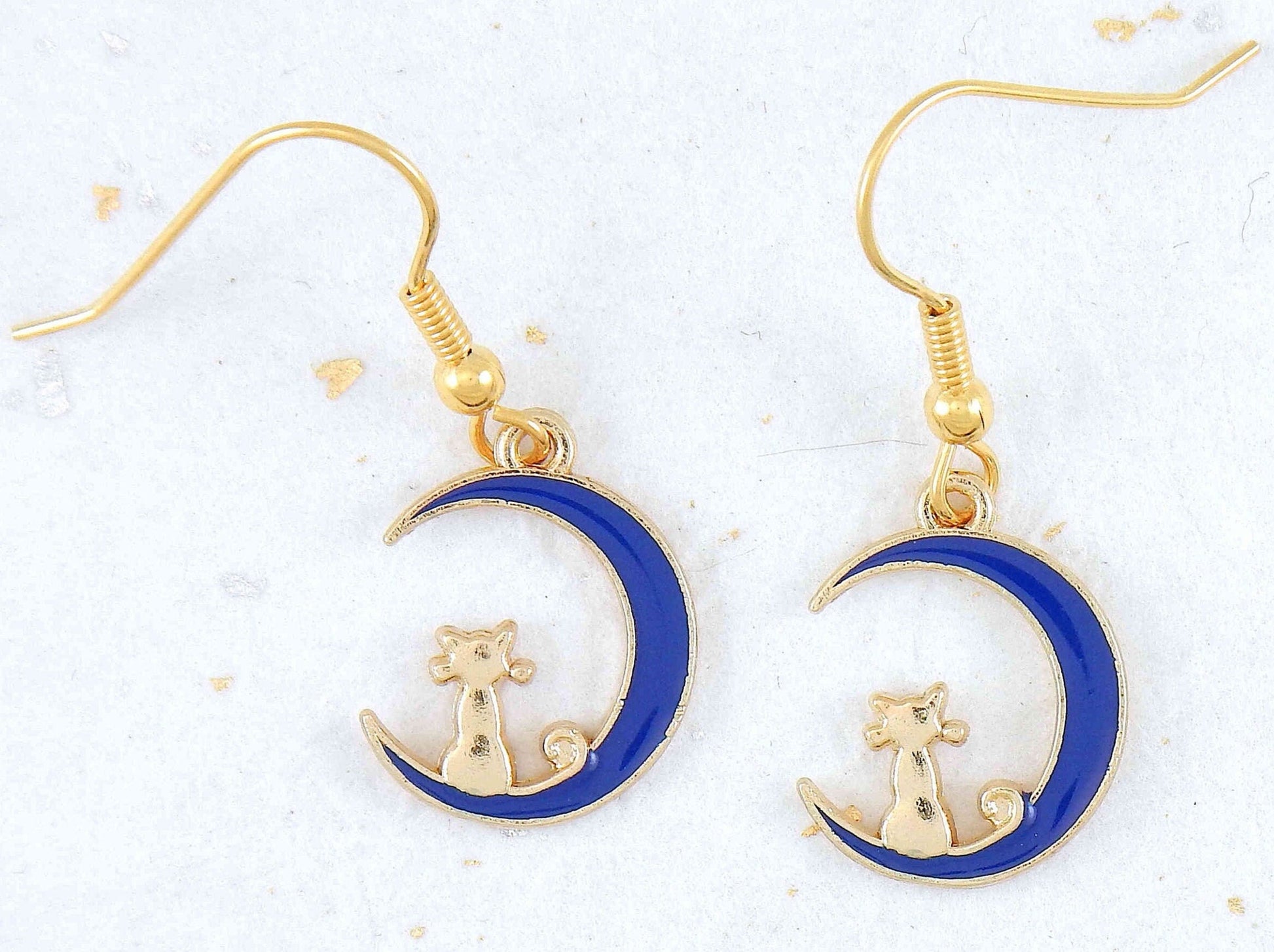 Short earrings with tiny gold cats sitting on blue enamelled moon crescents, gold-toned stainless steel hooks