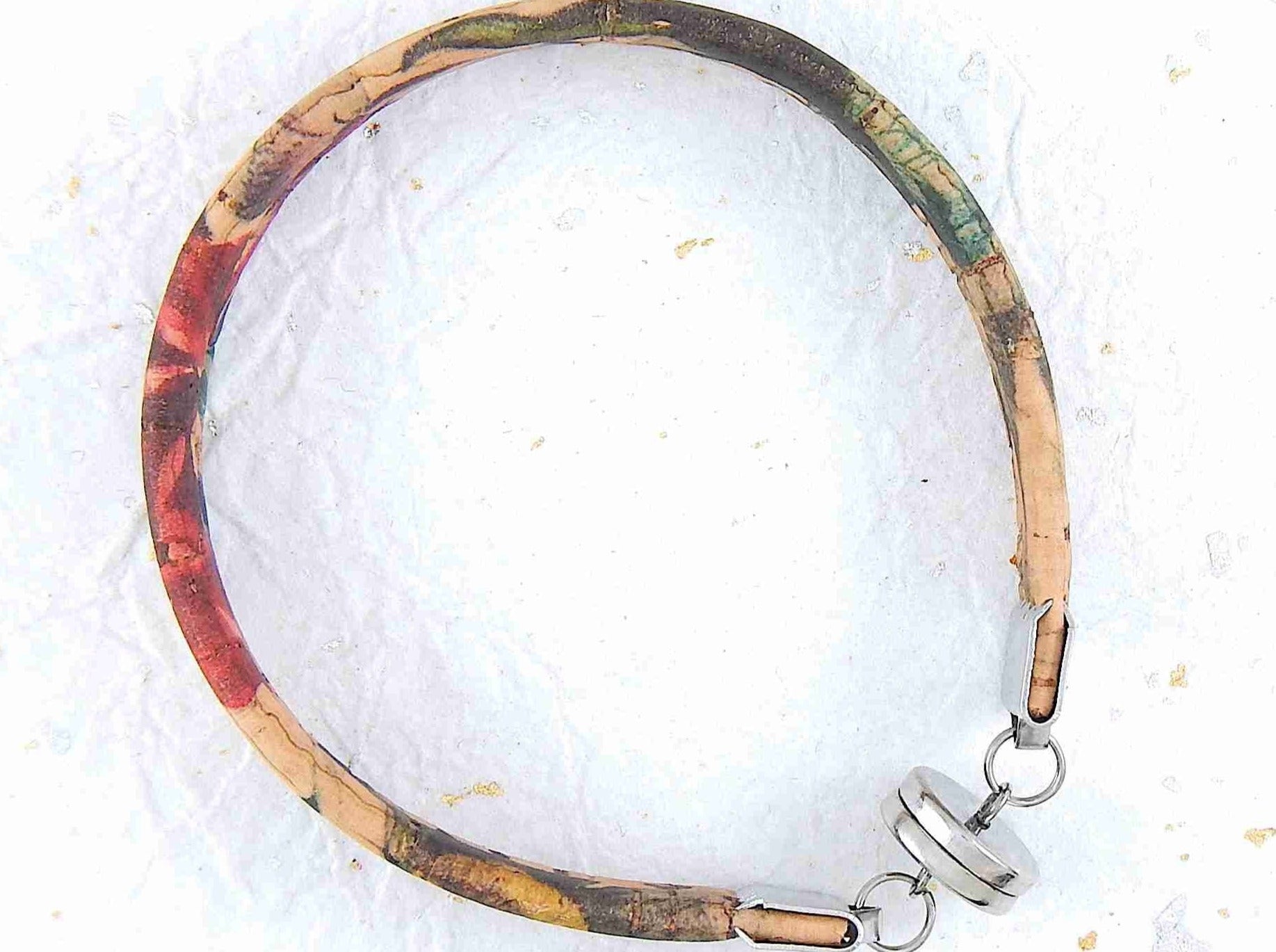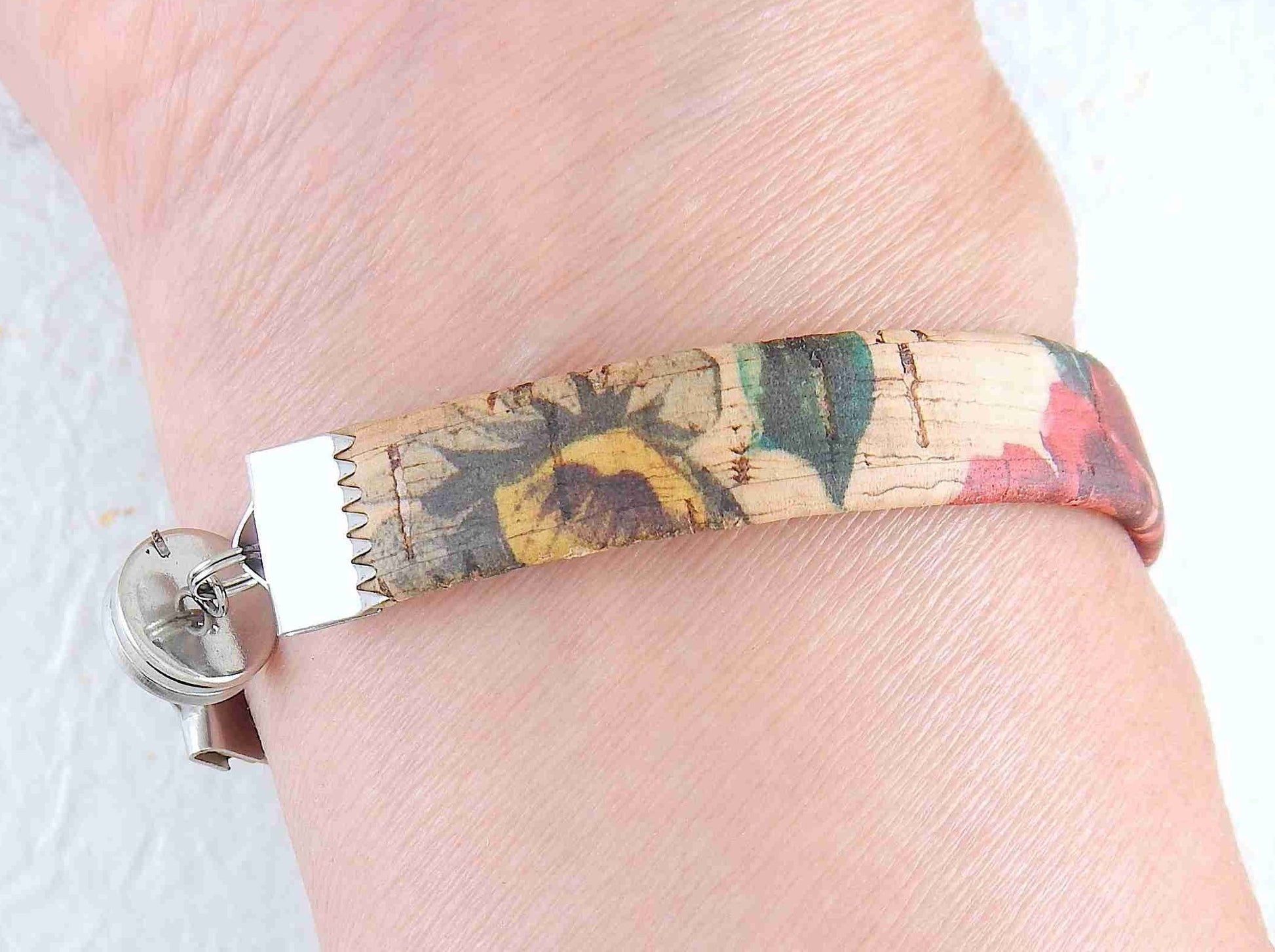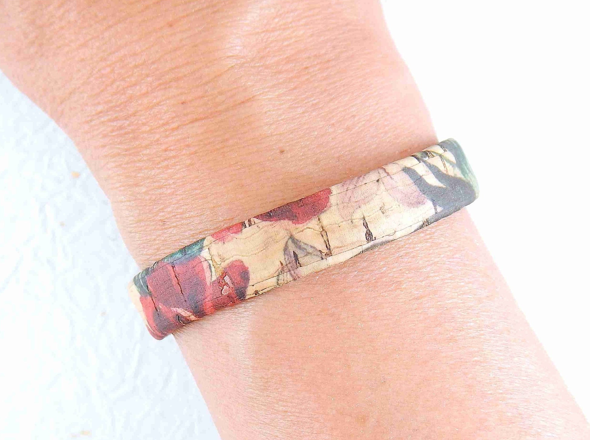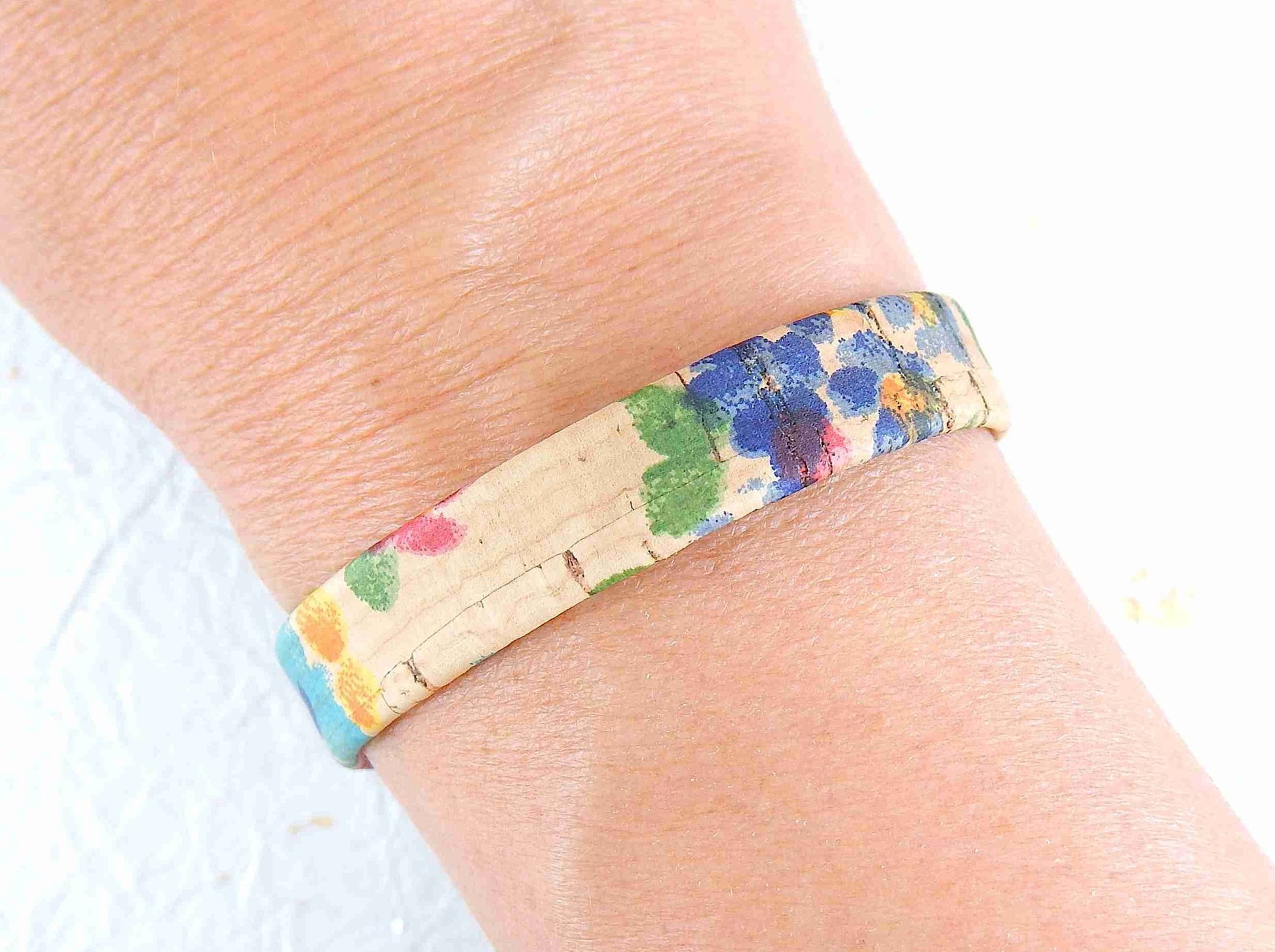 Simple 10 mm flat cork bracelet with magnetic stainless steel clasp in 2 flower patterns (soft or bright colours)