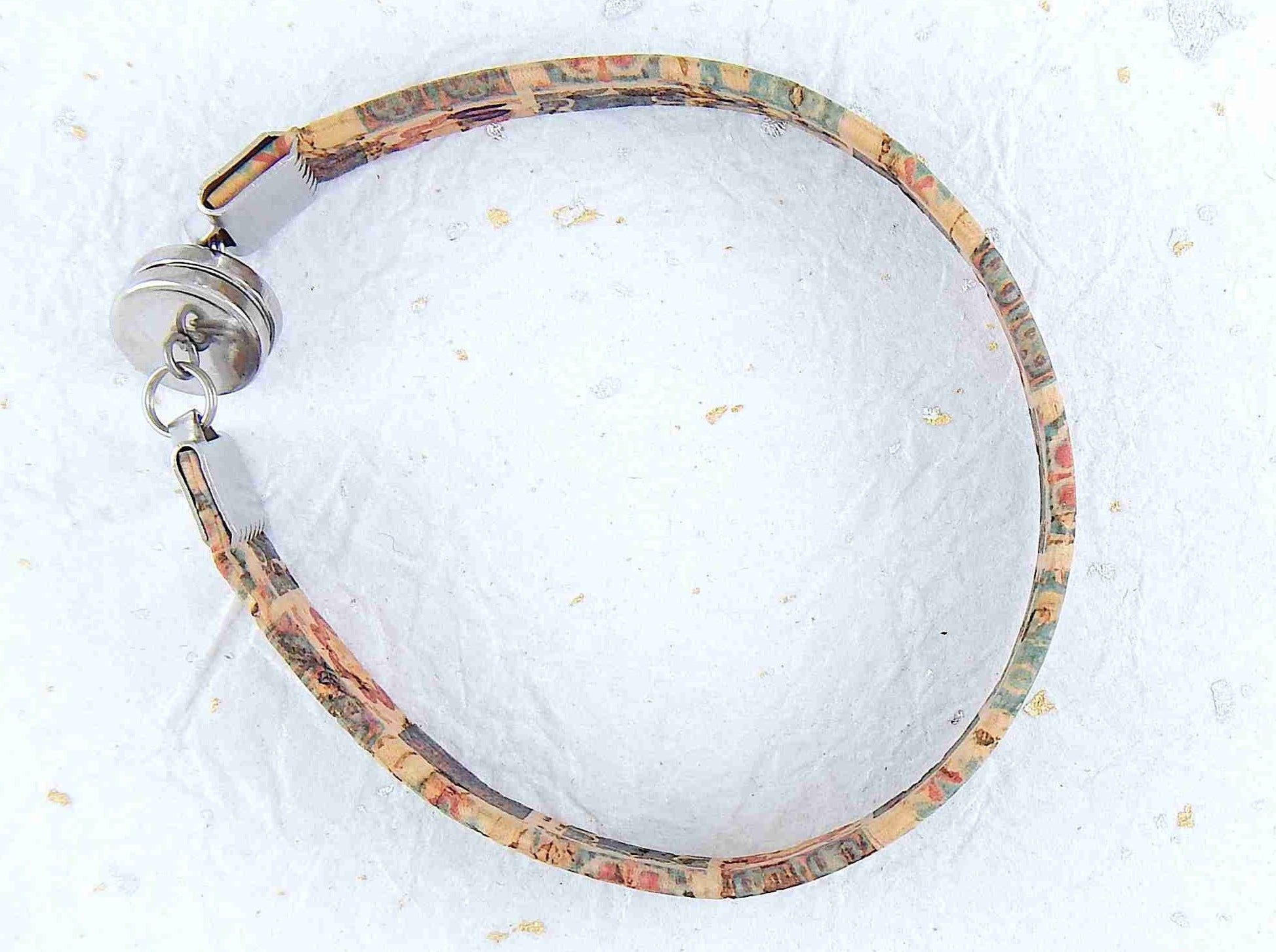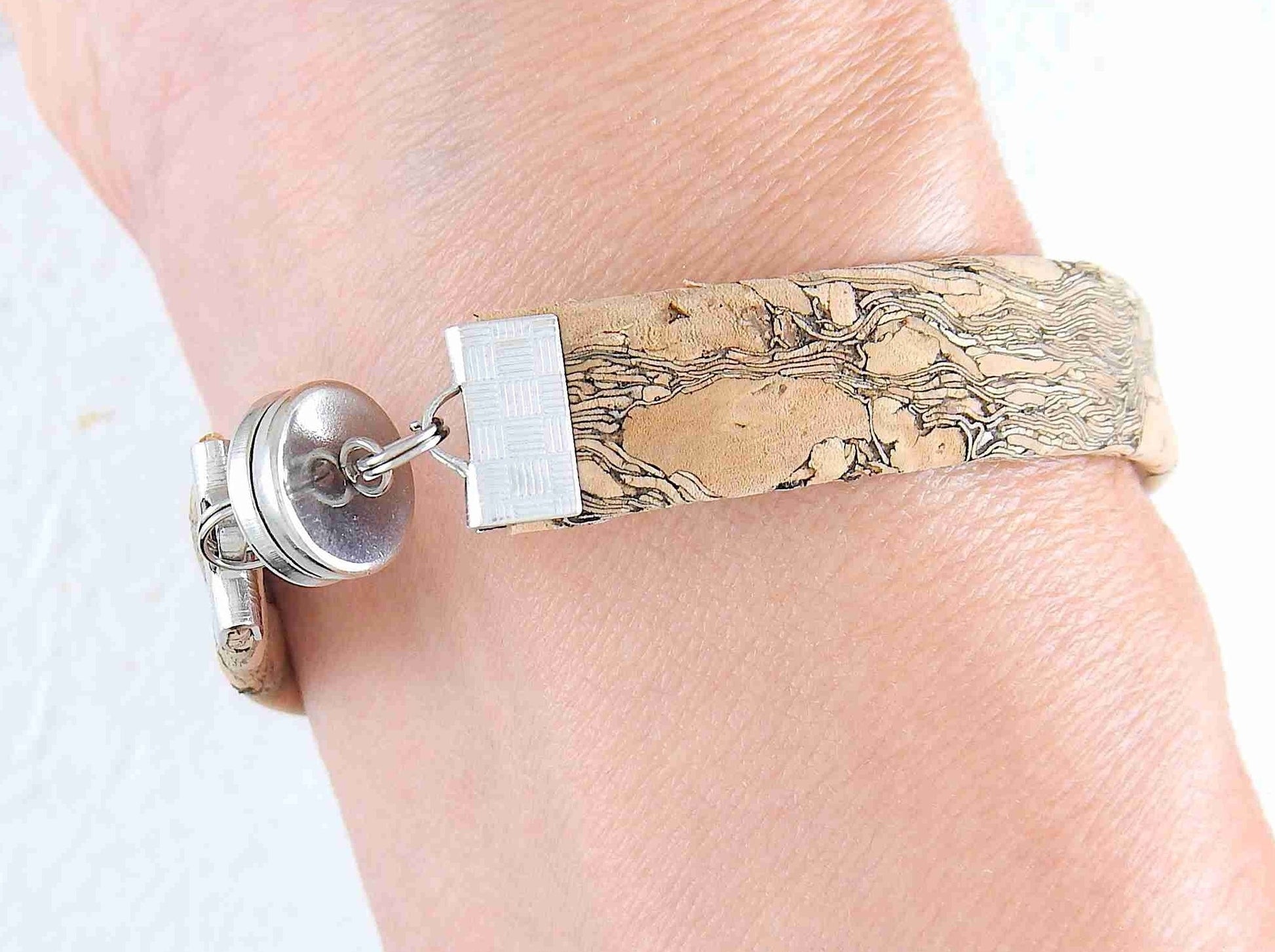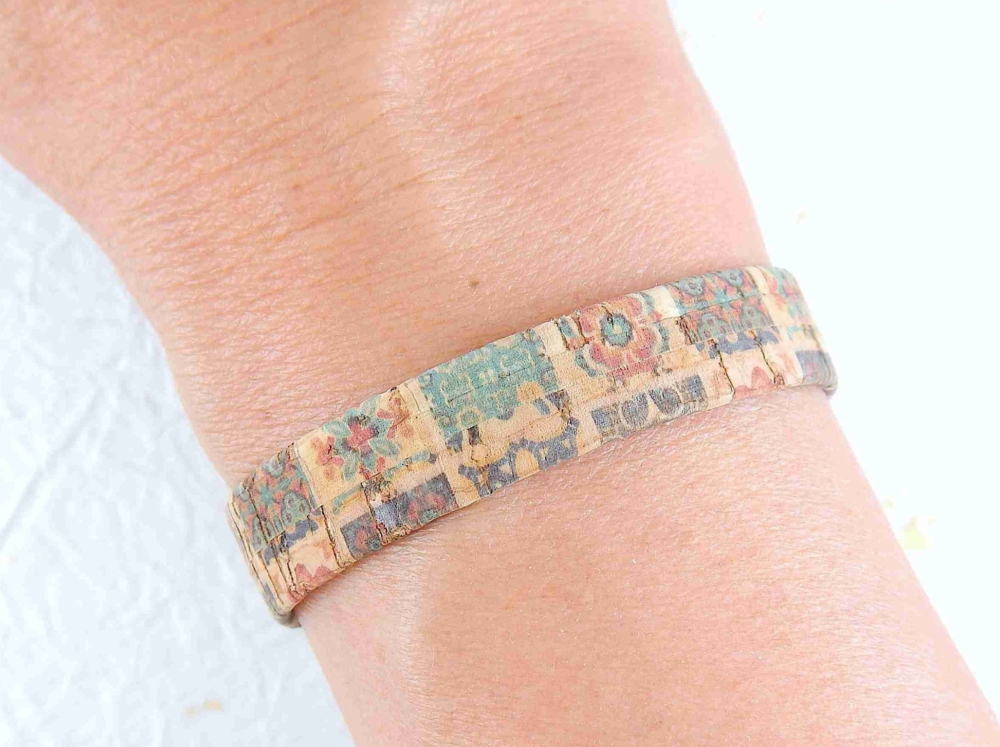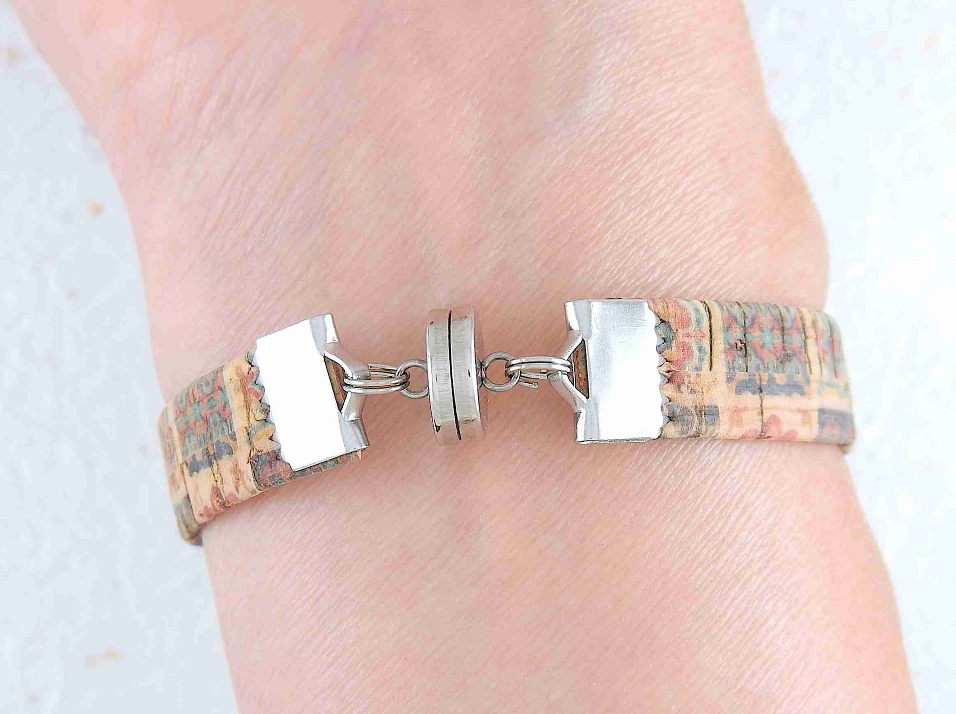 Simple 10 mm flat cork bracelet with magnetic stainless steel clasp in 2 patterns (coloured tiles on beige background, marbled gray-beige)