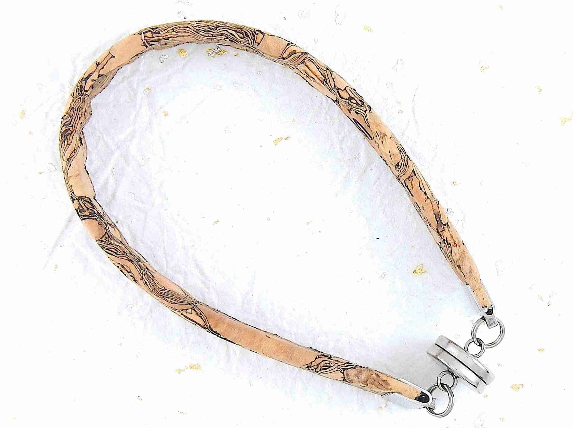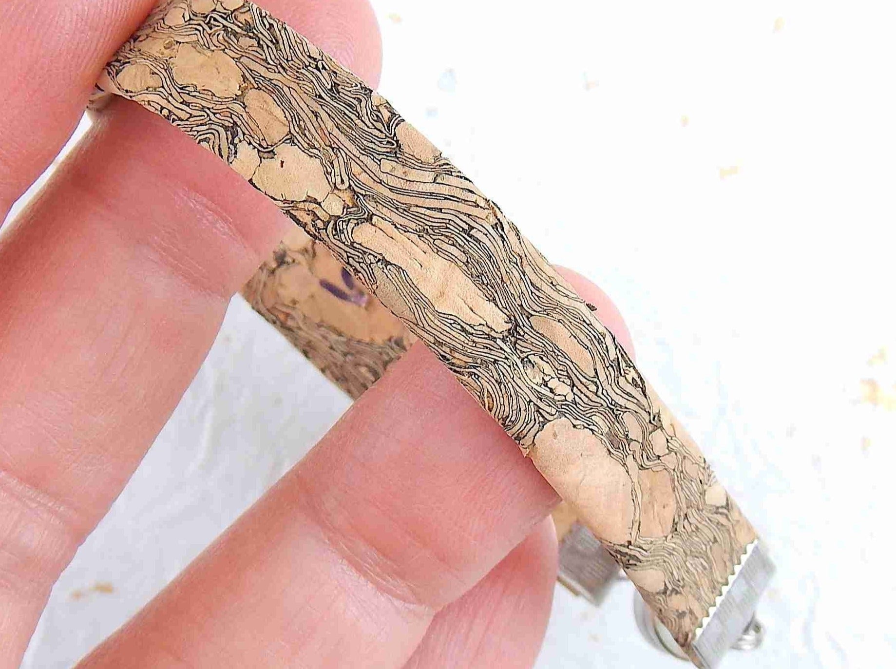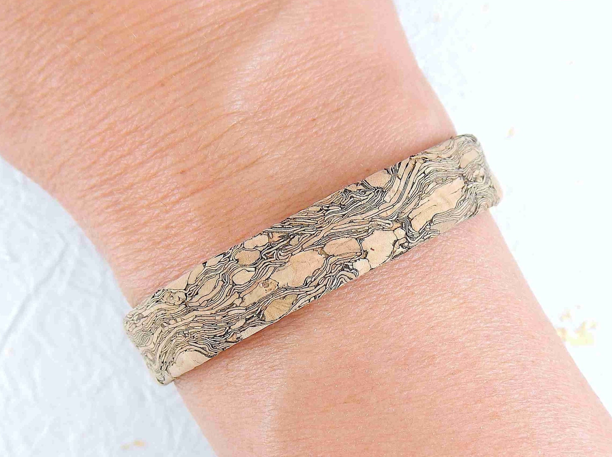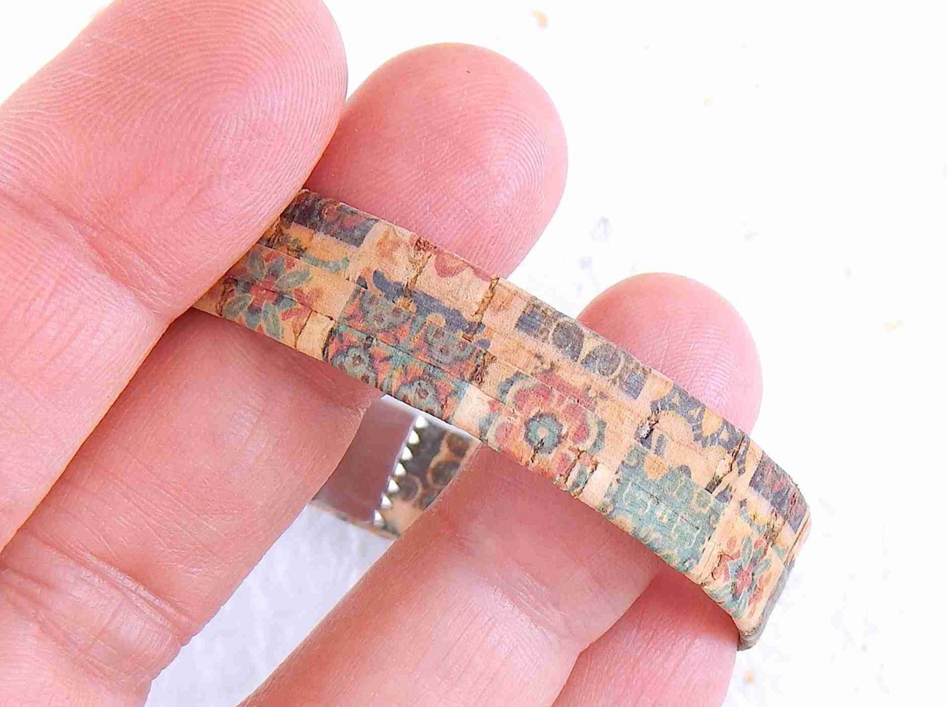 Simple 10 mm flat cork bracelet with magnetic stainless steel clasp in 2 patterns (coloured tiles on beige background, marbled gray-beige)