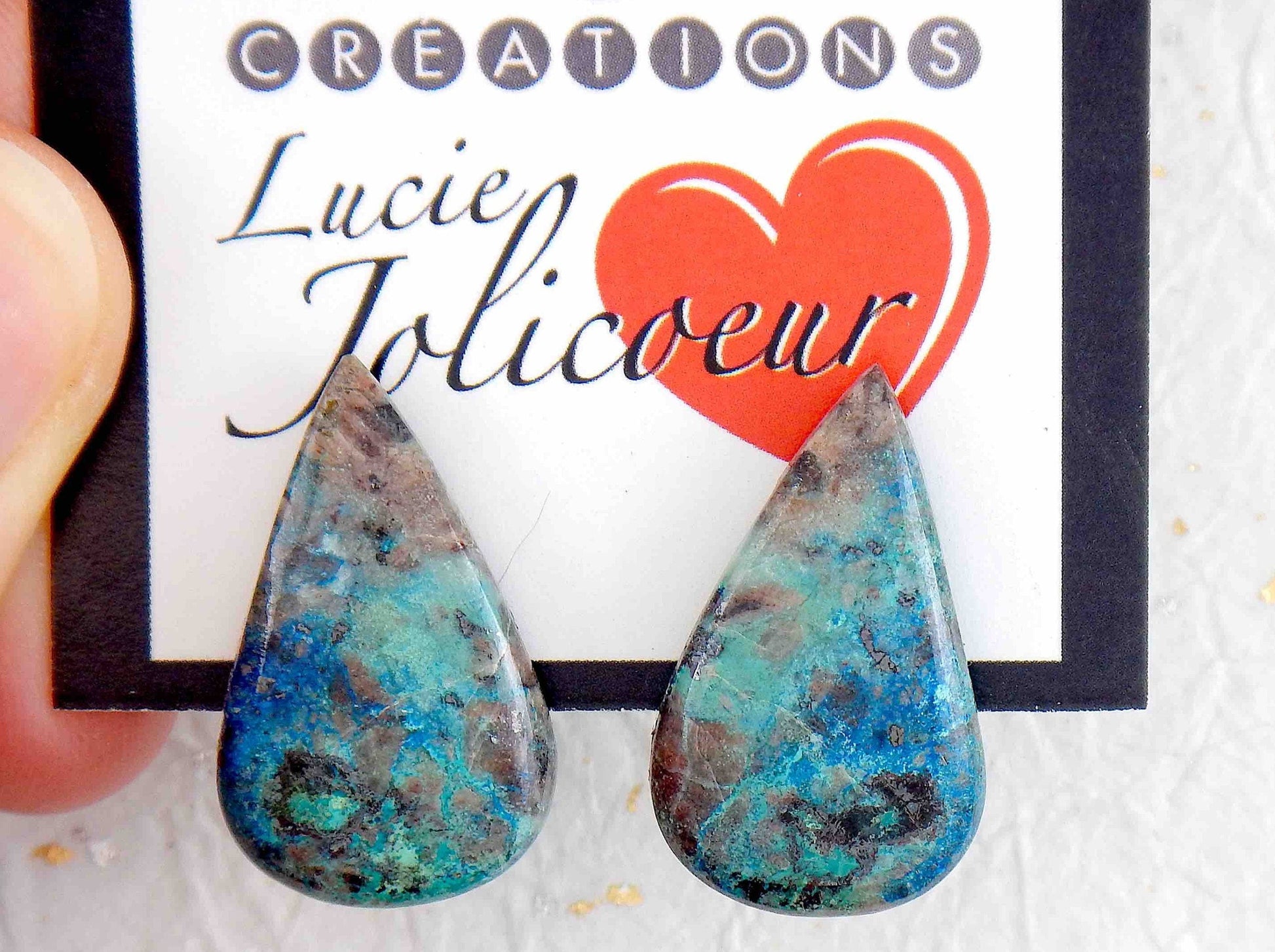 Stud earrings with large chrysocolla stone drops marbled in green-blue-black-grey, stainless steel posts
