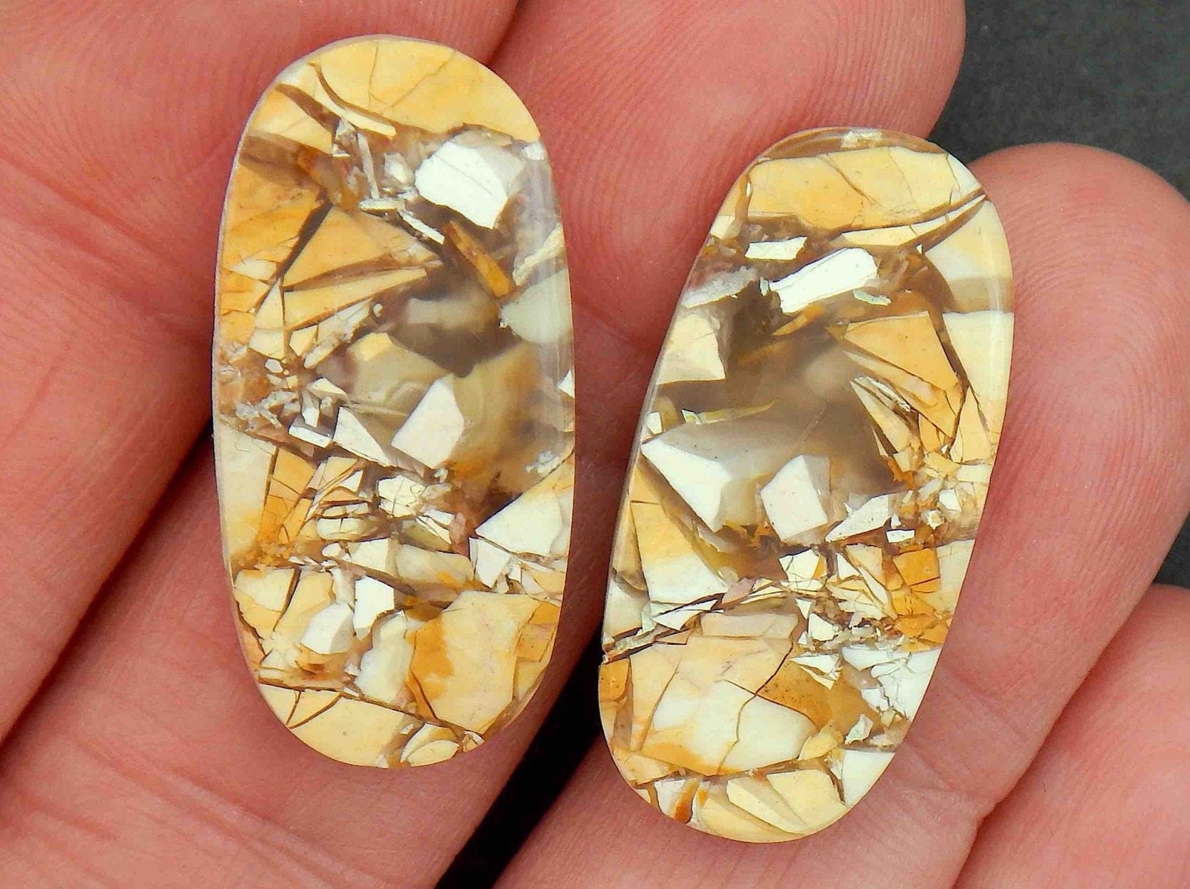 Stud earrings with large mookite jasper ovals, white-caramel-orange pattern, stainless steel posts