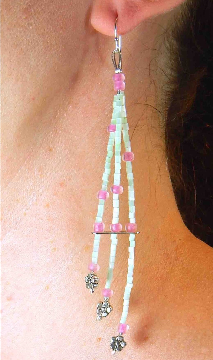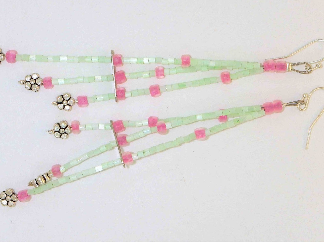 Very long earrings with 3 delicate strands in mint green and candy pink, silver coloured flowers, metal hooks